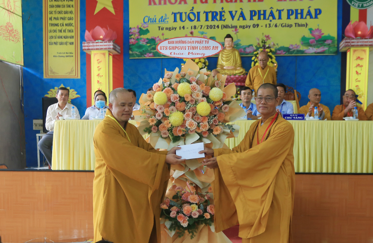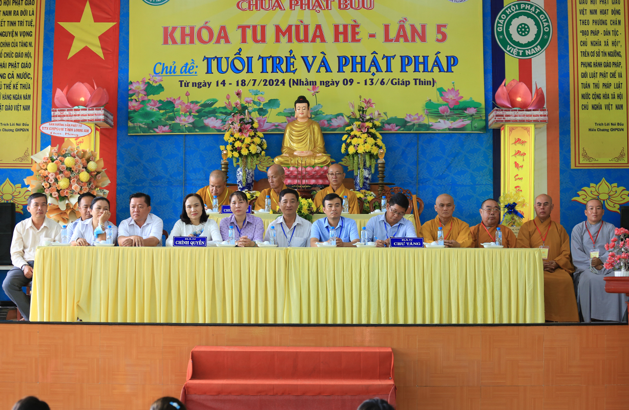 Buổi lễ được cung đón sự quang lâm chứng minh của Hòa thượng Thích Quảng Ý – Chứng minh BTS GHPGVN tỉnh Long An, Chứng minh BTS GHPGVN huyện Tân Thạnh, Thượng tọa Thích Quảng Tâm – UV HĐTS, Phó Trưởng Ban Thường trực BTS GHPGVN tỉnh Long An, Thượng toạ Thích An Nhựt – Trưởng ban HDPT BTS GHPGVN tỉnh Long An, Thượng tọa Thích Lệ Tấn – UV Thường trực BTS GHPGVN tỉnh Long An, Trưởng BTS GHPGVN huyện Tân Thạnh, Trưởng Ban tổ chức khóa tu, Chư tôn đức thường trực BTS GHPGVN huyện Tân Thạnh, Chư tôn đức Ban Tổ chức Khóa tu cùng hơn…… các bạn khóa sinh tham dự.