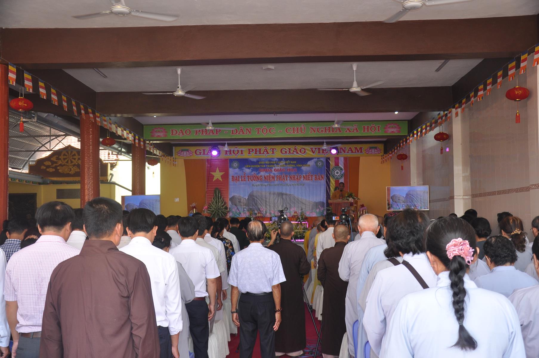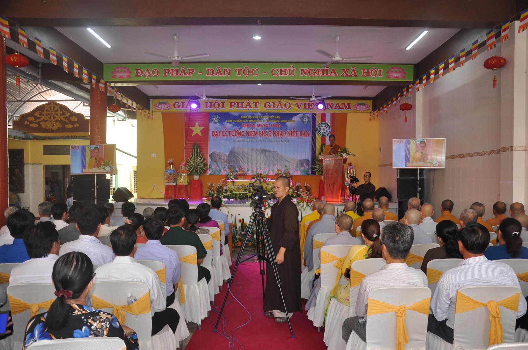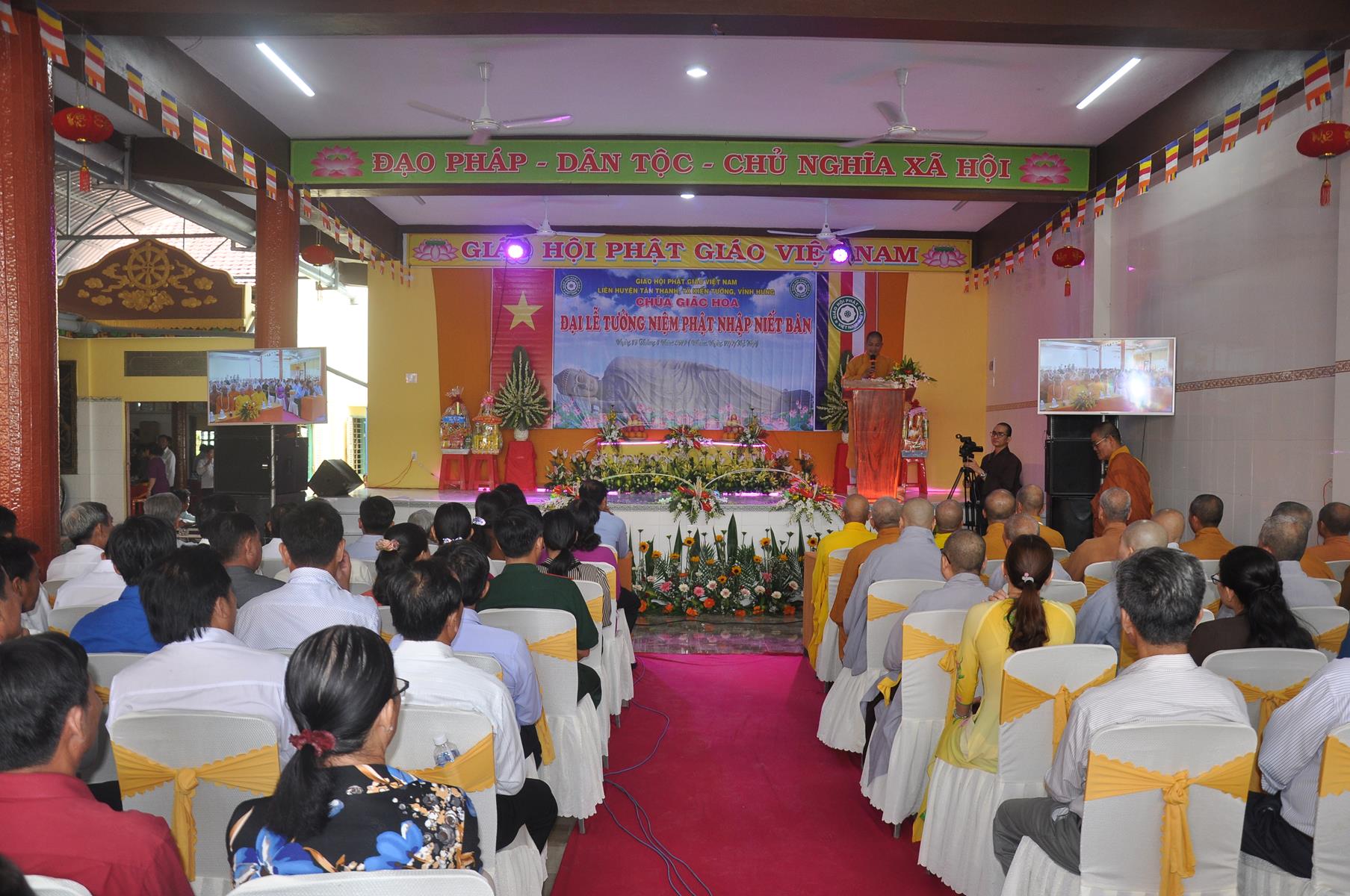 Sau nghi thức niệm Phật cầu gia bị, chào quốc kỳ đạo kỳ, tuyên bố lý do, giới thiệu thành phần tham dự, Thượng tọa Thích Lệ Tấn tuyên đọc diễn văn tưởng niệm Đại lễ Phật nhập Niết bàn, Thượng Tọa nhấn mạnh “Cuộc đời của Đức Phật là một họa phẩm không bao giờ phai tàn, là điểm son trong lịch sử nhân loại. Giáo pháp của Ngài đã mở ra kỷ nguyên mới, kỷ nguyên của nhân bản, nhân văn, bình đẳng, trí tuệ và giải thoát. Ngài là bậc thầy vĩ đại của nhân loại trong suốt 25 thế kỷ qua và mãi về sau. Hướng về kỷ niệm Đại lễ Đức Phật nhập Niết bàn PL 2562. Tất cả chúng ta hãy cùng nương theo lời Phật dạy chuyển hóa mọi khổ đau, gieo hạt giống thiện lành, cùng nhau truyền bá lời dạy của Đức Phật để chánh pháp ngày càng lan rộng và người người được an lạc, giải thoát.”