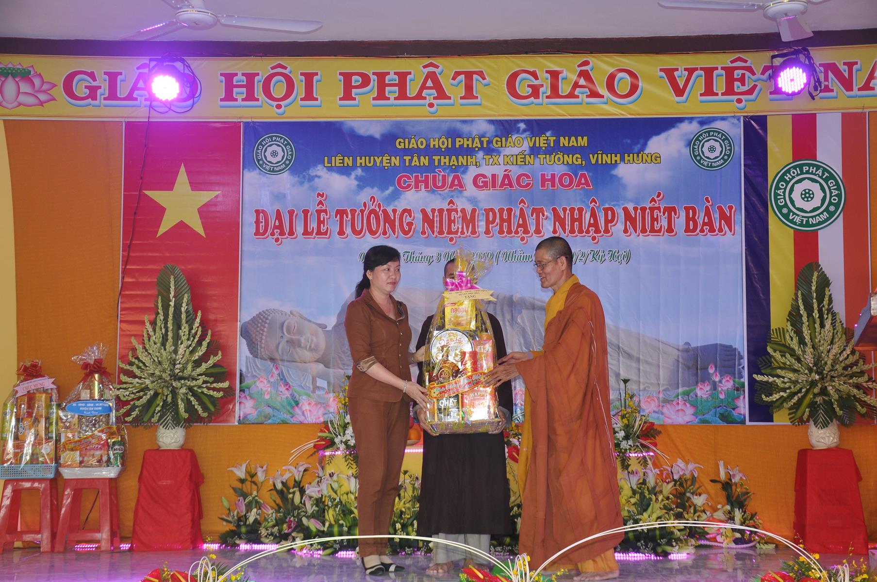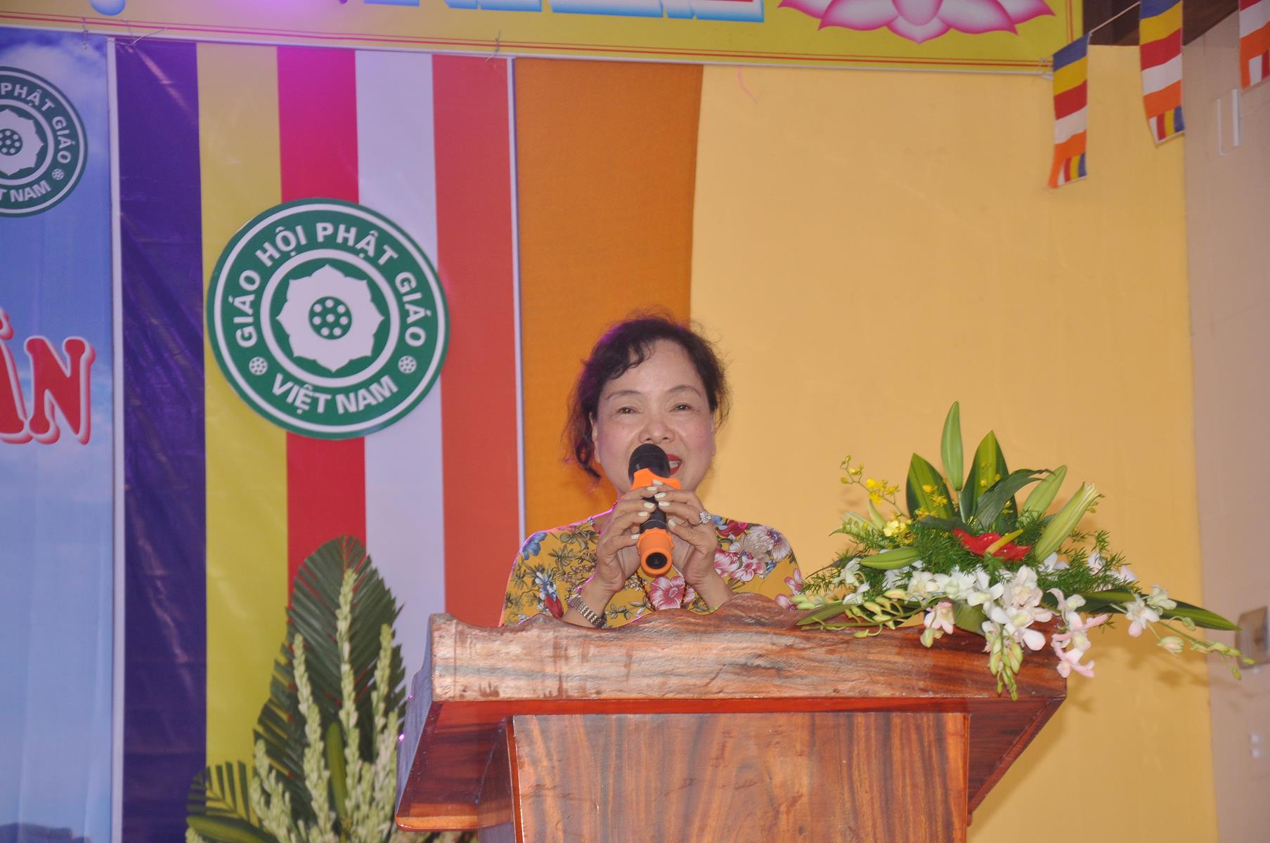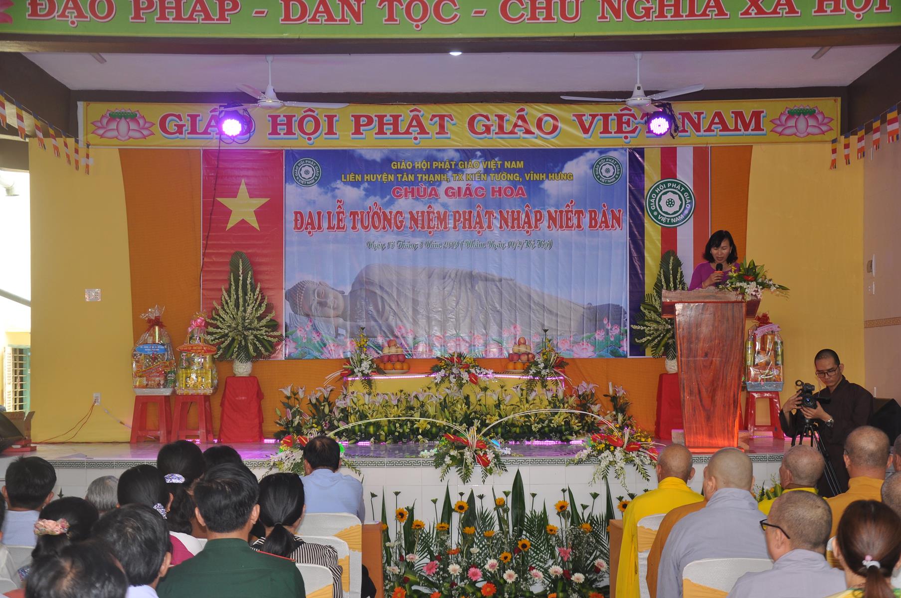 Bà Phó Chủ tịch UBND huyện- Trần Thị Huê đã có bài phát biểu vô cùng sâu sắc và đầy ý nghĩa bày tỏ lòng kính mộ cuộc đời và sự nghiệp của Đức Phật và gởi lời tri ân đến với Thượng Tọa Thích Lệ Tấn, chư Tôn đức Ban trị sự GHPGVN liên huyện Tân Thạnh, TX.Kiến Tường, Vĩnh Hưng cùng quý Phật, mạnh thường quân, các nhà hảo tâm đã luôn quan tâm chiếu cố đến đời sống đồng bào xã nhà.