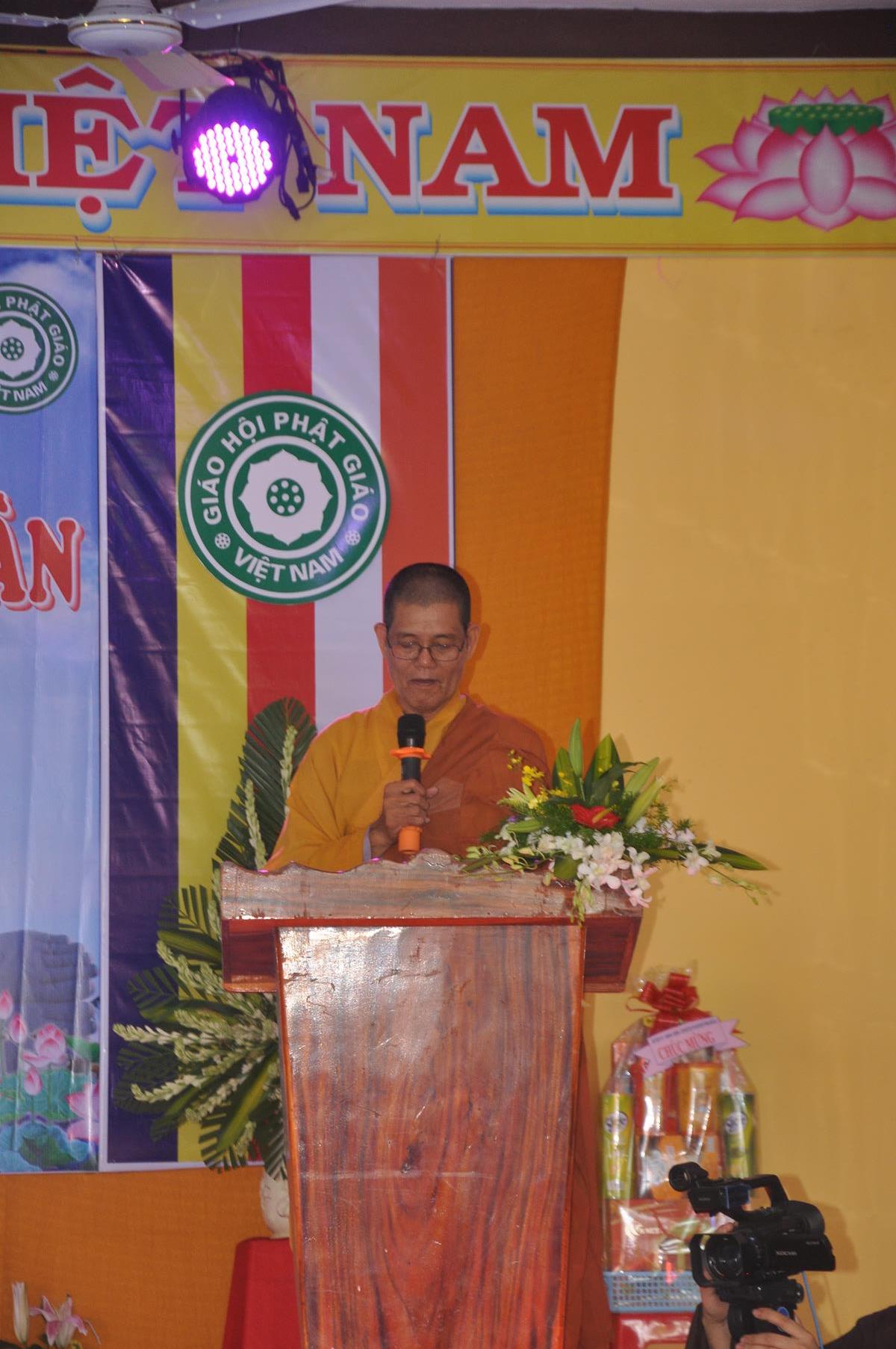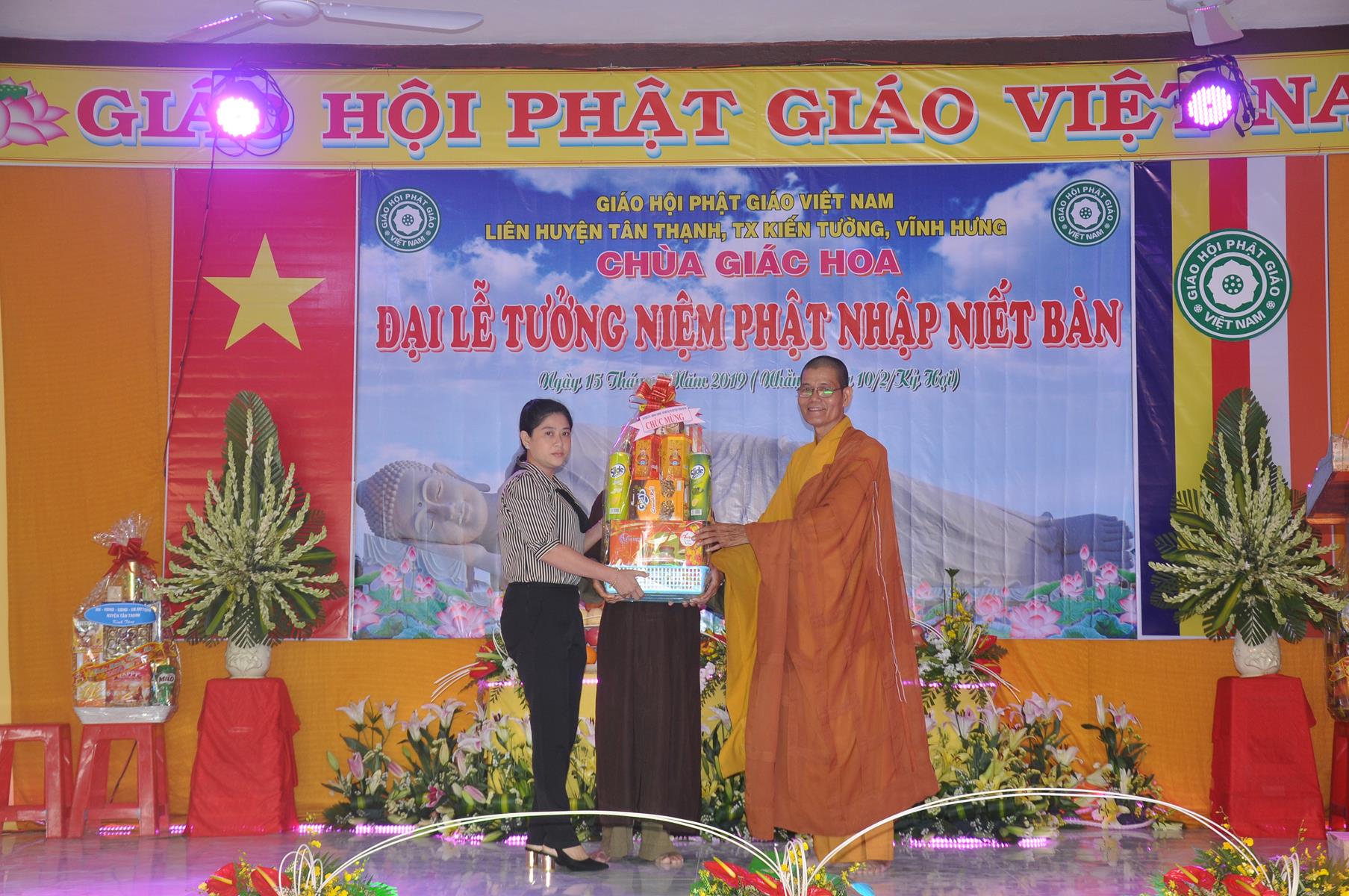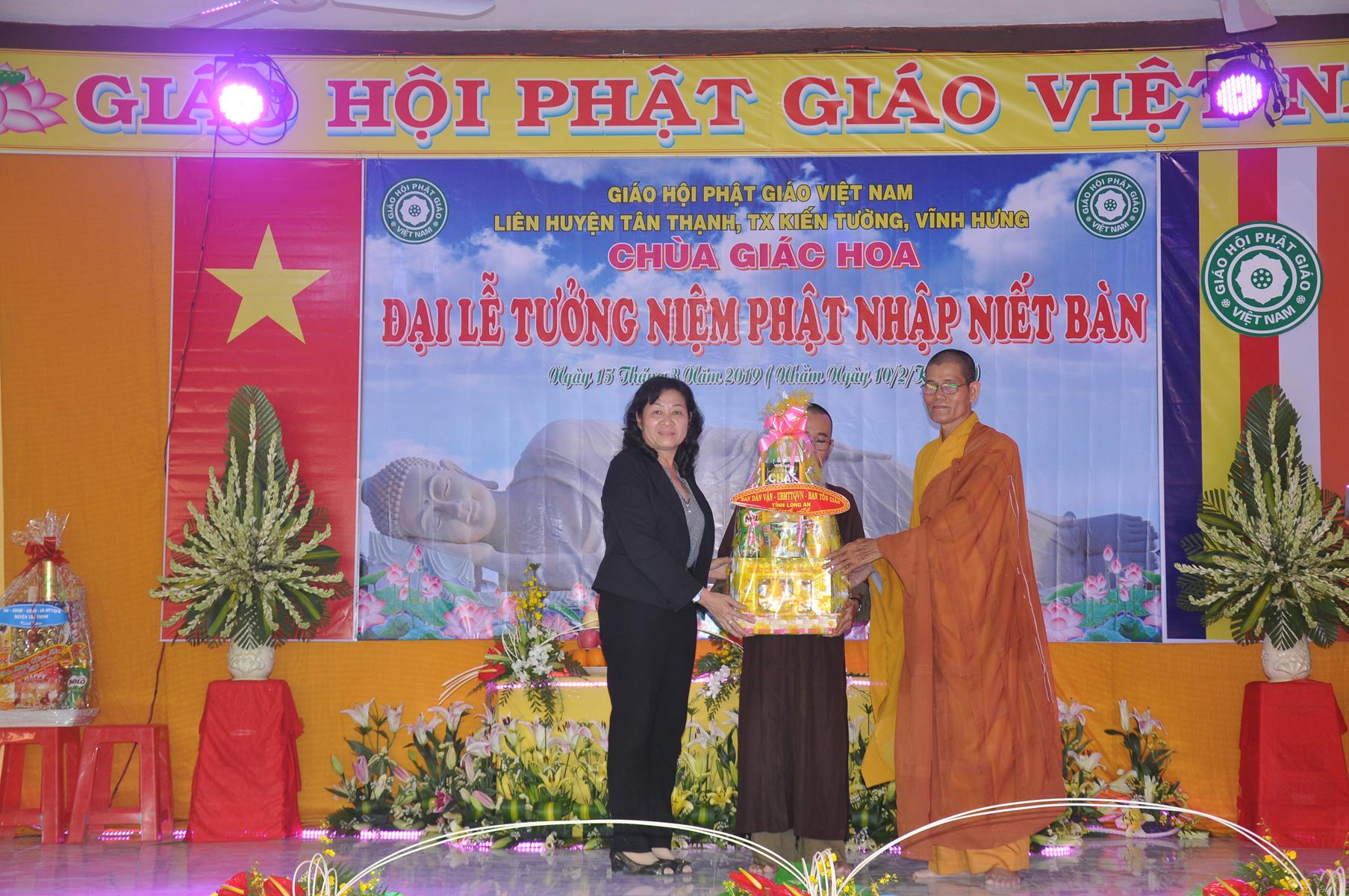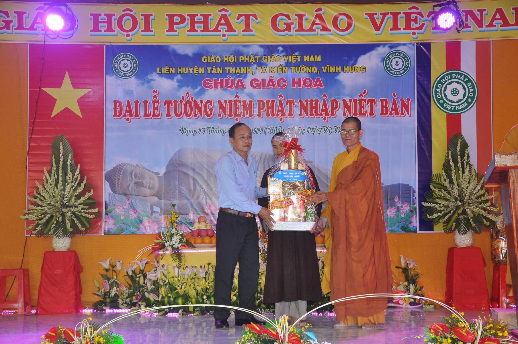 Bà Phó Chủ tịch UBND huyện- Trần Thị Huê đã có bài phát biểu vô cùng sâu sắc và đầy ý nghĩa bày tỏ lòng kính mộ cuộc đời và sự nghiệp của Đức Phật và gởi lời tri ân đến với Thượng Tọa Thích Lệ Tấn, chư Tôn đức Ban trị sự GHPGVN liên huyện Tân Thạnh, TX.Kiến Tường, Vĩnh Hưng cùng quý Phật, mạnh thường quân, các nhà hảo tâm đã luôn quan tâm chiếu cố đến đời sống đồng bào xã nhà.