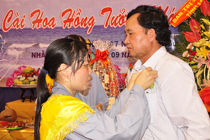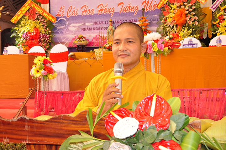 ĐĐ Thích Lệ Duyên, thay mặt Chư Tôn đức Tăng Ni thuyết minh ý nghĩa cài hoa hồng. Đại đức cho biế tVu Lan-Báo hiếu ngày nay không còn là lễ hội riêng của Phật giáo mà đã trở thành lễ truyền thống văn hoá tốt đẹp của dân tộc Việt Nam, là mùa báo ân và đền ân. Nó không những là một di sản riêng của người Phật tử mà là nghĩa vụ thiêng liêng cao cả của tất cả mọi người.