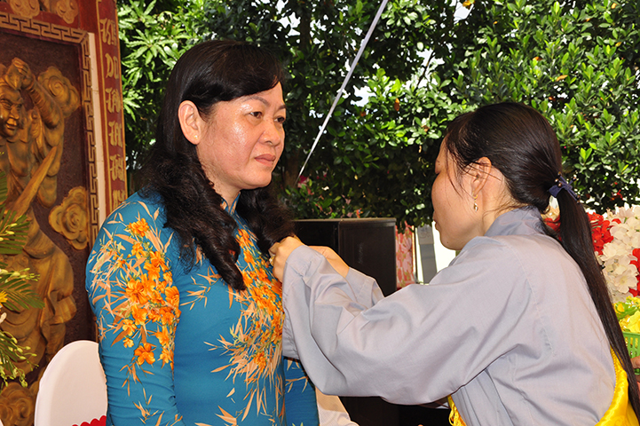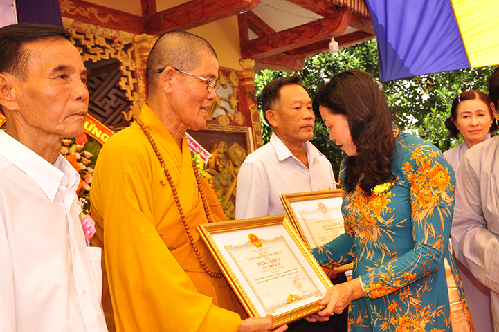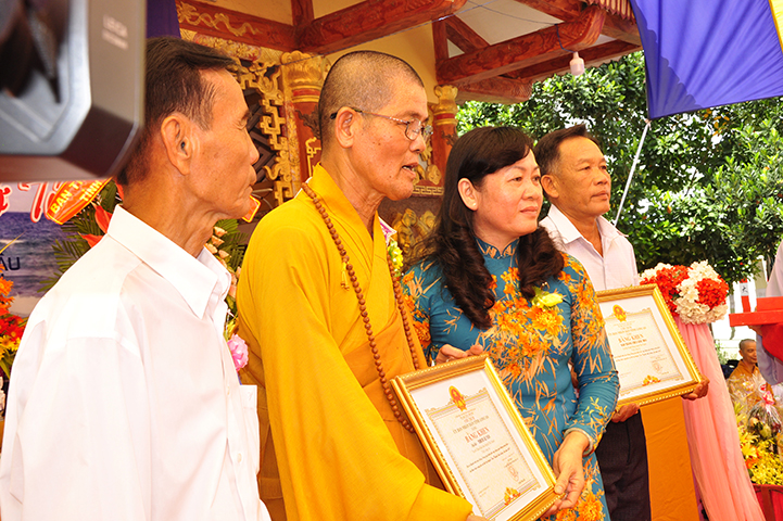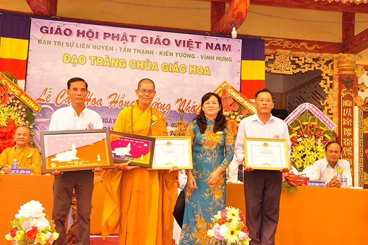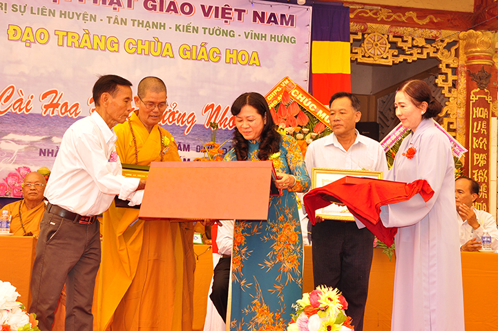 Đồng thời, nhân đại lễ Vu lan bà Phạm Ngọc Tiệp: Phó Chủ tịch UBMTTQVN tỉnh thay mặt lãnh đạo tỉnh tặng bằng khen của Chủ tịch UBND tỉnh Long An cho TT Thích Lệ Tấn và tập thể đạo tràng chùa Giác Hoa.
