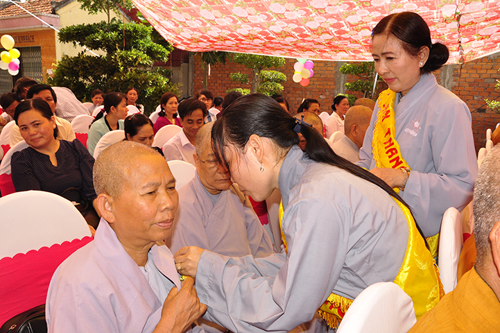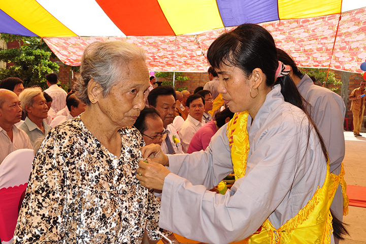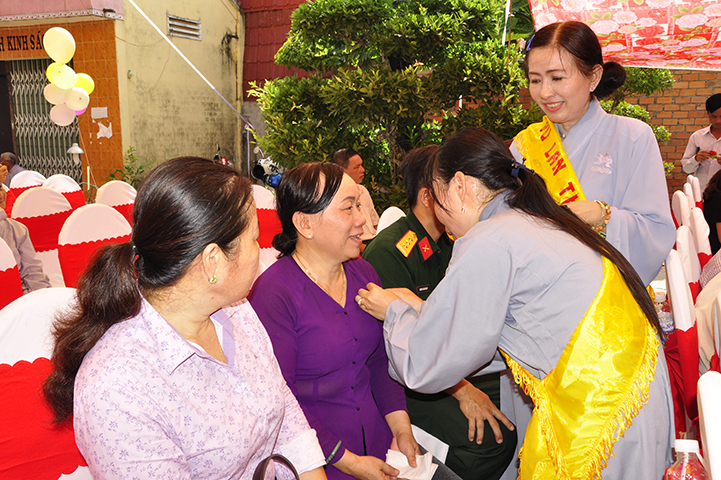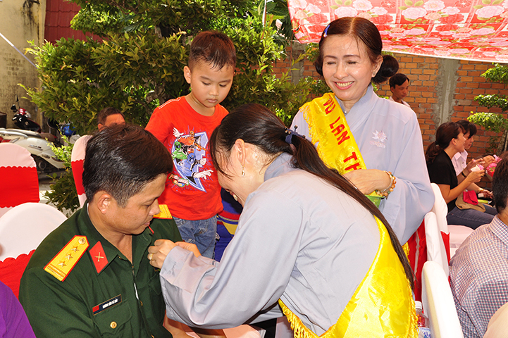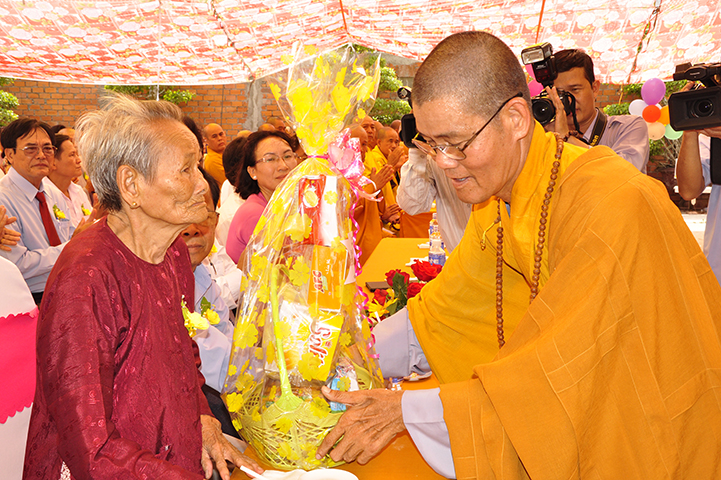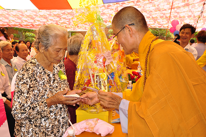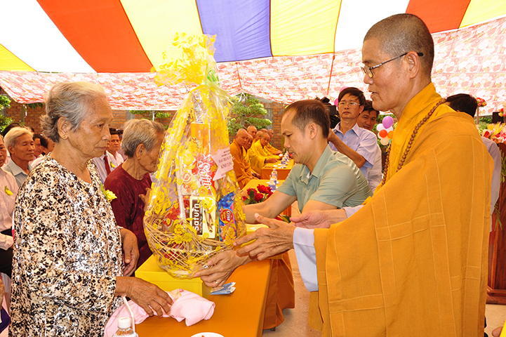 Nhân dịp này, Thượng tọa trụ trì trao tặng 12 phần quà đến Bà mẹ VNAH và gia đình của các bà mẹ VNAH. Đồng thời, trao tặng 100 phần cho đồng bào gặp hoàn cảnh khó khăn.
