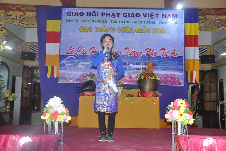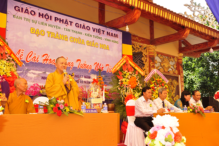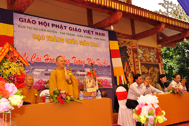 Thay mặt lãnh đạo chánh quyền các cấp, ông Nguyễn Văn Chung: Chủ tịch UBMTTQVN huyện Tân Thạnh phát biểu chúc mừng. Ông nêu lại những tấm gương hiếu hạnh của các bậc tiền nhân cổ kim; trích dẫn lời Phật dạy để nhắn nhủ với mọi người về tinh thần báo hiếu. Báo hiếu ngoài việc phụng dưỡng cha mẹ về vật chất mà còn phải khéo léo khuyên cha mẹ làm lành, lánh dữ, thực hành lời Phật dạy để được hạnh phúc an lạc. Khi cha mẹ qua đời phải hết lòng gieo trồng phước đức, thiết lễ vu lan để hồi hướng cho cha mẹ. Đồng thời, ông ghi nhận công đức của Thượng tọa Thích Lệ Tấn và đạo tràng chùa Giác Hoa. Đặc biệt, ông cũng chúc mừng thượng tọa trụ trì đã được nhận Huân chương lao động hạng ba của Chủ tịch nước vào dịp lễ 30.4.