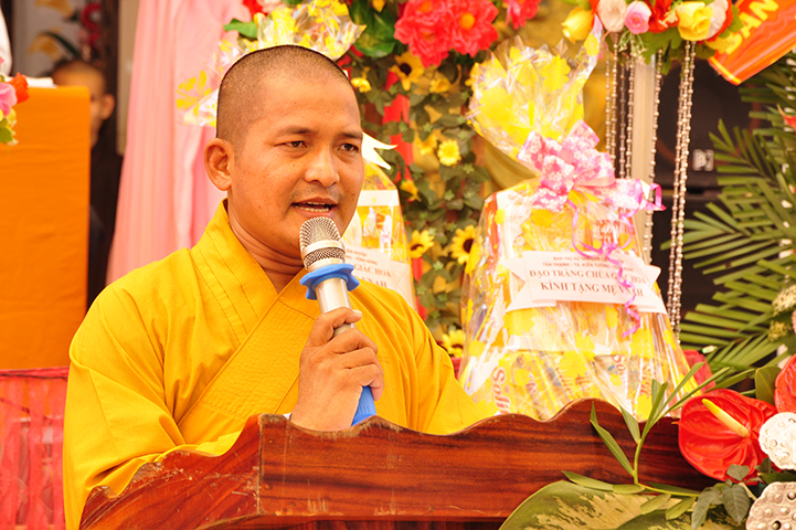 TT Thích Lệ Tấn: Phó Trưởng ban Thường trực Ban Trị sự GHPGVN liên huyện Tân Thạnh, Tx Kiến Tường, Vĩnh Hưng, trụ trì chùa Giác Hoa phát biểu cảm tạ và cúng dường dâng pháp y.