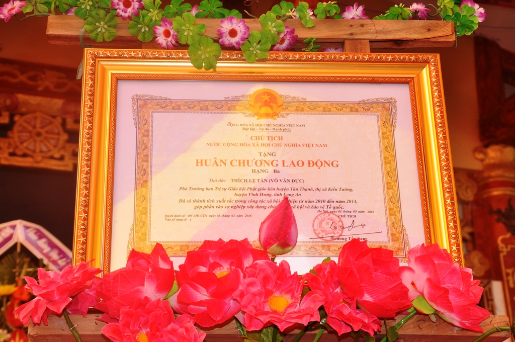 Đồng thời, Hòa thượng cũng tán dương và ghi nhận công đức của TT Thích Lệ Tấn, TT Thích Quảng Tâm đã vinh dự được Chủ tịch nước CHXHCNVN trao tặng Huân chương lao động hạng ba. Đây là lần đầu tiên Phật giáo tỉnh nhà nhận được vinh dự ấy. Hòa thượng cũng khuyến khích Tăng Ni Phật tử luôn thể hiện tinh thần hộ quốc an dân, đồng hành cùng dân tộc, góp phần cùng chánh quyền các cấp xây dựng quê hương đất nước ngày càng văn minh, giàu đẹp.