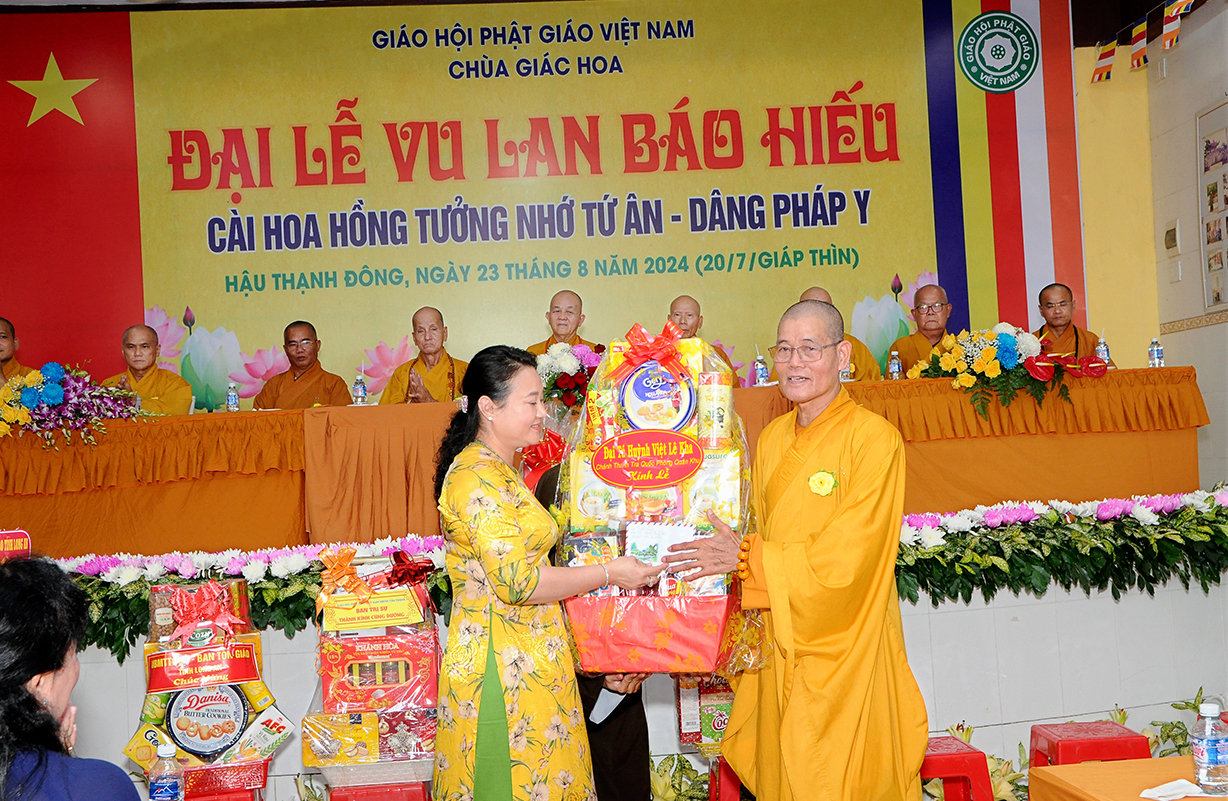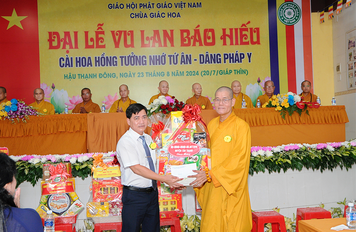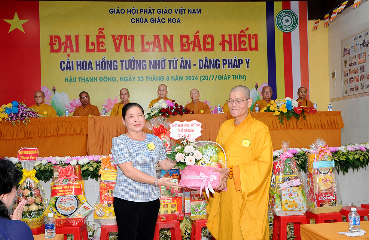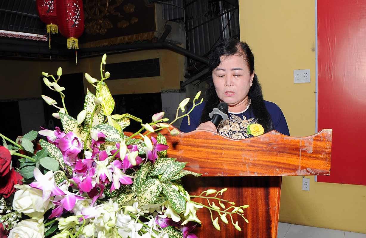 Bà Nguyễn Thị Trúc – Phó BT TT Huyện uỷ Tân Thạnh thay mặt lãnh đạo chính quyền phát biểu. Bà nhấn mạnh, Đại lễ Vu Lan không chỉ là đại lễ quan trọng trong Phật giáo, mà còn là dịp hướng người dân trở về văn hoá truyền thống, đạo lý uống nước nhớ nguồn của cội nguồn cha ông. Truyền thống báo ân Tứ trọng ân là thể hiện đức hạnh của mỗi con người đối với những thâm ân của mình. Bà tán dương Phật giáo huyện Tân Thạnh luôn truyền đạt ân quốc gia đến mỗi tín đồ Phật tử để hiểu và biết ơn, quý trọng và kế thừa và phát huy truyền thống yêu thương đồng bào, phát huy sức mạnh đại đoàn kết toàn dân tộc. Bà mong rằng BTS GHPGVN huyện Tân Thạnh sẽ tiếp tục đồng hành cùng lãnh đạo chính quyền huyện nhà đóng góp cho sự phát triển giàu mạnh, thi đua yêu nước của quê hương.