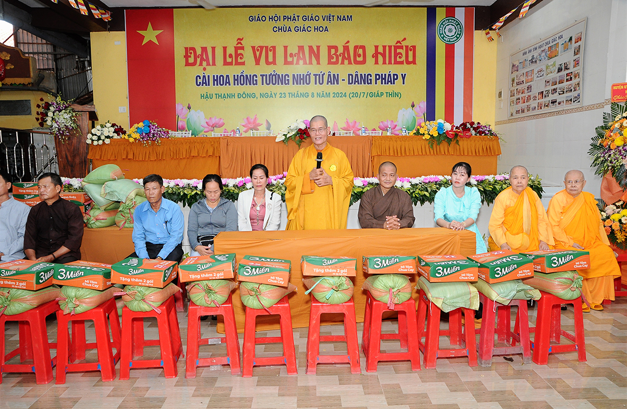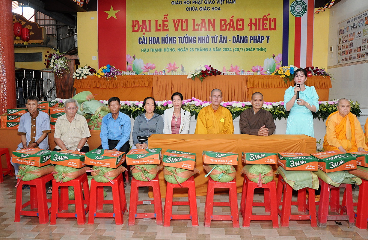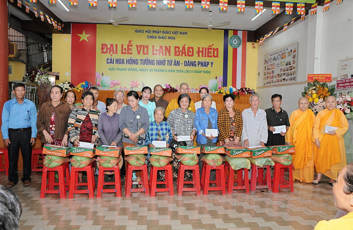 Sau Đại lễ, chùa Giác Hoa trao tặng 100 phần quà cho học sinh và đồng bào gặp hoàn cảnh khó khăn. Mỗi phần quà trị giá 350.000 đồng.