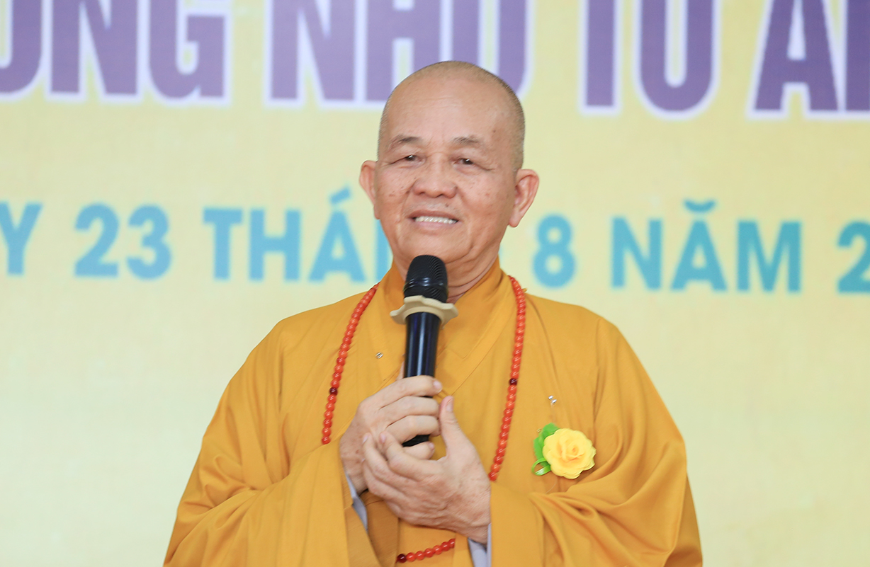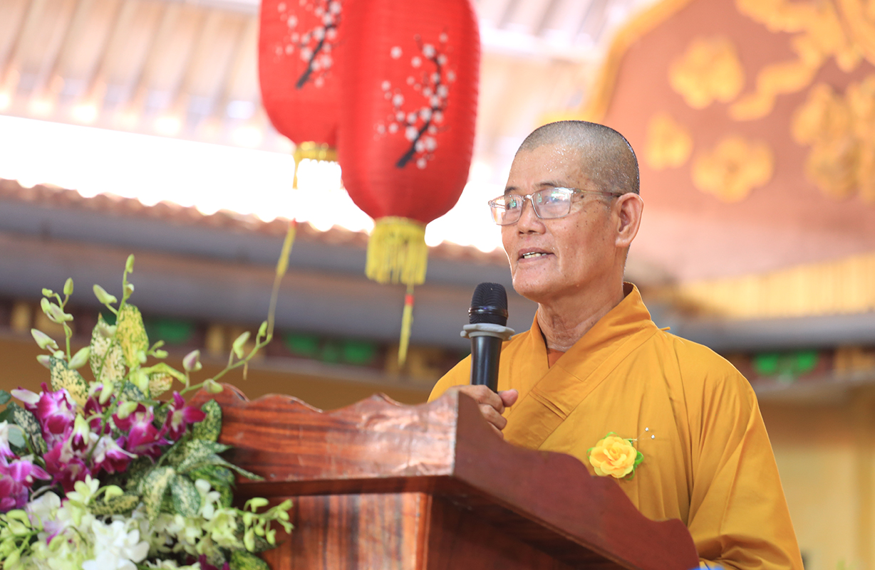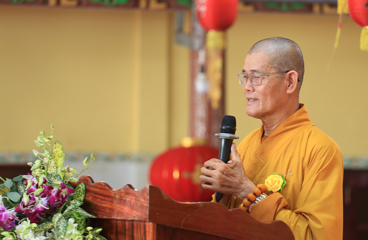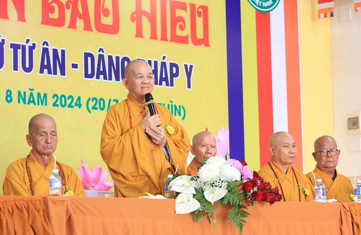 HT Thích Minh Thiện đãi lao Chư Tôn đức chứng minh ban lời đạo từ. Hoà thượng ôn lại truyền thống An cư kiết hạ và mùa Vu Lan hiếu hạnh như đã nêu trong Thông bạch của Đức Phó Pháp chủ, Chủ tịch HĐTS – TLHT. Thích Thiện Nhơn. Bên cạnh đó, Hoà thượng cũng đã tán dương công đức của BTS GHPGVN huyện Tân Thạnh đã đồng hành mật thiết với chính quyền địa phương huyện trong công tác an sinh xã hội, đặc biệt là xây dựng cầu đường nông thôn, giúp người dân lưu thông thuận tiện. Đồng thời, Hoà thượng cũng đã nhắc về ý nghĩa ngày Vu Lan, nay đã hoà cùng tinh thần đạo hiếu của dân tộc trở thành ngày lễ truyền thống văn hoá của dân tộc Việt Nam. Hoà thượng khuyến tấn Quý Phật tử cần siêng làm các việc thiện, tránh làm các việc ác để đem công đức hướng về Tứ trọng ân cao cả. Cuối lời, Hoà thượng gửi lời chúc an lạc đến toàn thể đạo tràng.