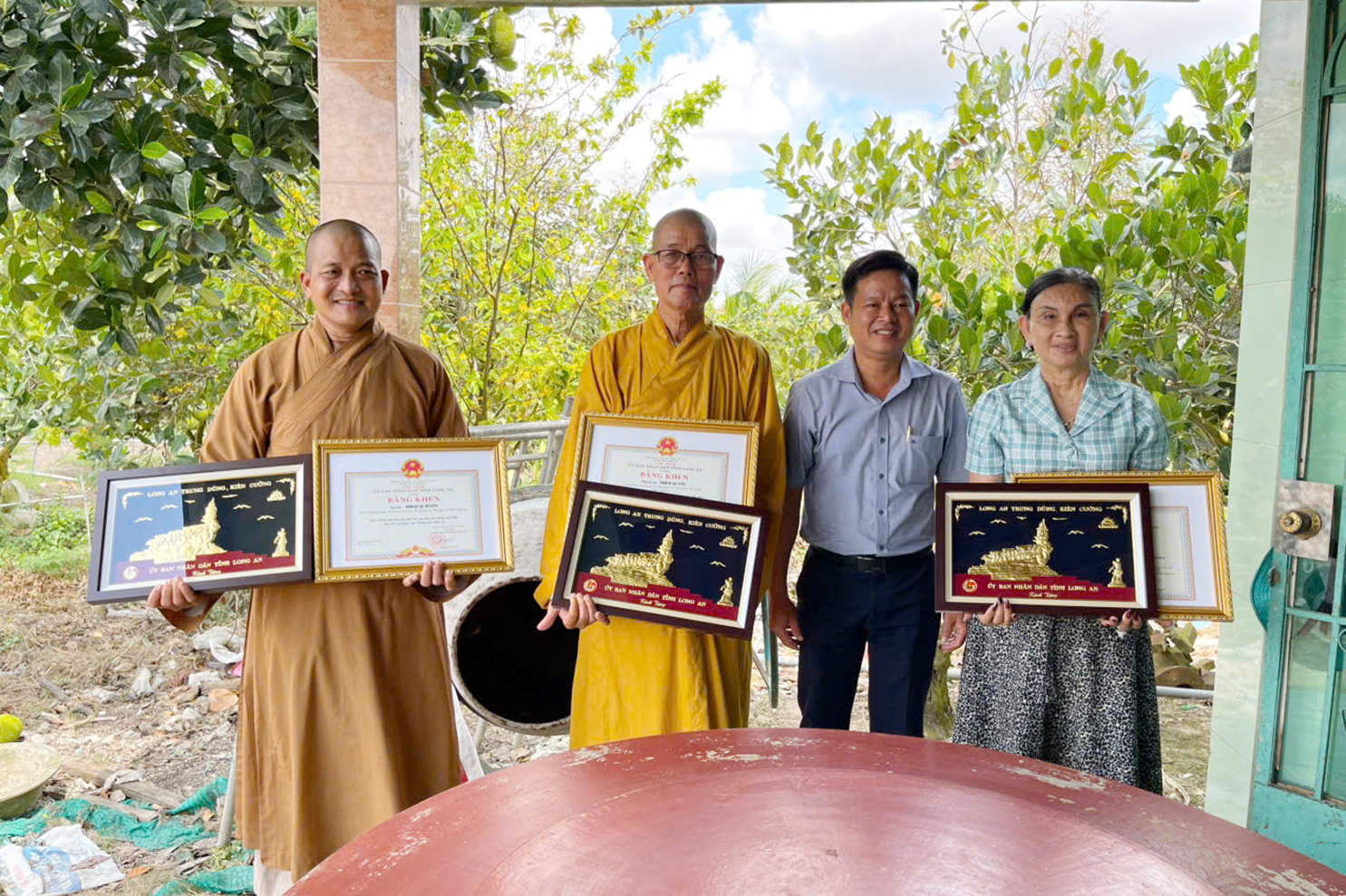 Tại buổi lễ, ông Lê Văn Nhãn trao tặng Bằng khen của Ủy ban Nhân dân tỉnh Long An đến Thượng tọa Thích Lệ Tấn, Đại đức Thích Quảng Lâm, Đại đức Thích Lệ Duyên, bà Nguyễn Ngọc Mai. Ông Nguyễn Xuân Tươi trao tặng giấy khen của Ủy ban Nhân dân xã Nhơn Ninh đến các đơn vị tài trợ.