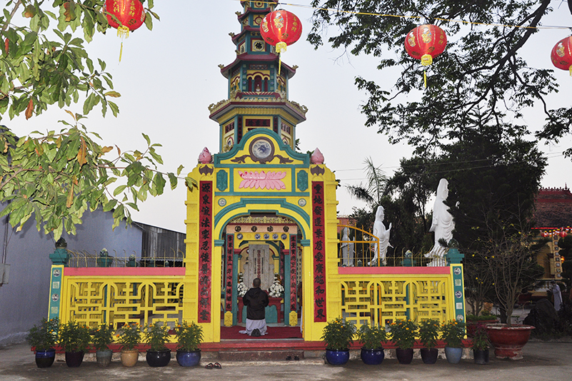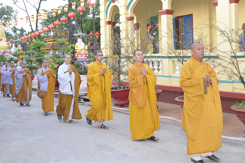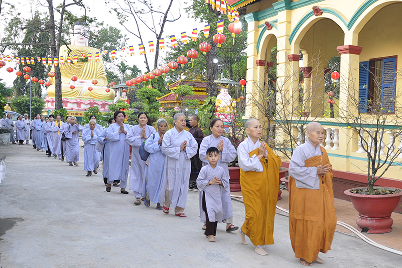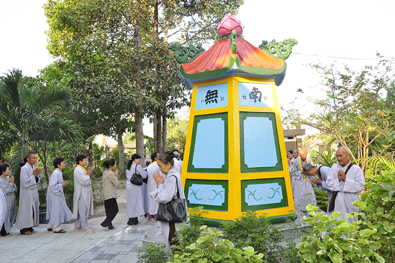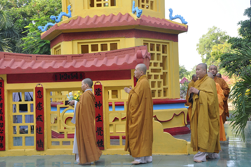 Đối trước bảo tháp uy nghi, hương trầm nghi ngút, Tăng Ni, Phật tử thành kính đảnh lễ hữu nhiễu bảo tháp, nơi lưu giữ kim thân Tổ sư.