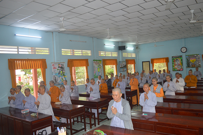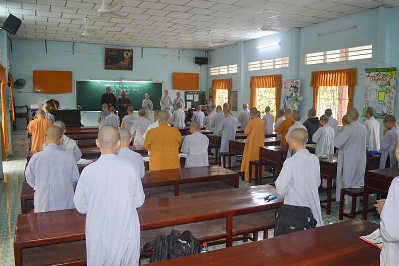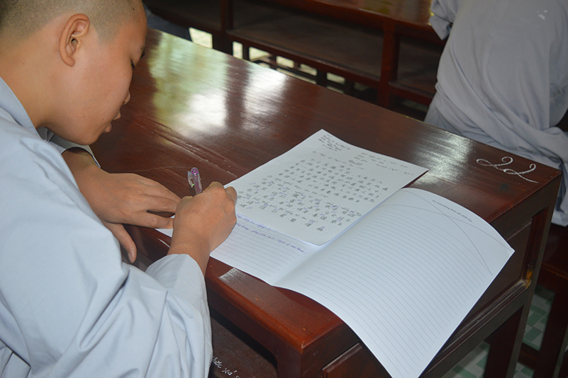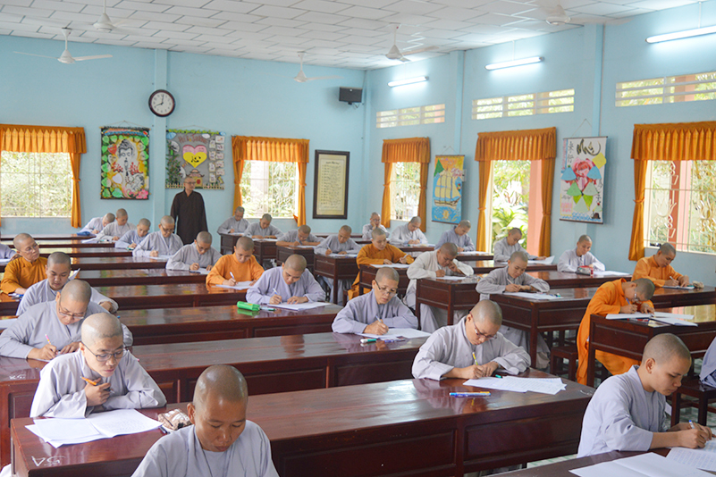 Toàn thể Tăng Ni sinh khoá VI trường Trung Cấp Phật học Long An bước vào ngày thi đầu tiên của học kỳ I, năm thứ 3 với môn thi Hán văn của Đạo hữu Minh Thông. Được sự chỉ dạy của HT Thích Minh Thiện- Hiệu trưởng Trường Trung cấp Phật học Long An- Đại đức Thích Lệ Trí – Hiệu phó trường Trung cấp Phật học Long An và Ni sư Thích Nữ Tuệ Đăng- Hiệu phó Trường Trung cấp Phật học Long An, cơ sở 2, lớp Ni có vài lời sách tấn Ni sinh trước khi đặt bút làm bài thi đầu tiên.  Ban Giám hiệu đã khích lệ và ân cần dặn dò các Tăng Ni sinh làm bài tốt. Tăng Ni sinh viết ra những suy nghĩ của mình sau khi tiếp thu và chắc lọc những điều đã học và đọc được từ sách vở.