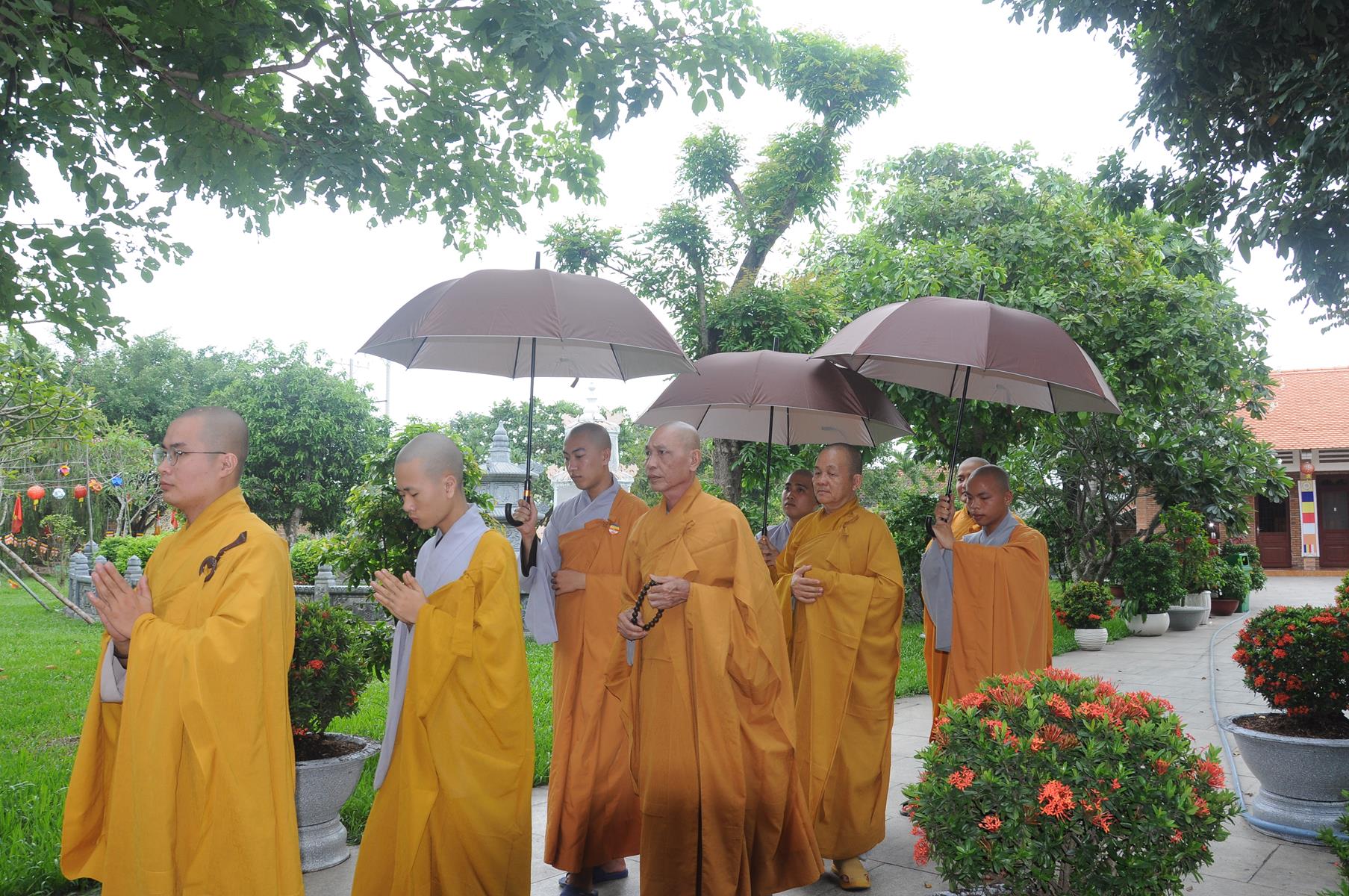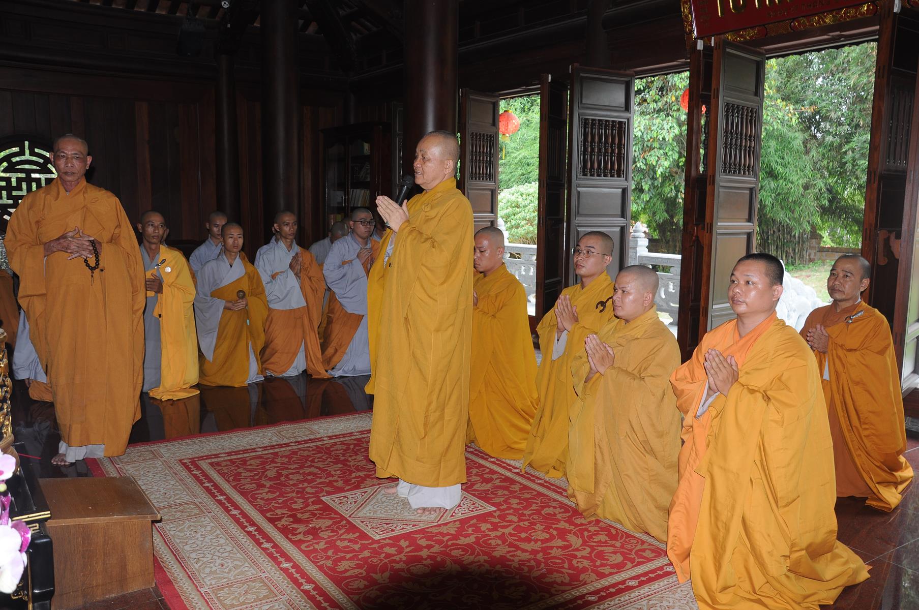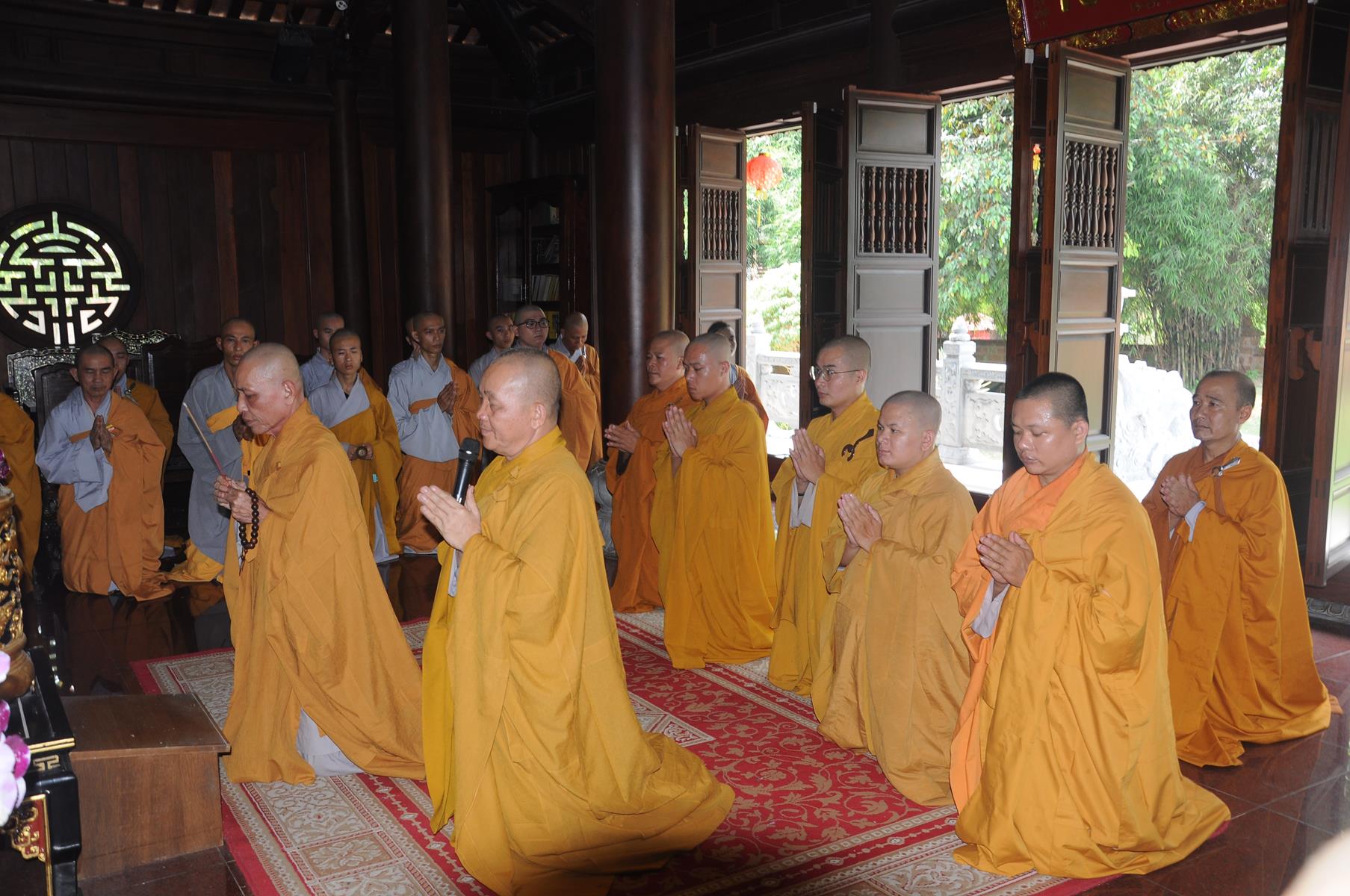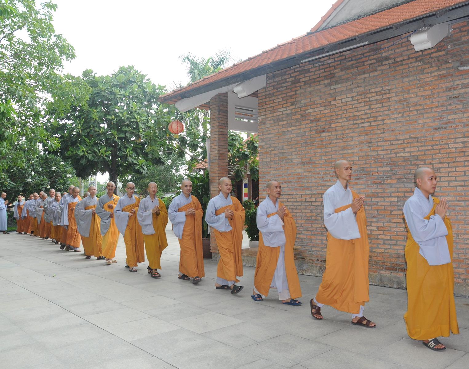 Sau khi Ban Chủ nhiệm hướng dẫn các tăng sinh cung thỉnh nhị vị hòa thượng quang lâm nơi Tổ đường niêm hương bạch Tổ, bạch Phật toàn thể đạo tràng thực hiện nghi thức kiết giới an cư.