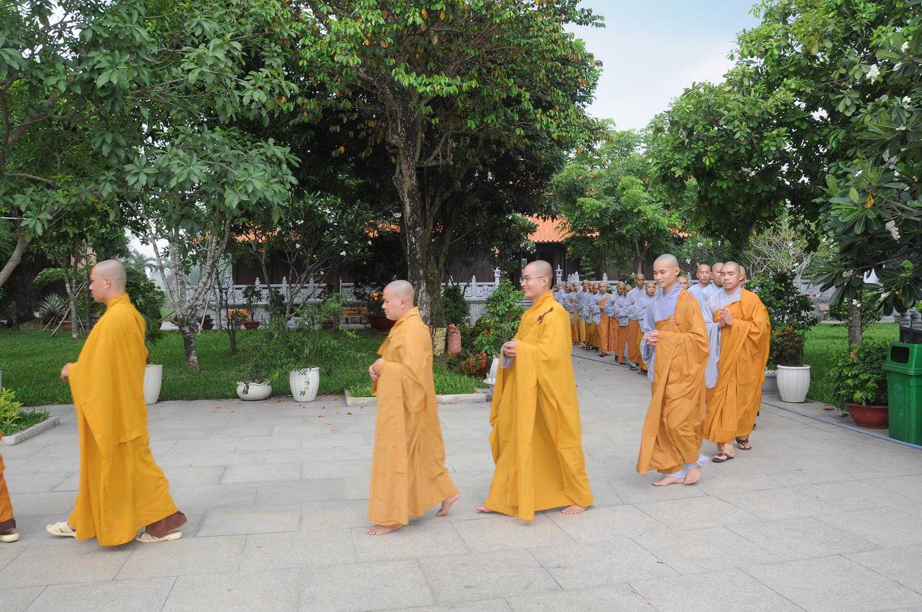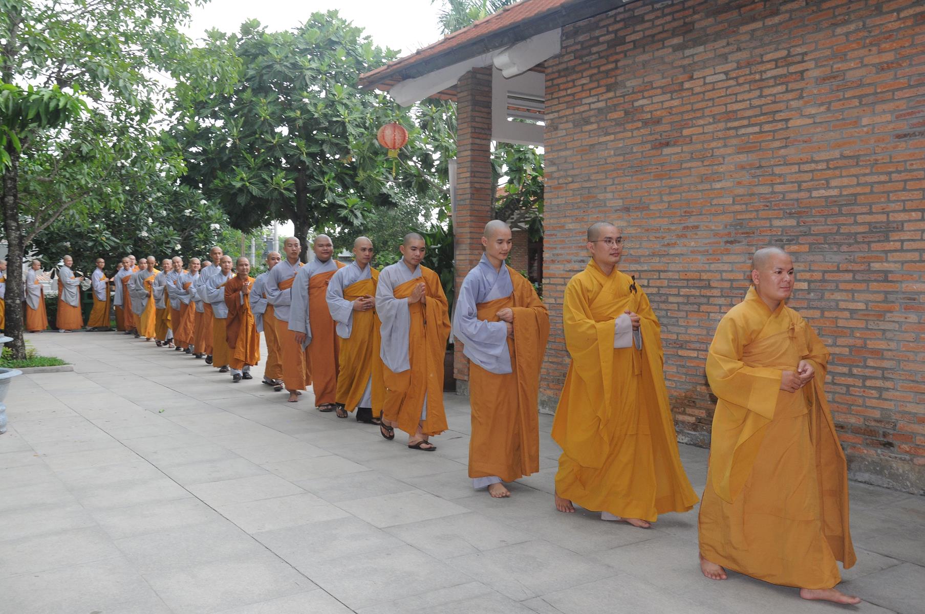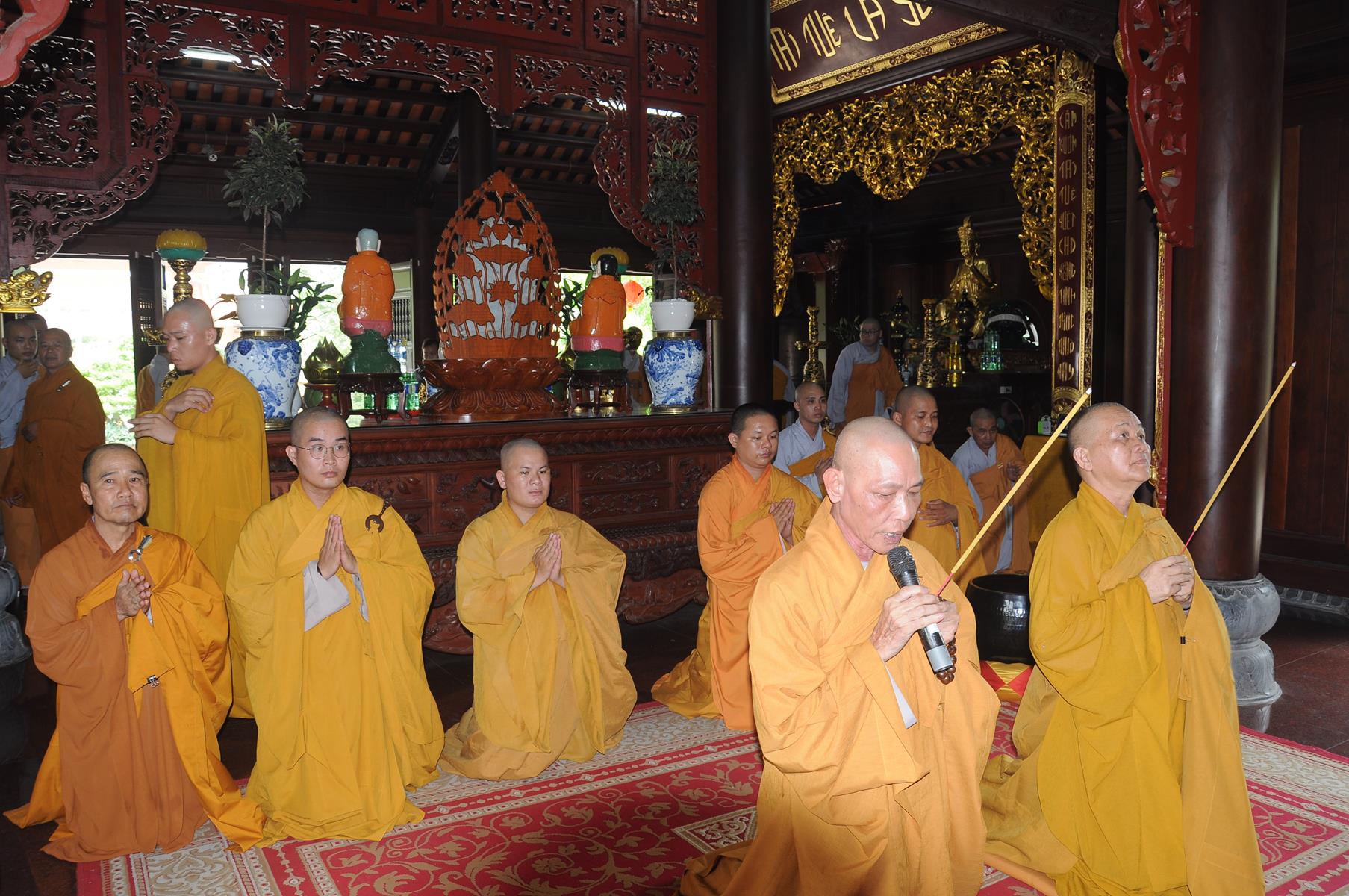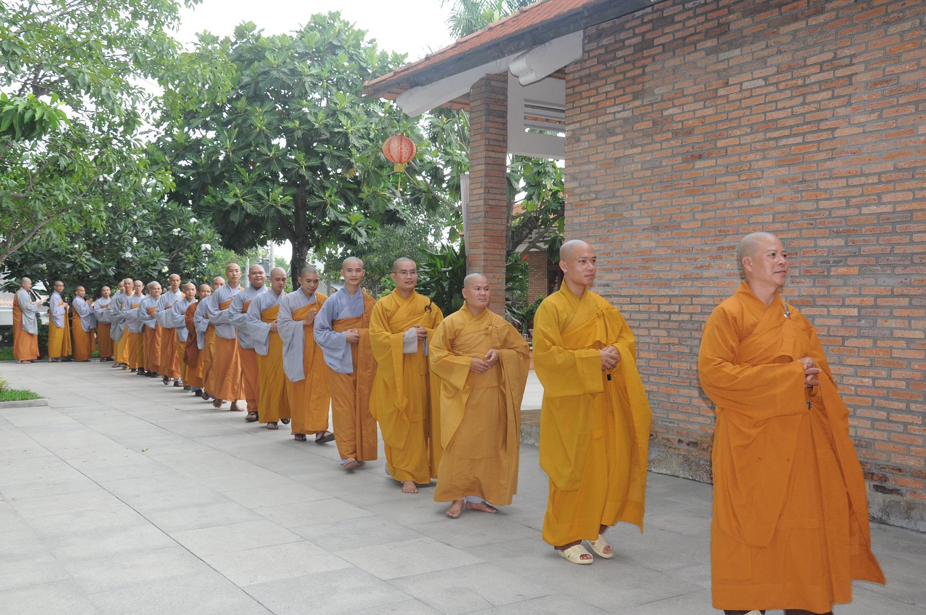 Sau khi Ban Chủ nhiệm hướng dẫn các tăng sinh cung thỉnh nhị vị hòa thượng quang lâm nơi Tổ đường niêm hương bạch Tổ, bạch Phật toàn thể đạo tràng thực hiện nghi thức kiết giới an cư.