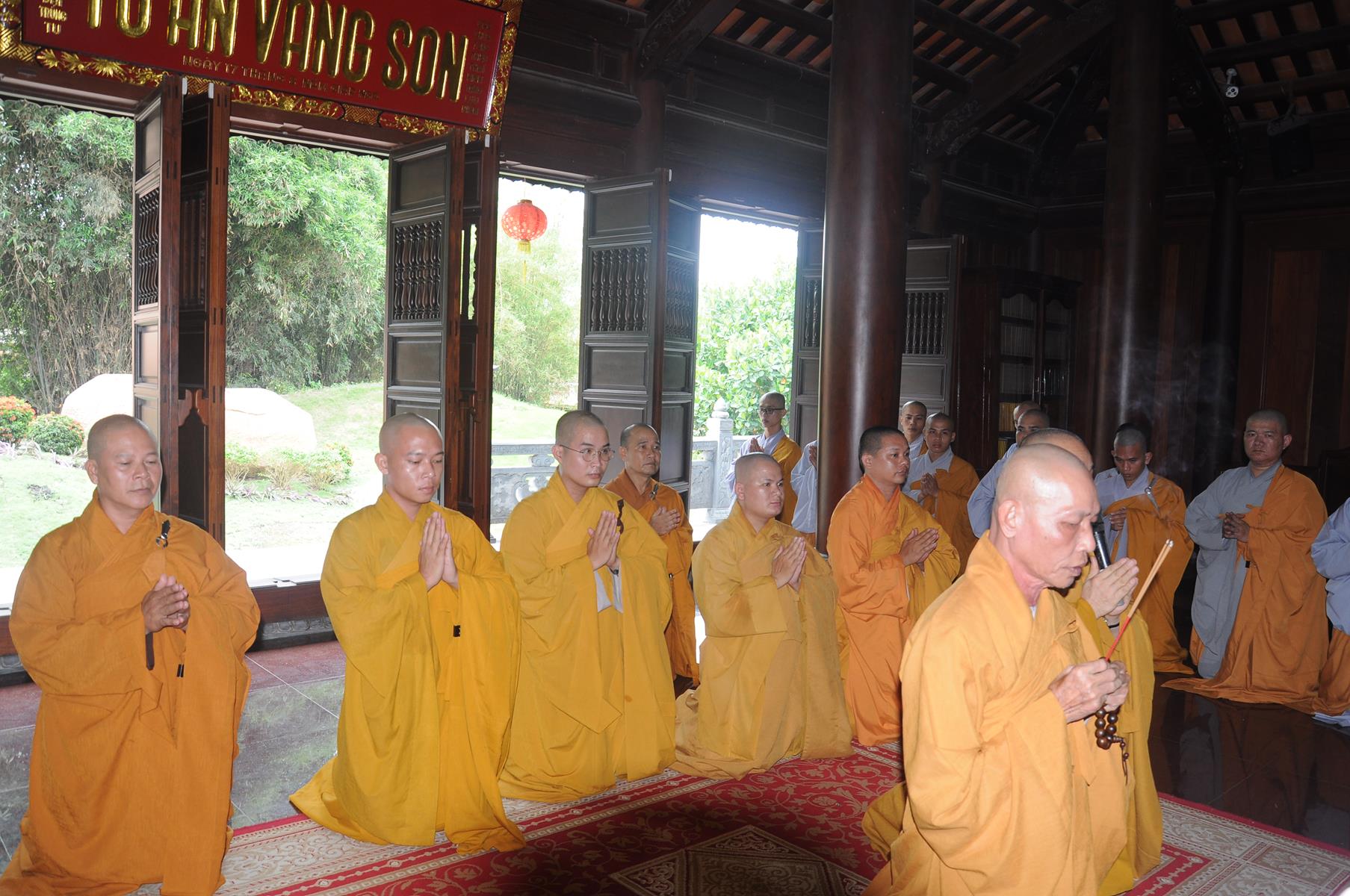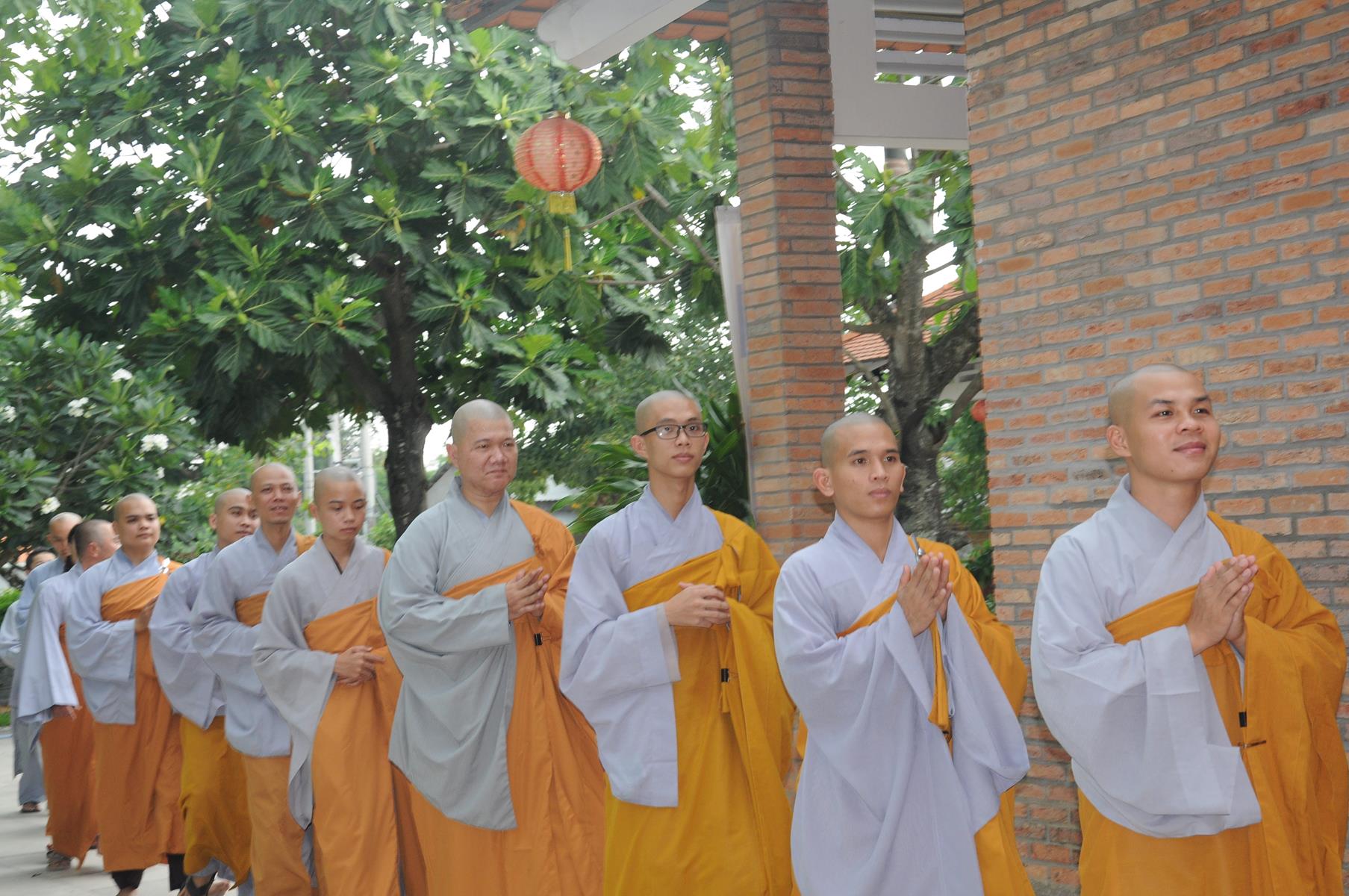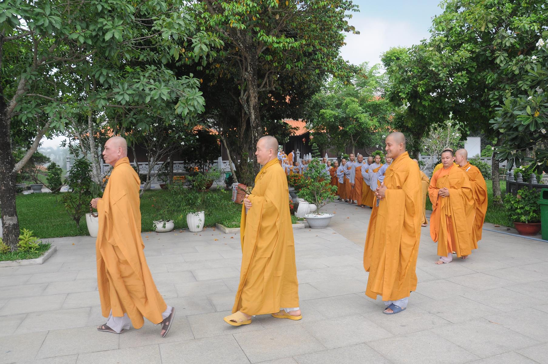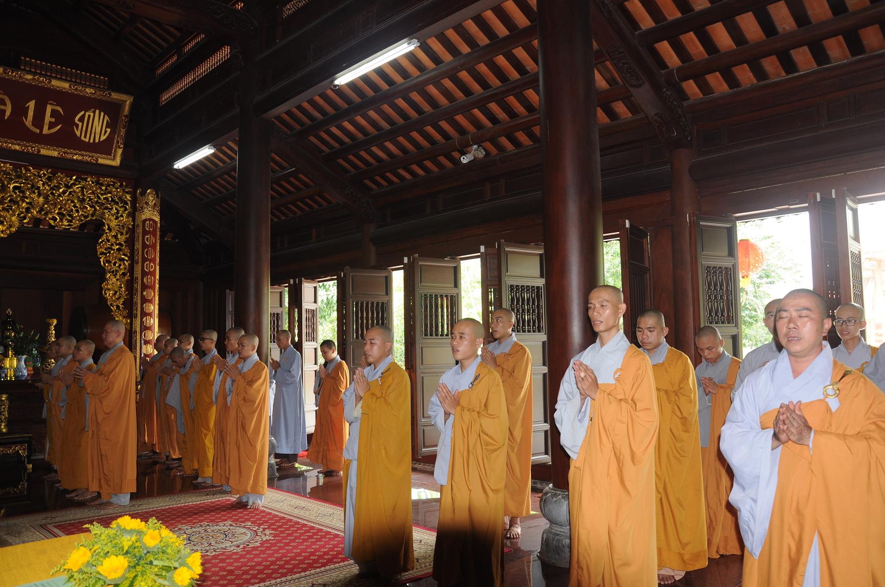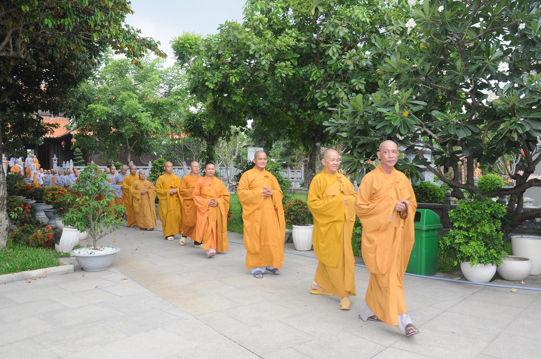 Sau khi Ban Chủ nhiệm hướng dẫn các tăng sinh cung thỉnh nhị vị hòa thượng quang lâm nơi Tổ đường niêm hương bạch Tổ, bạch Phật toàn thể đạo tràng thực hiện nghi thức kiết giới an cư.