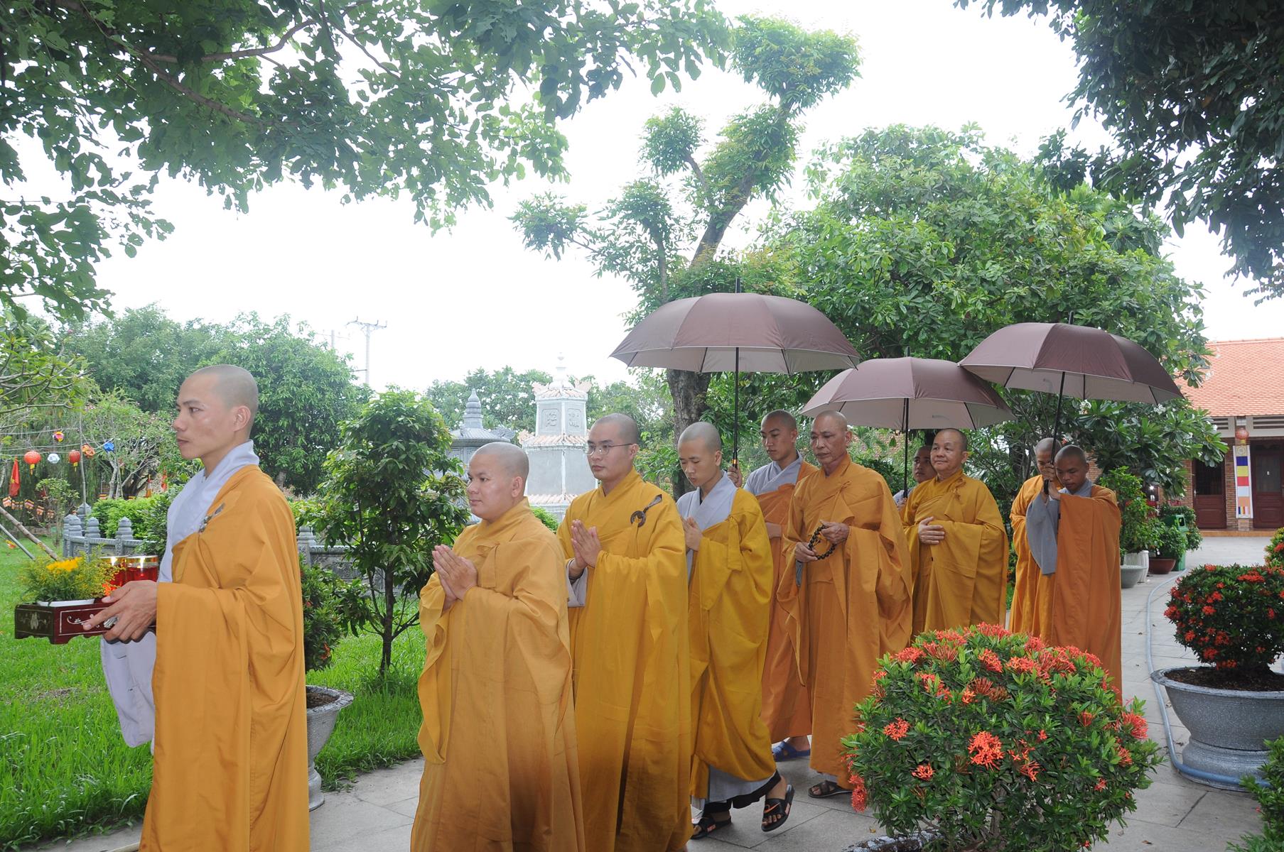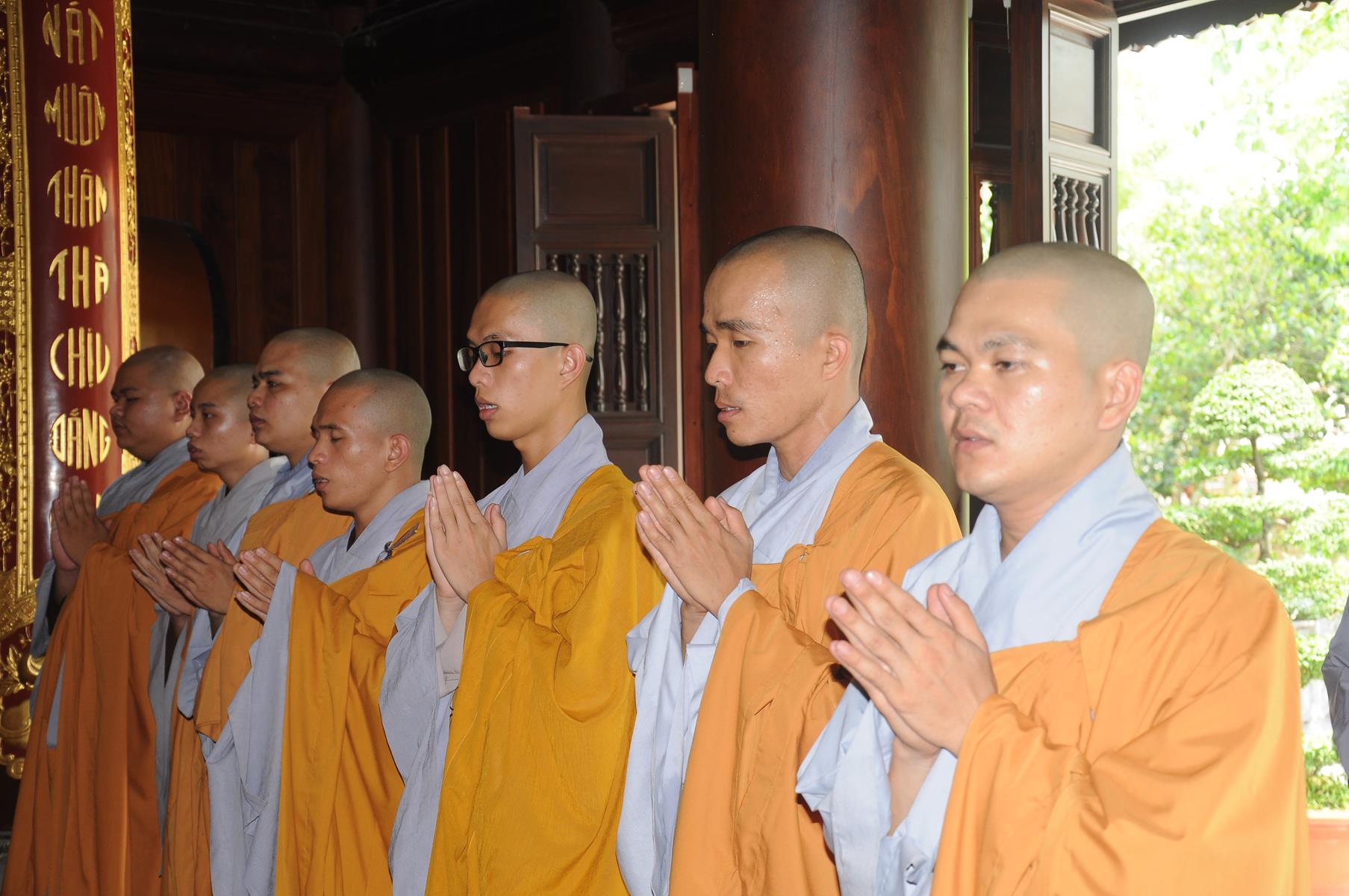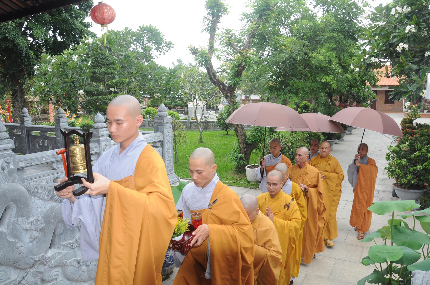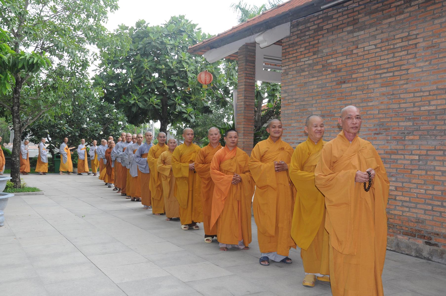 Sau khi Ban Chủ nhiệm hướng dẫn các tăng sinh cung thỉnh nhị vị hòa thượng quang lâm nơi Tổ đường niêm hương bạch Tổ, bạch Phật toàn thể đạo tràng thực hiện nghi thức kiết giới an cư.
