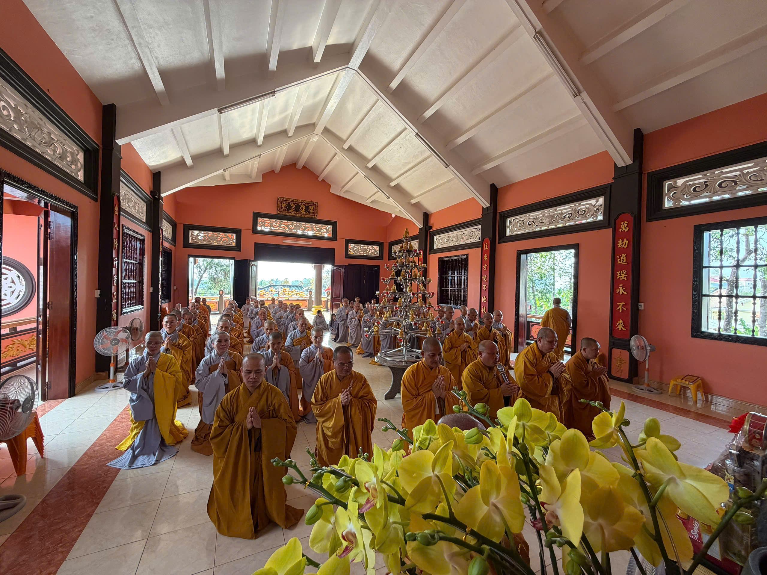 Đối trước bậc tôn túc thạch trụ tòng lâm, Ban Giám Hiệu và Tăng Ni sinh đồng quỳ dâng lời chúc thọ, nguyện cầu Hòa thượng pháp thể khinh an, đạo thọ miên trường, mãi là bóng cây đại thụ che chở hàng hậu học.