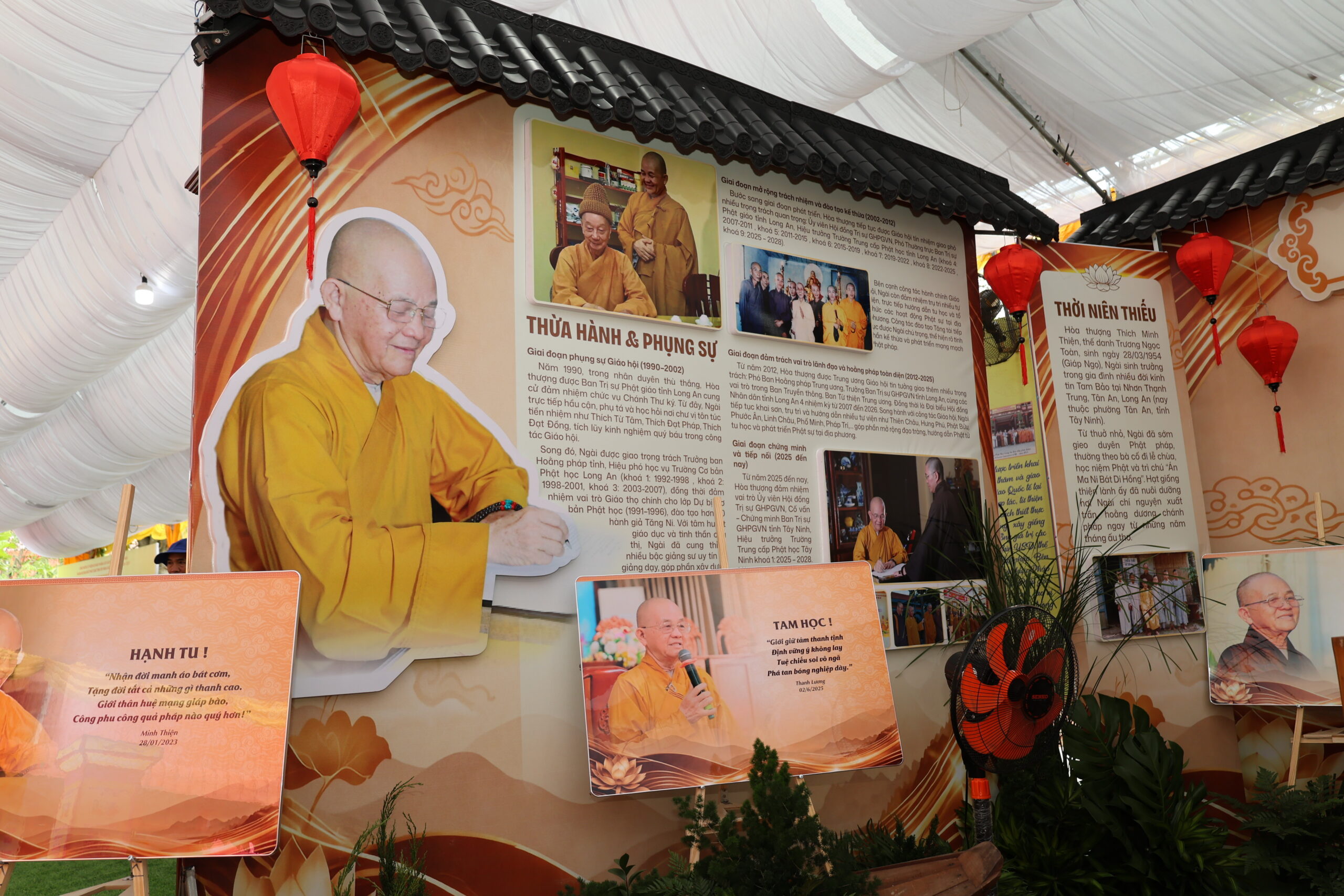 Ban lời đạo từ, Hòa thượng Thích Minh Thiện – Cố vấn, chứng minh Ban Trị sự GHPGVN tỉnh Tây Ninh đã tán thán trí tuệ, công đức của Chư Tôn đức ban triển lãm đã dày công sưu tầm, biên tập và trưng bày những hình ảnh, tư liệu quý báu, góp phần tái hiện một cách sinh động tiến trình hình thành và phát triển của GHPGVN nói chung và Phật giáo tỉnh Tây Ninh nói riêng. Qua đó, Hòa thượng sách tấn chư Tôn đức Tăng Ni tiếp tục phát huy tinh thần đoàn kết, hòa hợp, trưởng dưỡng đạo tâm, trang nghiêm Giáo hội, góp phần xây dựng Phật giáo tỉnh Tây Ninh ngày càng ổn định, phát triển bền vững trong lòng dân tộc, đồng hành cùng quê hương, đất nước trong thời kỳ mới.