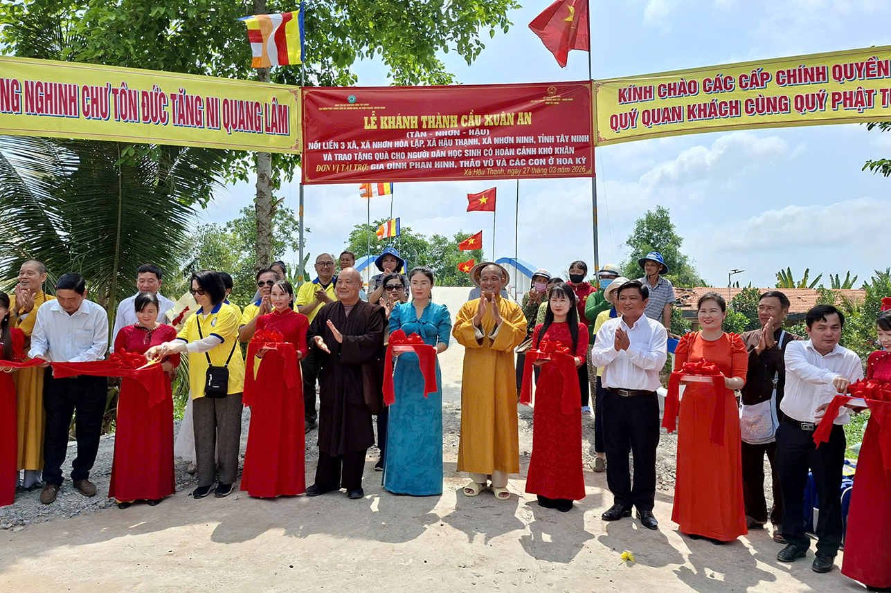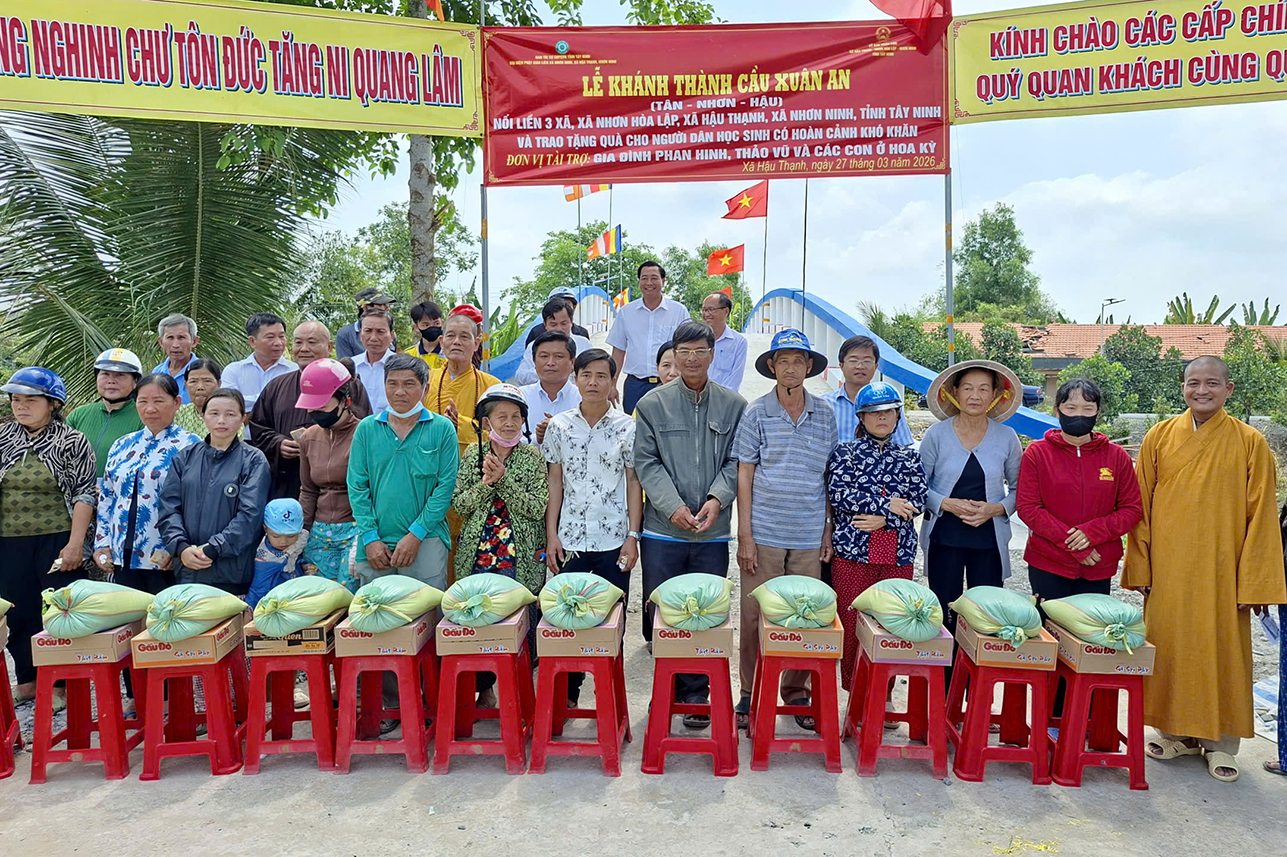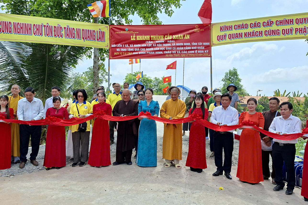 Sáng ngày 27/3/2026, Ban Trị sự GHPGVN tỉnh Tây Ninh, Ban Từ thiện Xã hội Báo Giác Ngộ và chính quyền địa phương đã khánh thành cầu Xuân An nối liền 3 xã (Nhơn Hòa Lập, Hậu Thạnh, Nhơn Ninh) và trao tặng quà cho bà con khó khăn.
