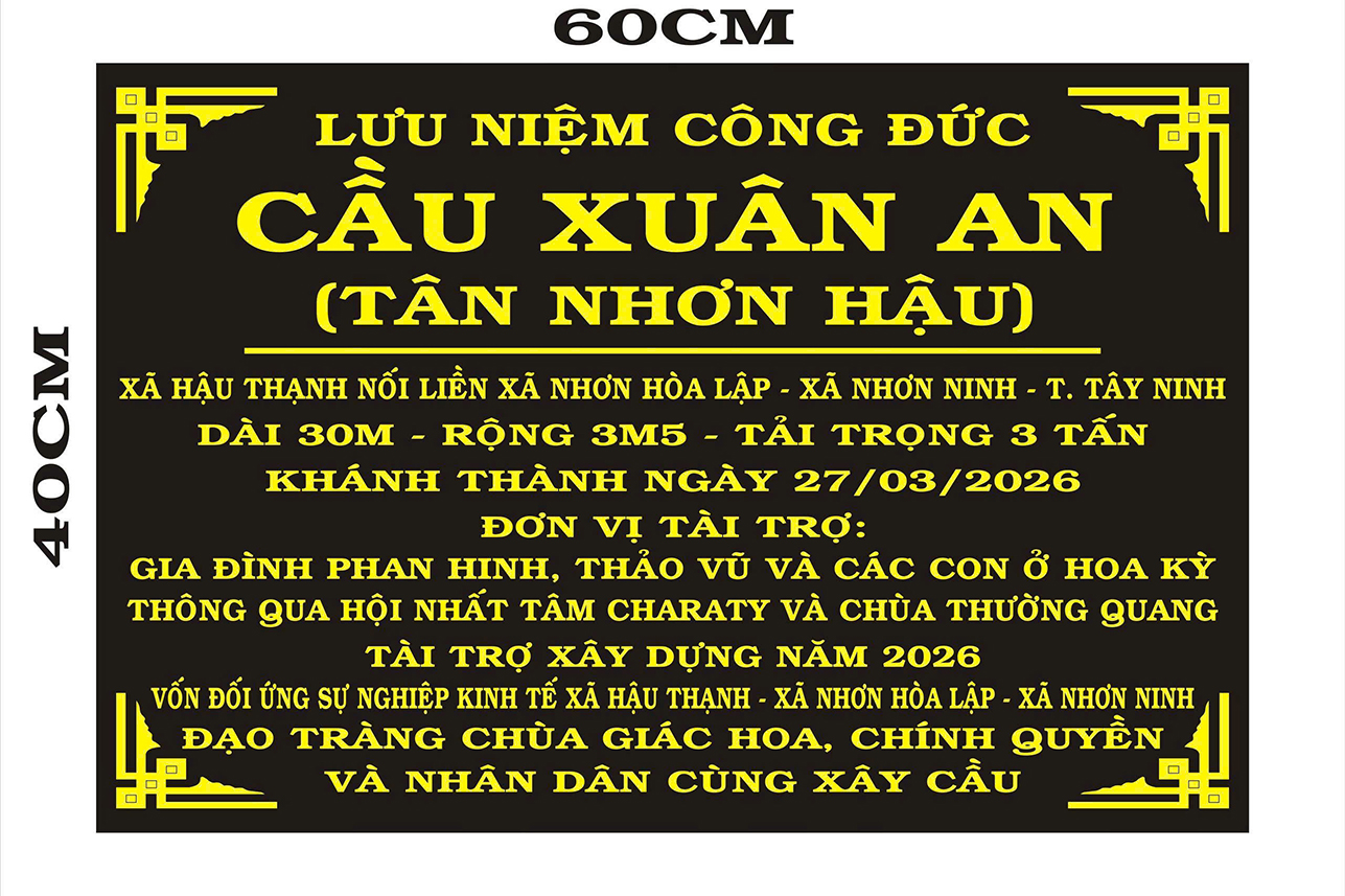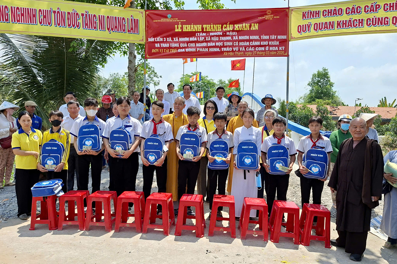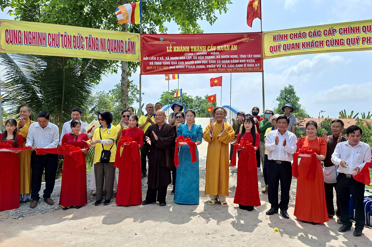 Sáng ngày 27/3/2026, Ban Trị sự GHPGVN tỉnh Tây Ninh, Ban Từ thiện Xã hội Báo Giác Ngộ và chính quyền địa phương đã khánh thành cầu Xuân An nối liền 3 xã (Nhơn Hòa Lập, Hậu Thạnh, Nhơn Ninh) và trao tặng quà cho bà con khó khăn.