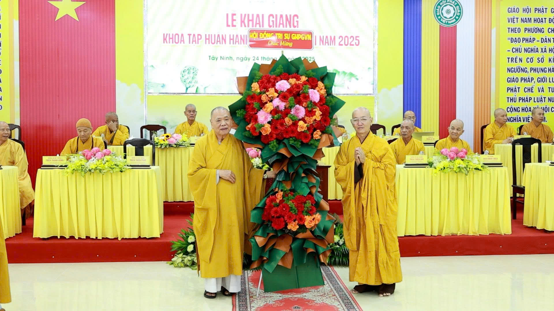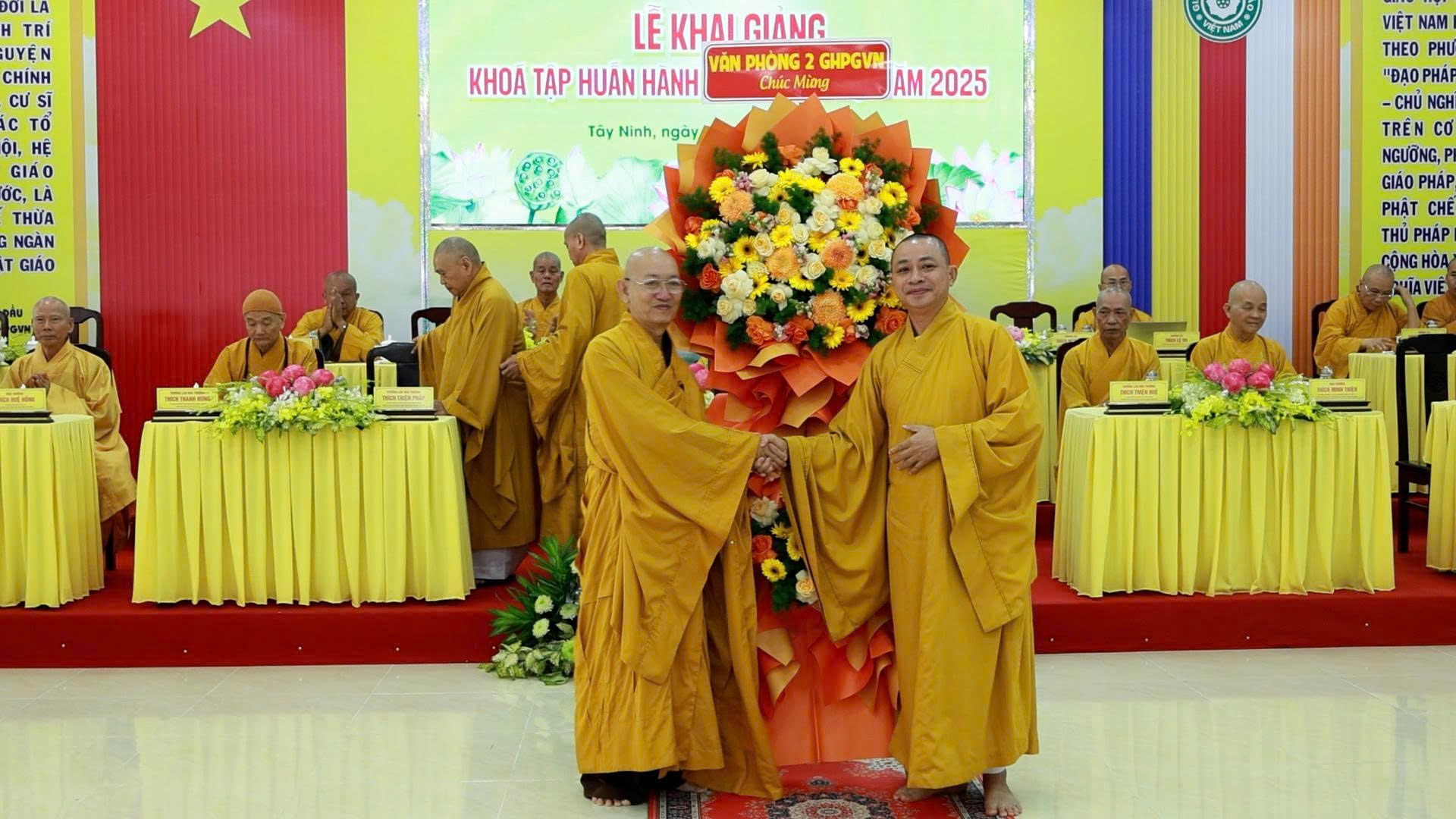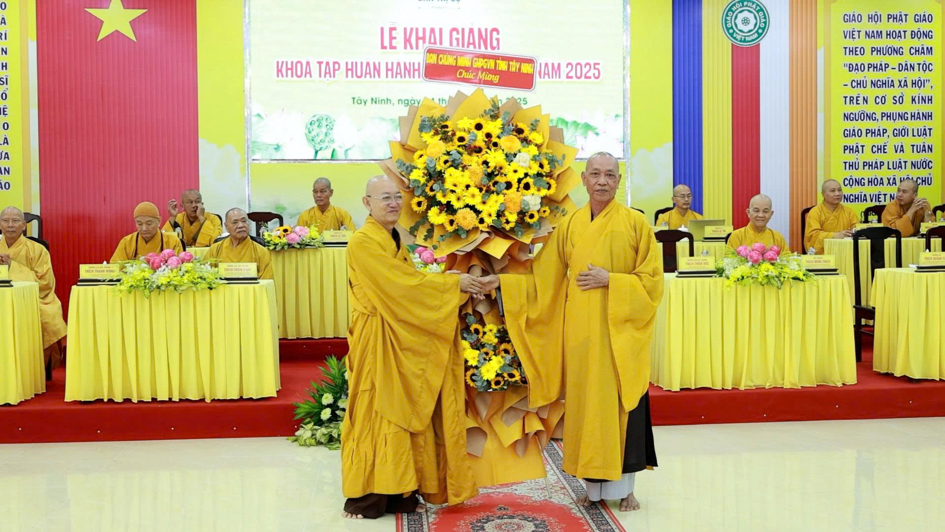 Lễ Khai giảng đón nhận nhiều lẵng hoa, tịnh tài chúc mừng từ Ban Thường trực HĐTS GHPGVN, Văn phòng II TW GHPGVN, Ban Chứng minh GHPGVN tỉnh Tây Ninh; Sở Dân tộc – Tôn giáo tỉnh; Gia đình Phật tử Nguyên Oanh.