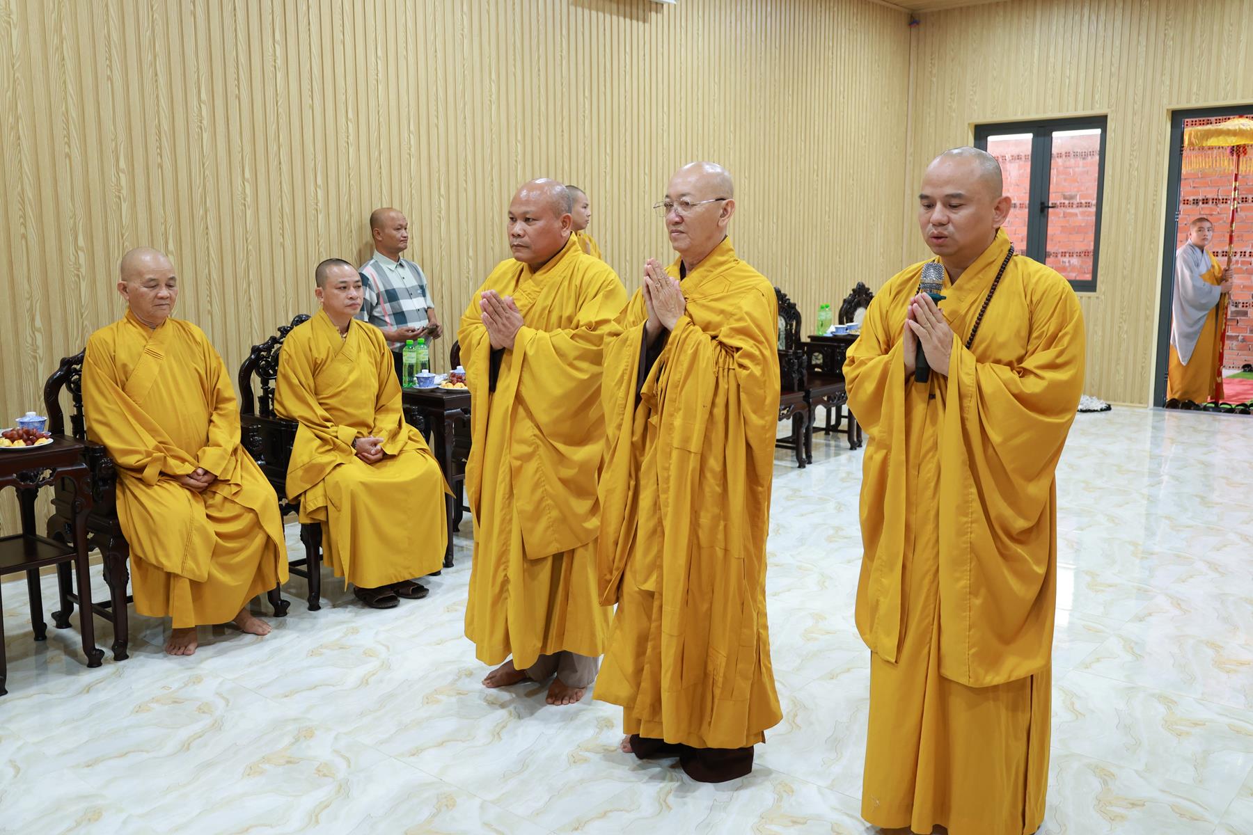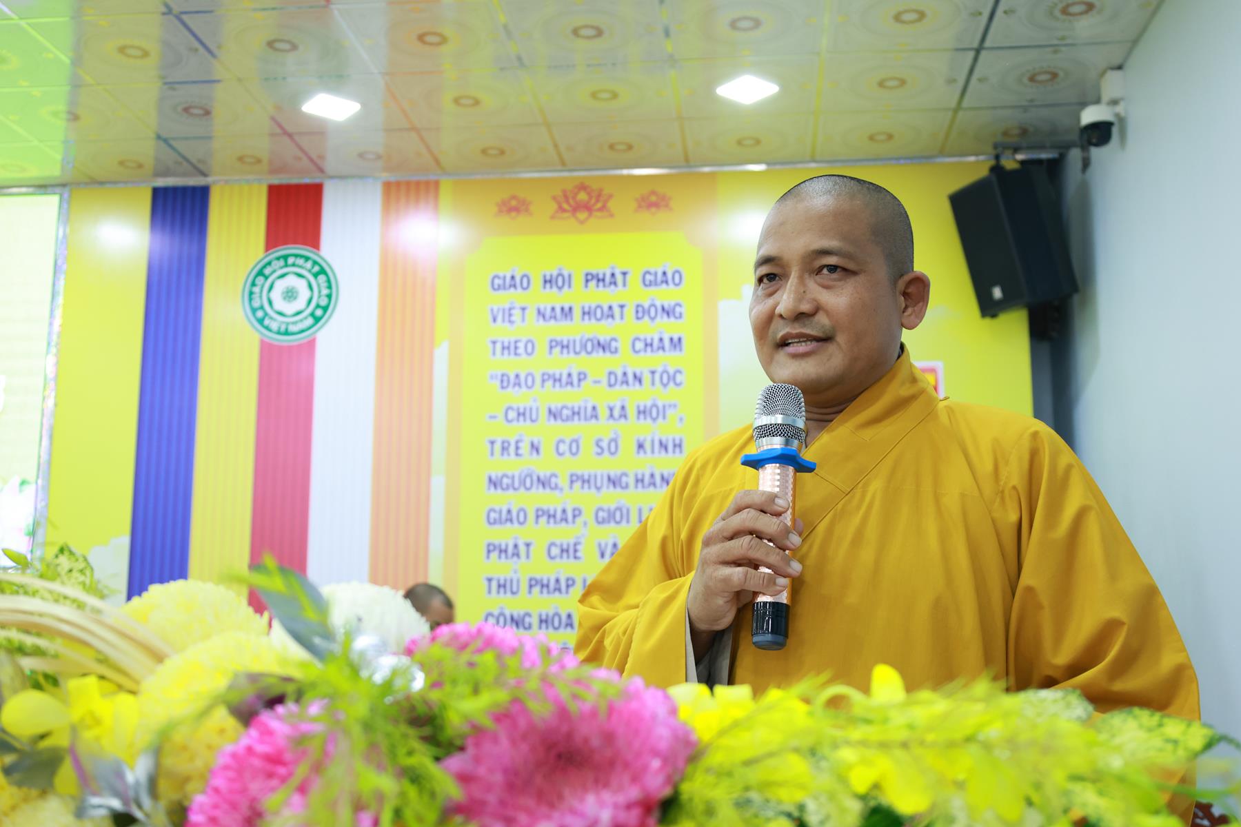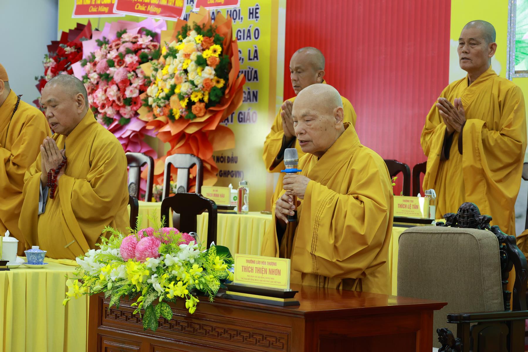 ĐĐ. Thích Thiện Thức – Phó Trưởng Ban Thường trực BTS GHPGVN tỉnh, Phó Ban Tổ chức phát biểu cảm tạ. Đại đức cung kính tri ân lời đạo từ của Hòa thượng Chủ tịch HĐTS GHPGVN cùng sự quang lâm chứng minh của Chư Tôn giáo phẩm HĐTS. Đại đức cũng gửi lời tri ân đến lãnh đạo Sở Dân tộc – Tôn giáo tỉnh đã dành thời gian tham dự, đồng hành và hỗ trợ cho công tác Phật sự của tỉnh. Đồng thời, Đại đức bày tỏ lòng biết ơn sâu sắc đến gần 200 Chư Tôn đức Tăng Ni đại biểu đã vân tập tham dự Khóa tập huấn; tri ân sự phát tâm đóng góp, hộ trì của các cá nhân, tổ chức để Khóa tập huấn và Lễ Khai giảng sáng nay được thành công viên mãn.