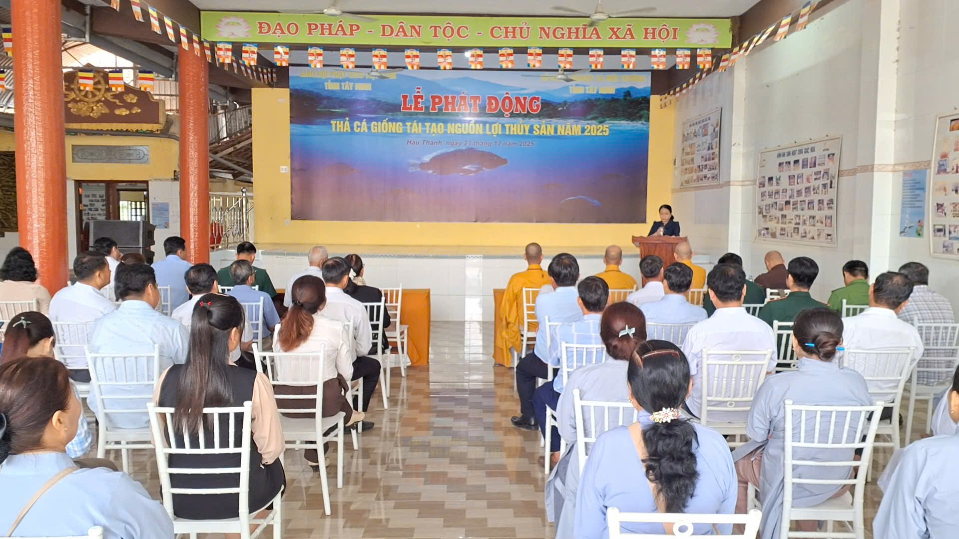 Sáng ngày 23/12/2025 (nhằm ngày 4/11/Ất Tỵ), BTS GHPGVN tỉnh Tây Ninh phối hợp Sở Nông nghiệp và Môi trường tỉnh tổ chức Lễ phát động thả cá tái tạo nguồn lợi thủy sản tại khu vực kênh Dương Văn Dương, đoạn bờ kè thuộc khuôn viên chùa Giác Hoa, xã Hậu Thạnh.