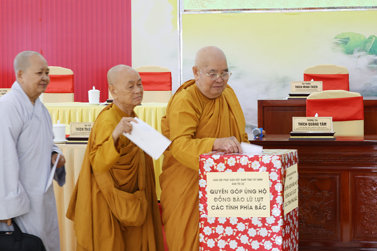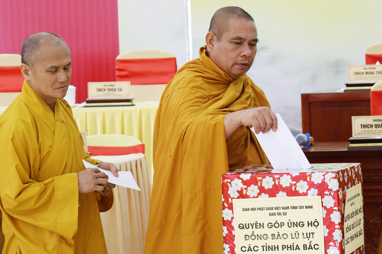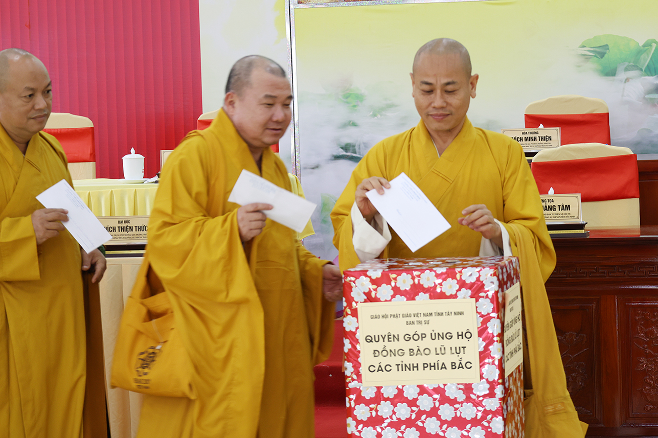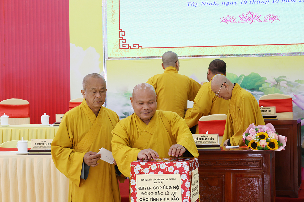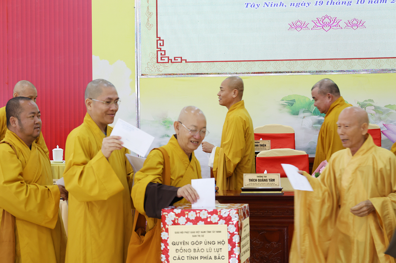 Ngoài ra, sau phiên họp, Chư Tôn đức đang tùy hủy công đức, phát tâm ủng hộ tịnh tài cho chuyến cứu trợ đồng bào các tỉnh phía Bắc bị ảnh hưởng bởi cơn bão số 10, 11 gây ra.