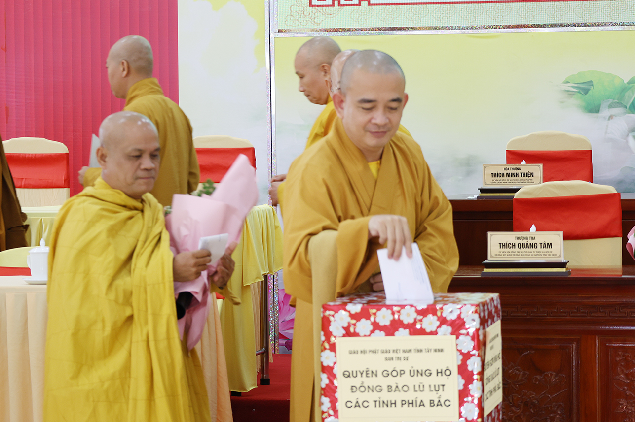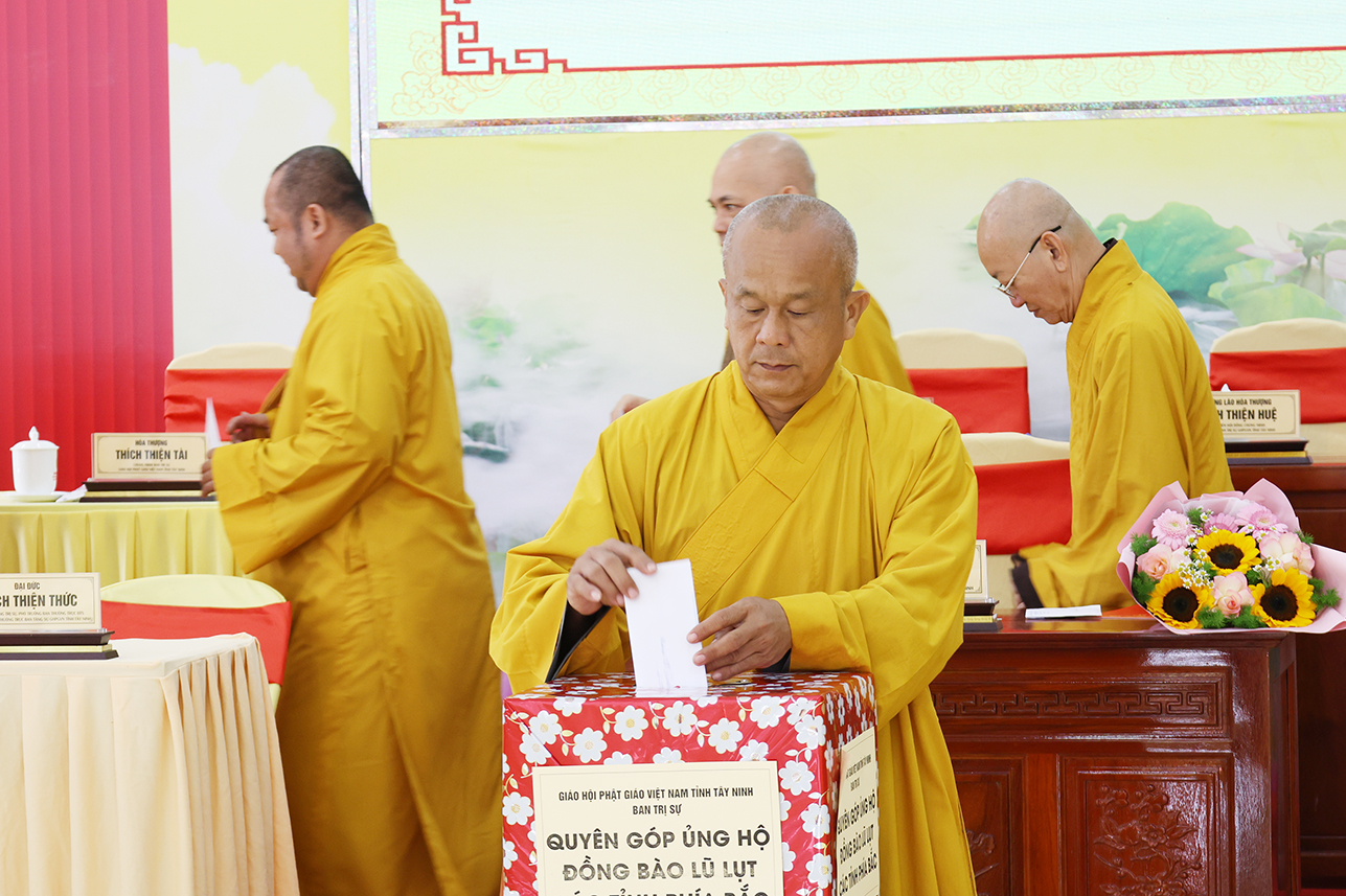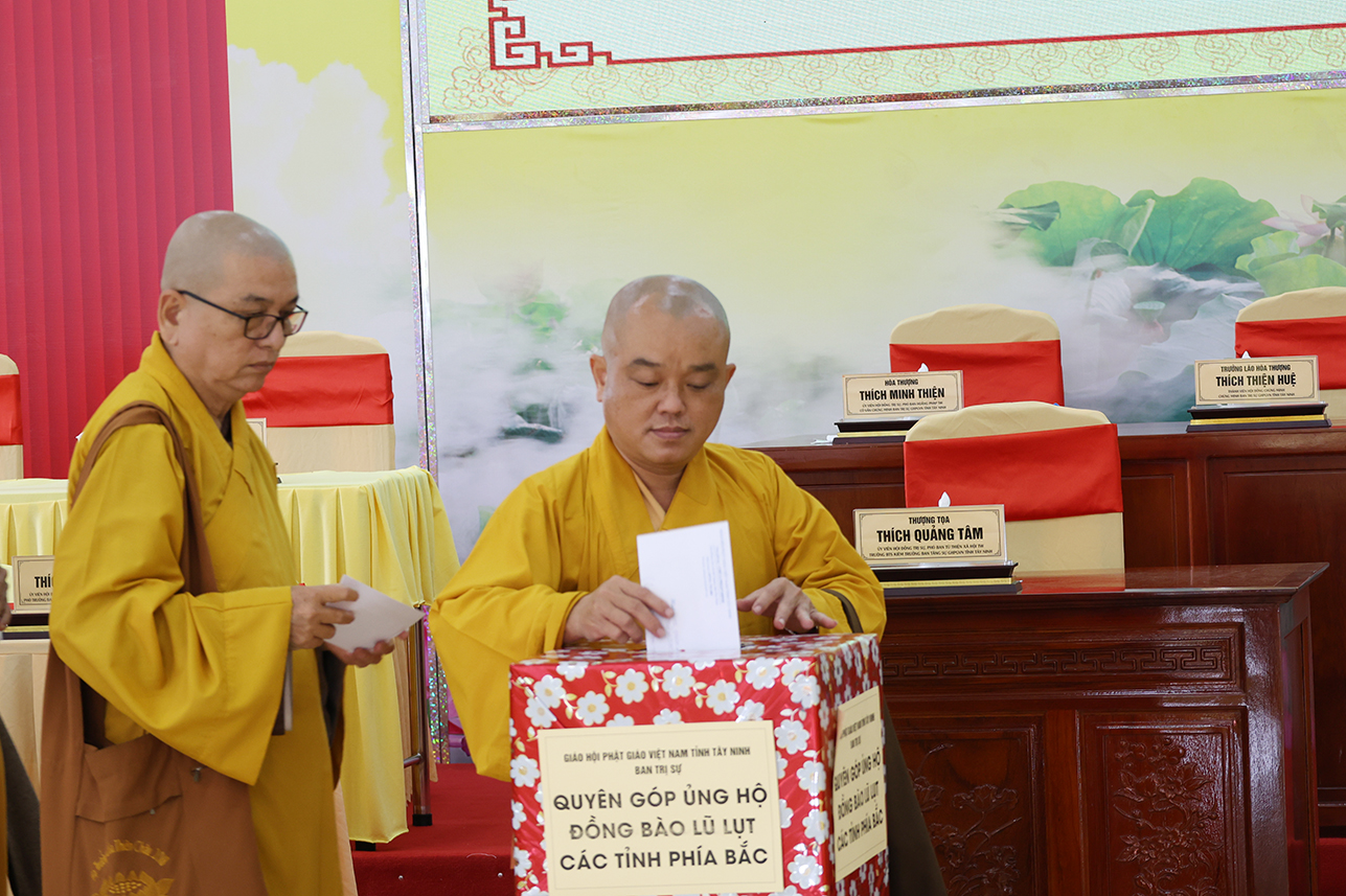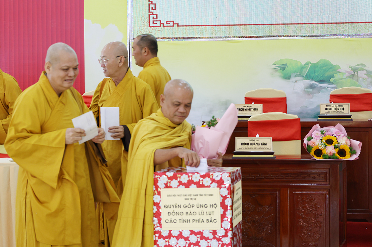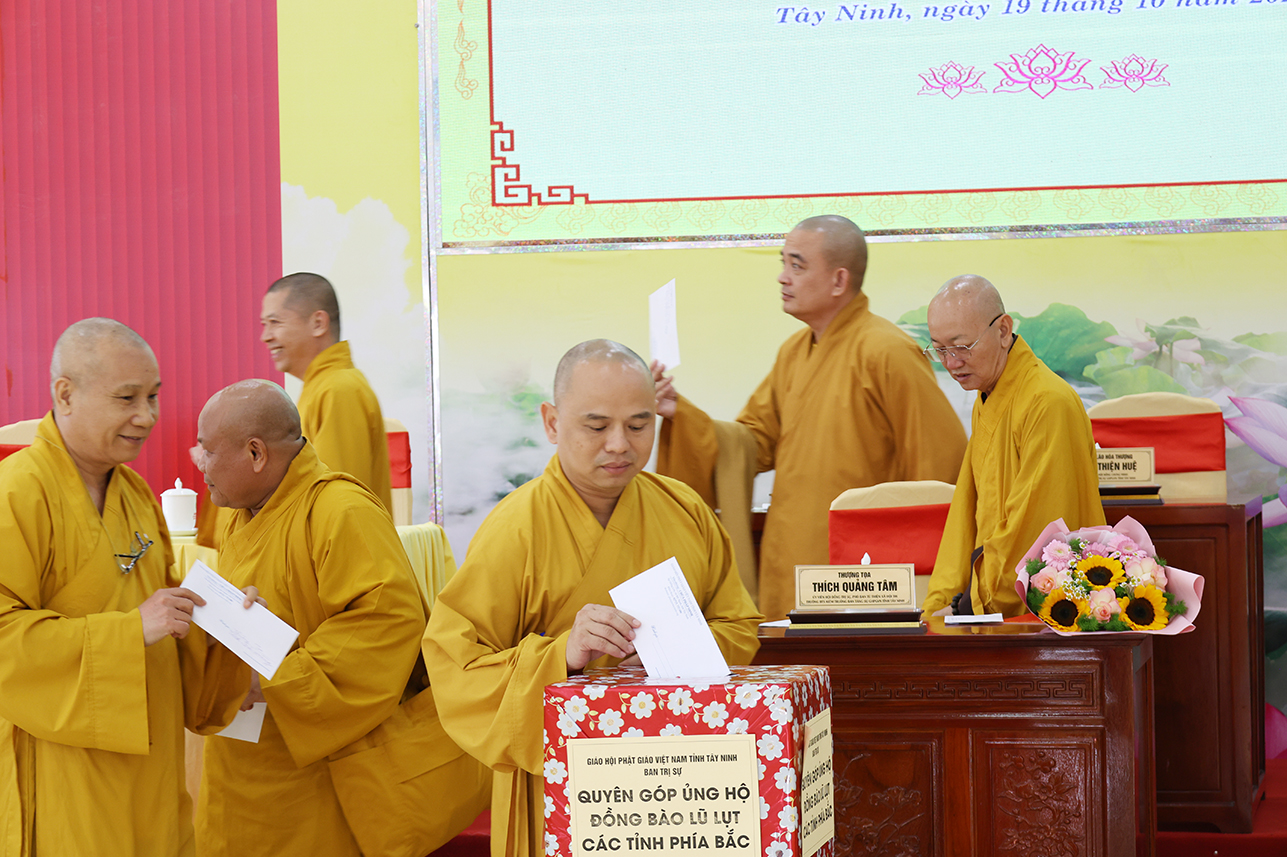Ngoài ra, sau phiên họp, Chư Tôn đức đang tùy hủy công đức, phát tâm ủng hộ tịnh tài cho chuyến cứu trợ đồng bào các tỉnh phía Bắc bị ảnh hưởng bởi cơn bão số 10, 11 gây ra.