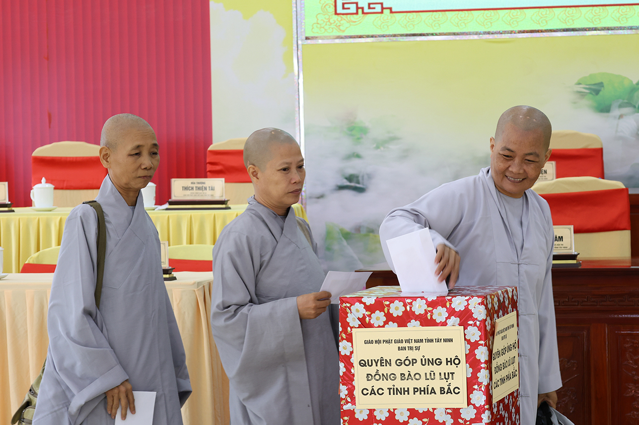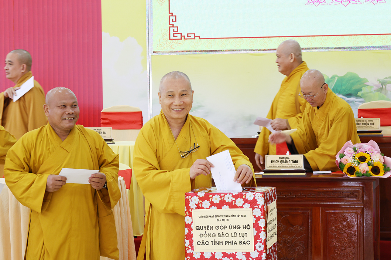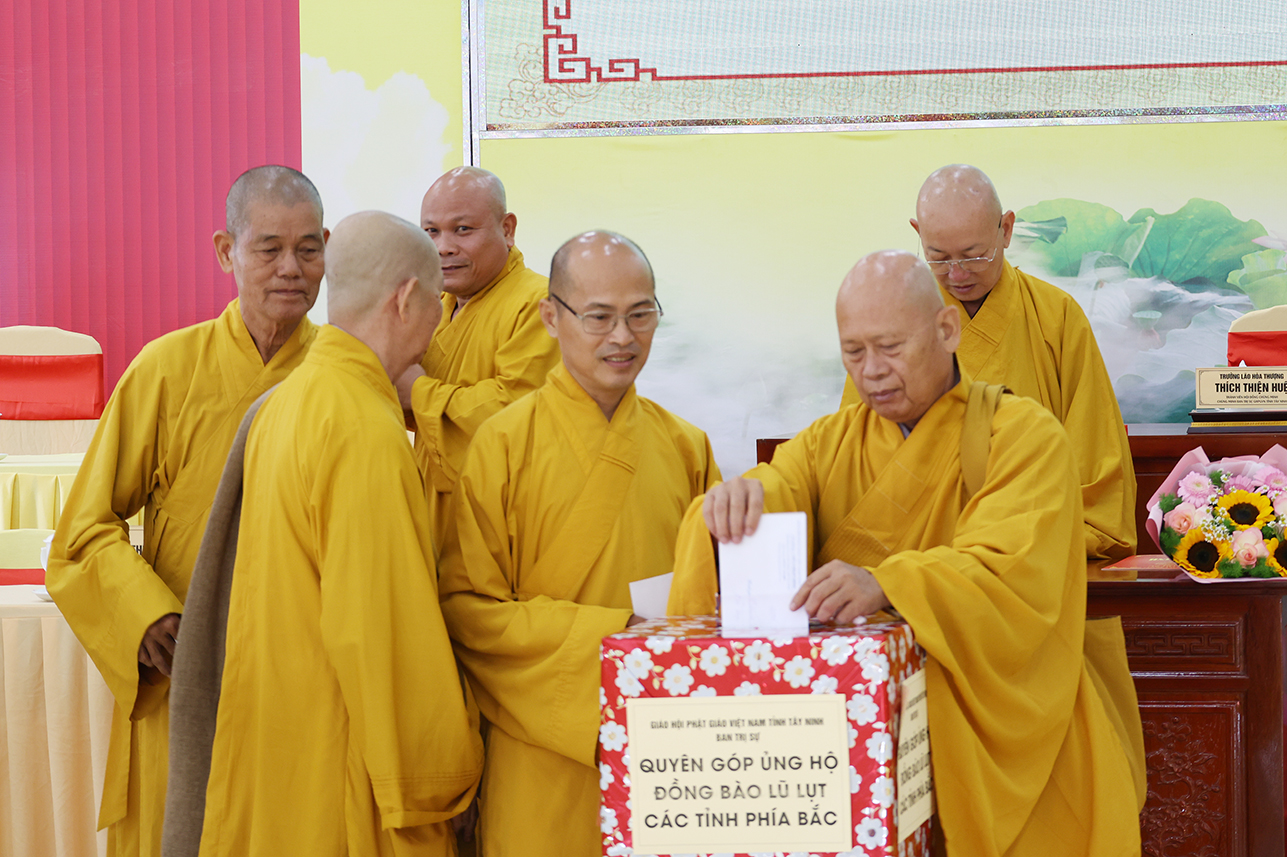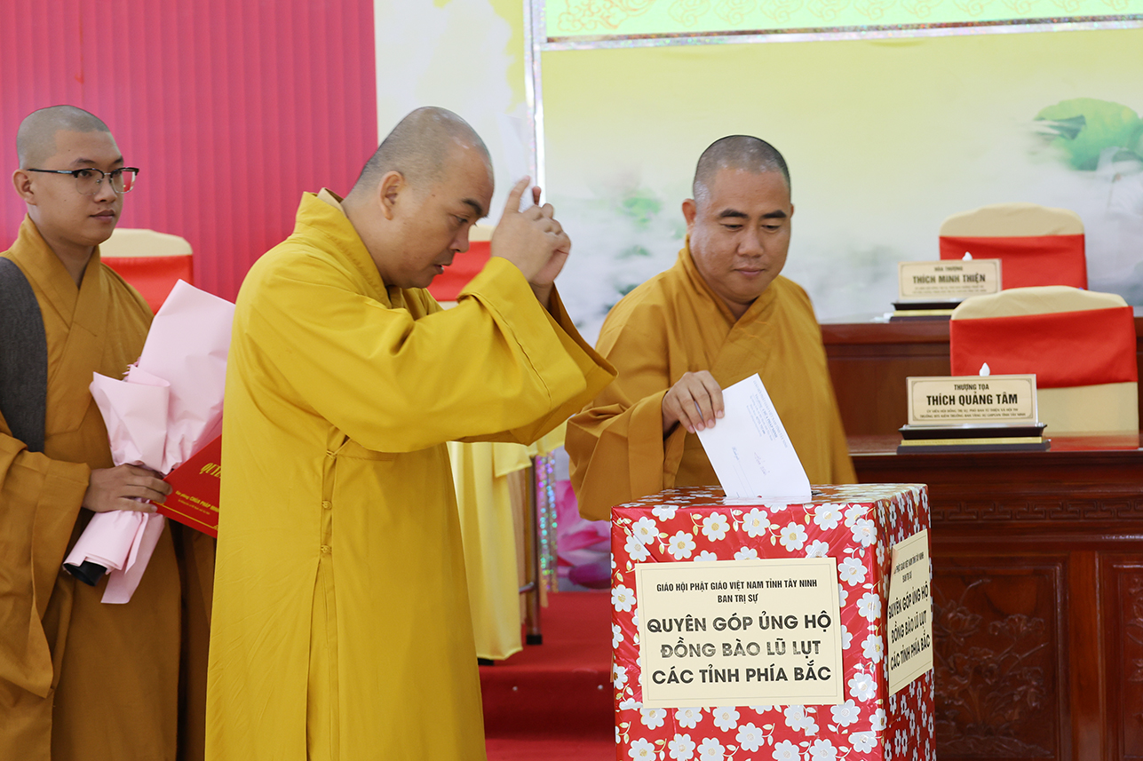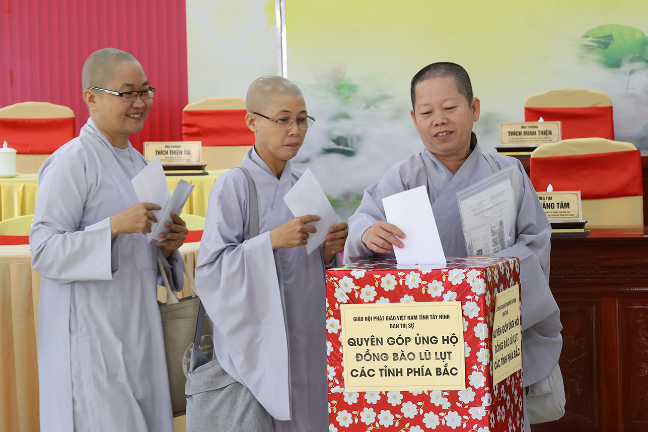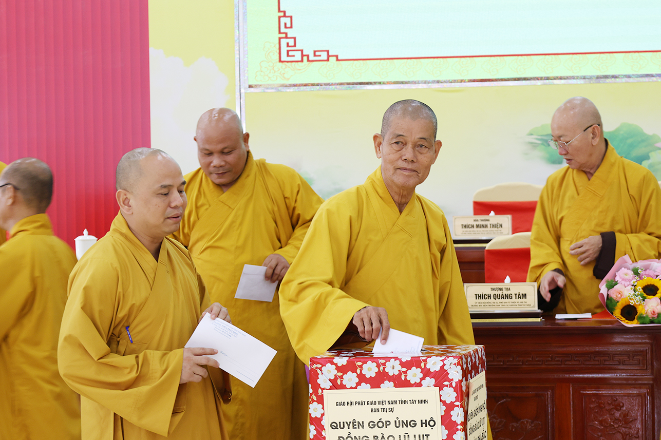 Ngoài ra, sau phiên họp, Chư Tôn đức đang tùy hủy công đức, phát tâm ủng hộ tịnh tài cho chuyến cứu trợ đồng bào các tỉnh phía Bắc bị ảnh hưởng bởi cơn bão số 10, 11 gây ra.