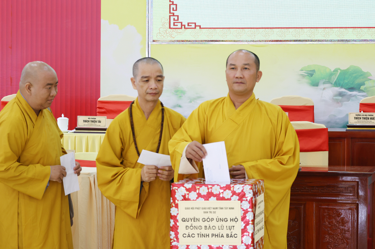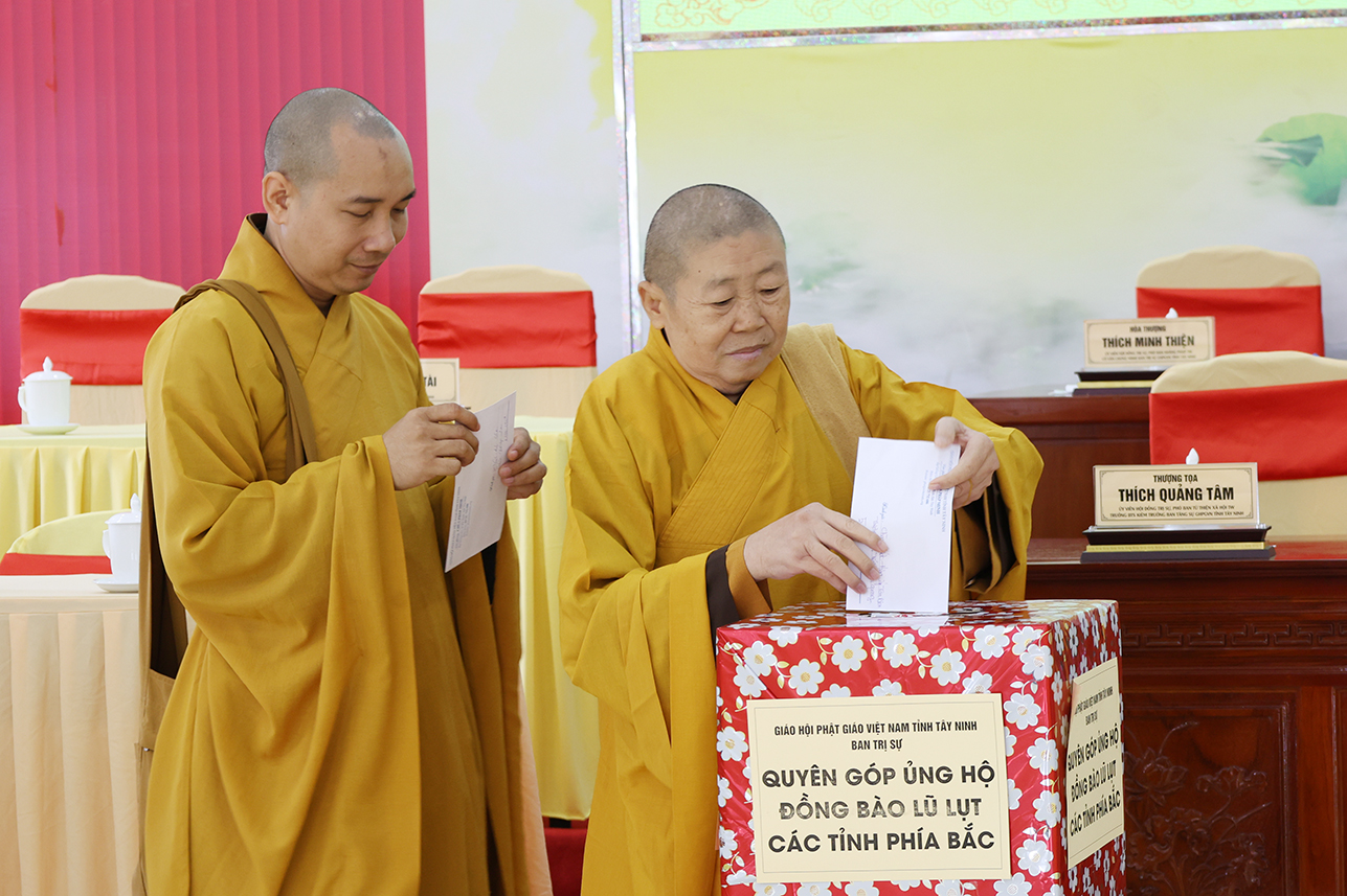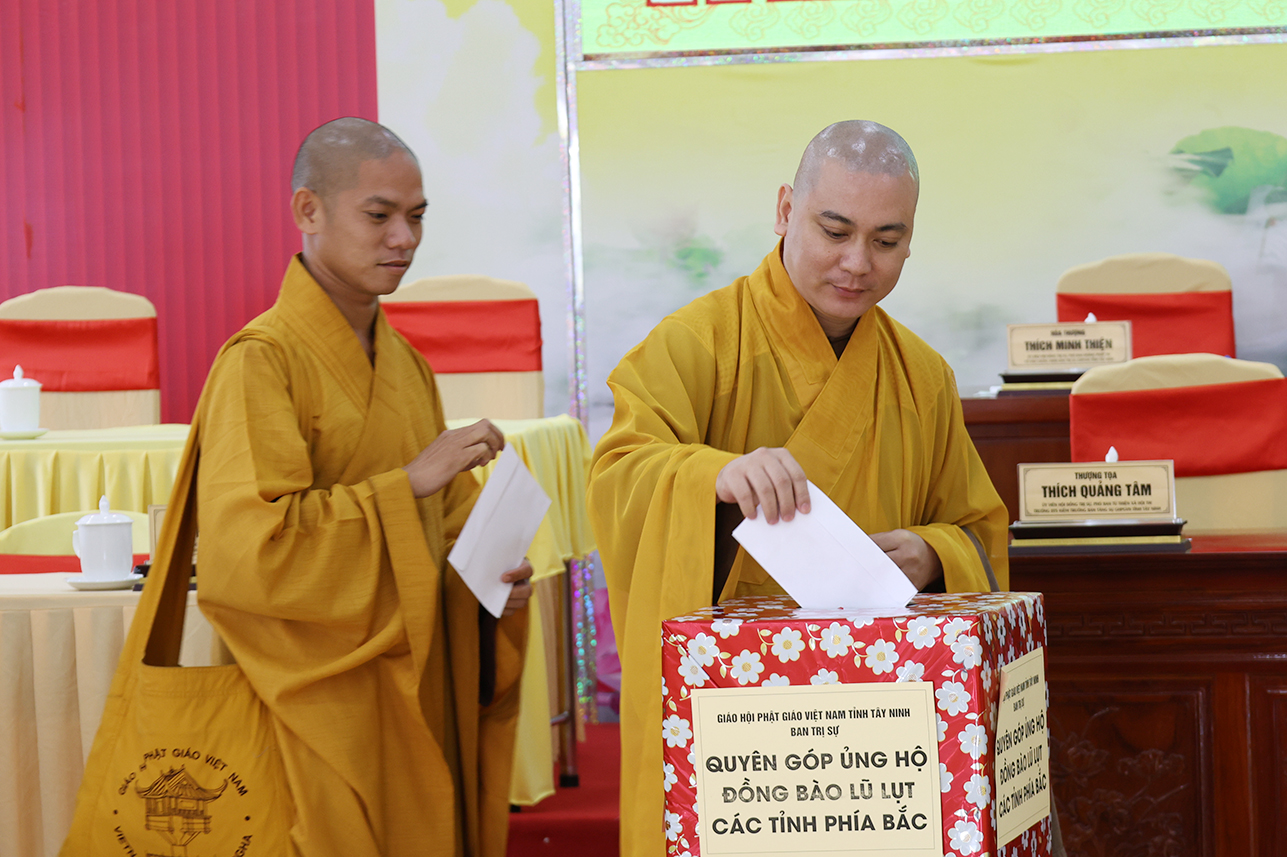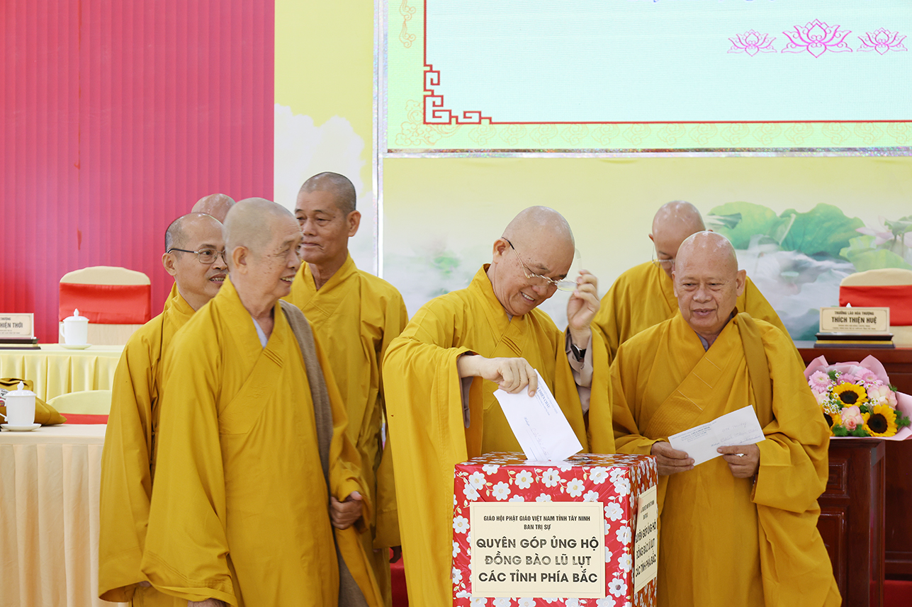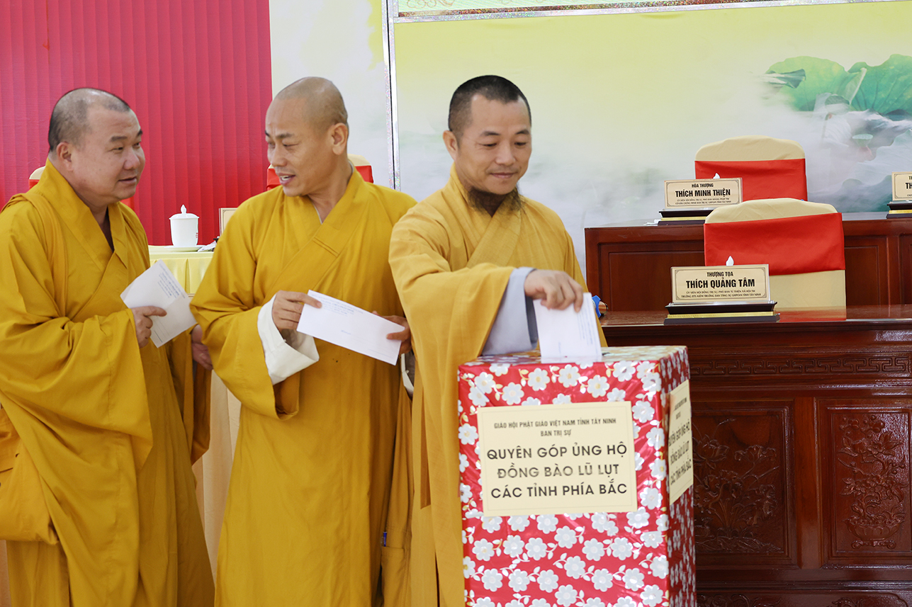 Ngoài ra, sau phiên họp, Chư Tôn đức đang tùy hủy công đức, phát tâm ủng hộ tịnh tài cho chuyến cứu trợ đồng bào các tỉnh phía Bắc bị ảnh hưởng bởi cơn bão số 10, 11 gây ra.