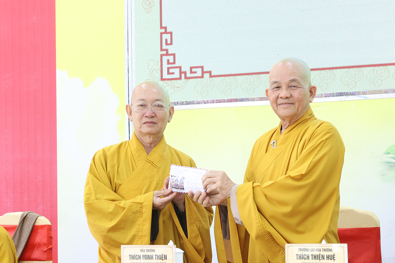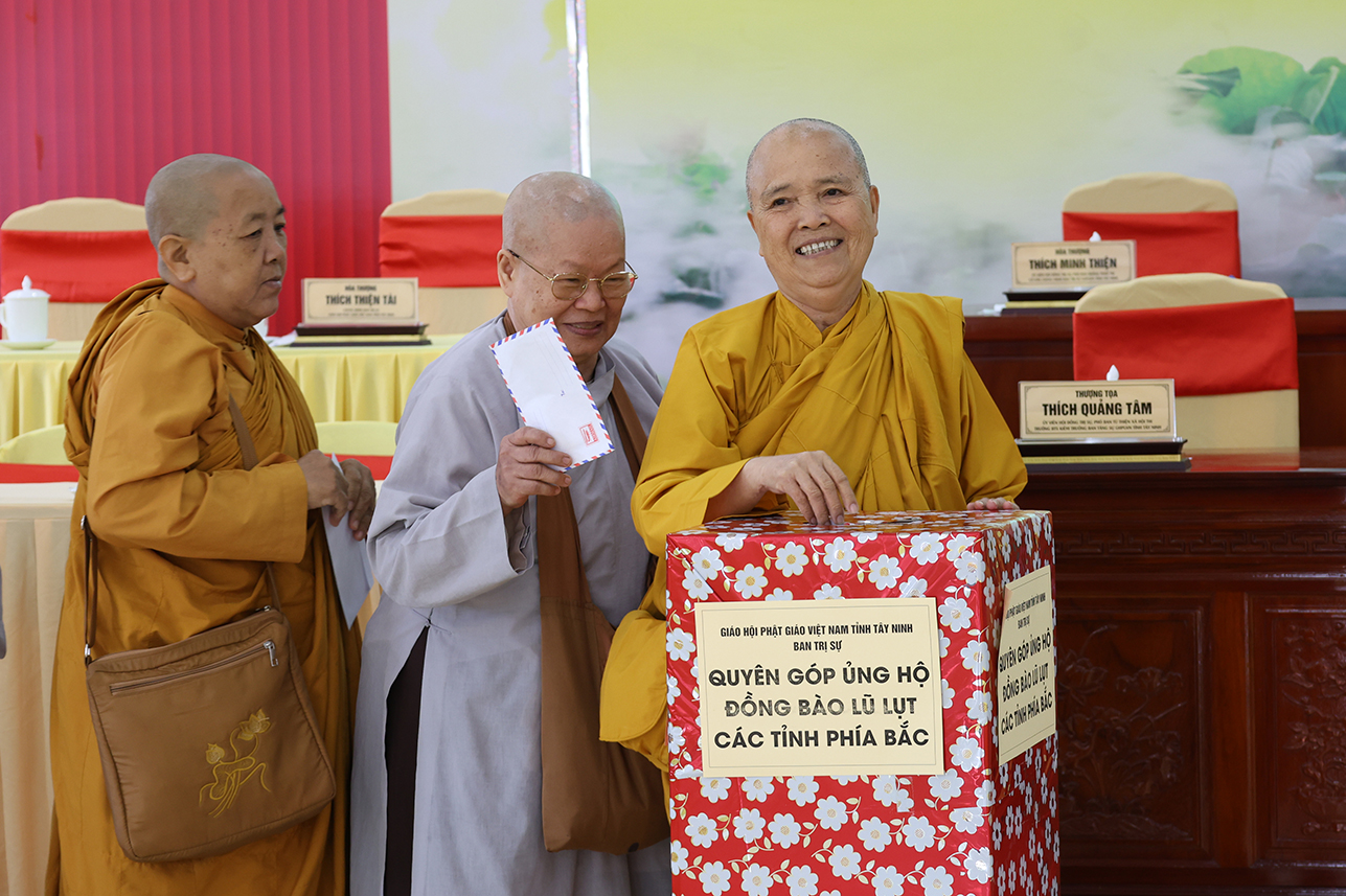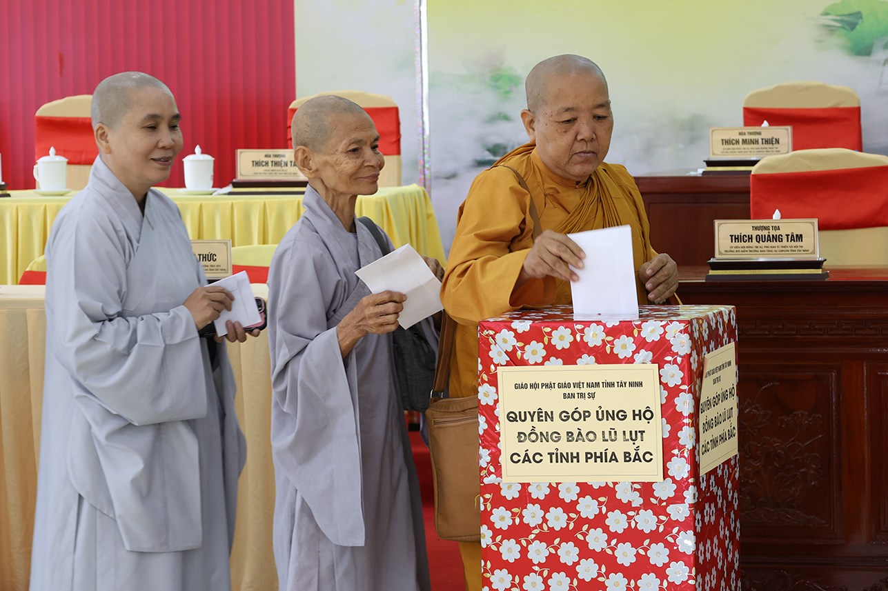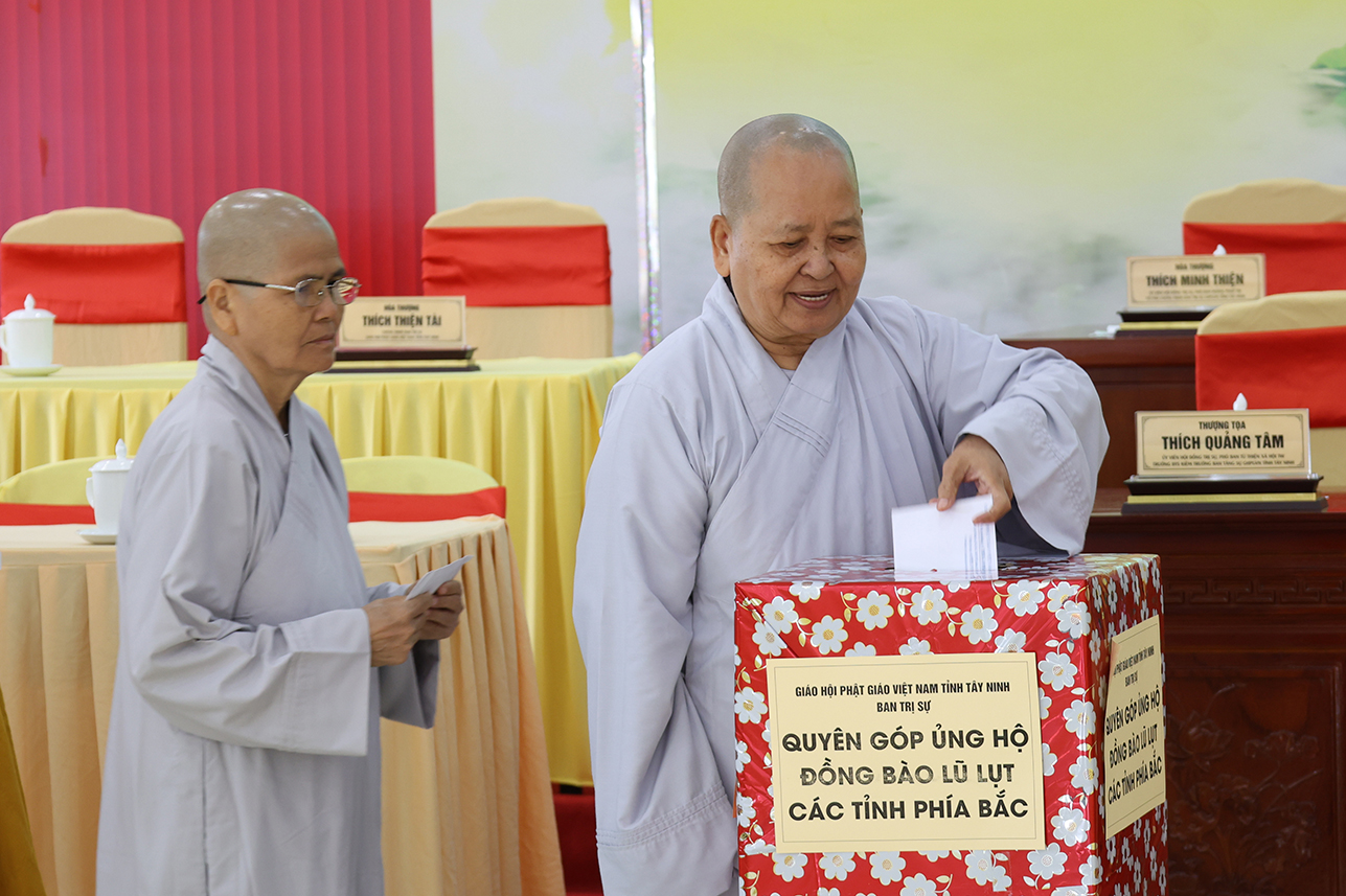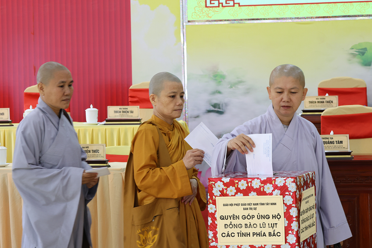 Ngoài ra, sau phiên họp, Chư Tôn đức đang tùy hủy công đức, phát tâm ủng hộ tịnh tài cho chuyến cứu trợ đồng bào các tỉnh phía Bắc bị ảnh hưởng bởi cơn bão số 10, 11 gây ra.