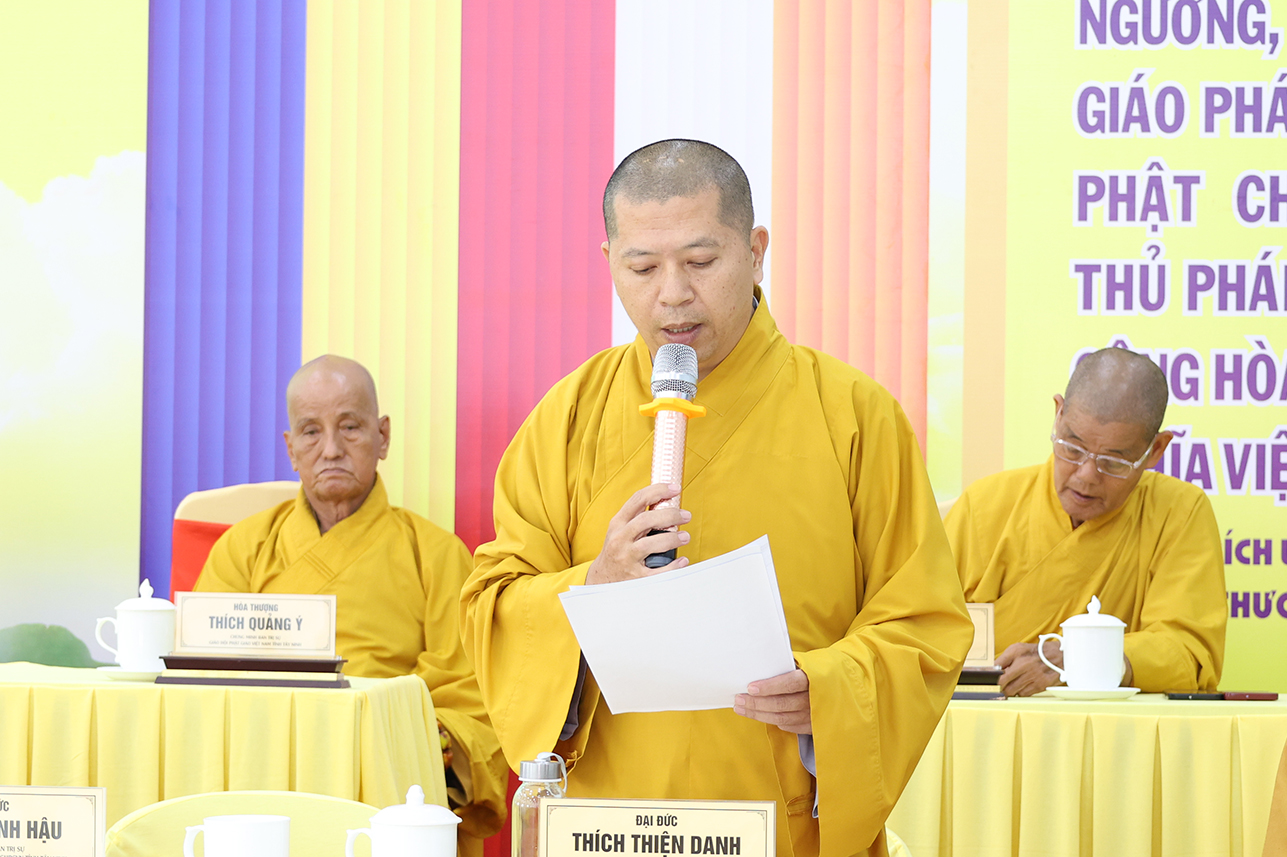 Thay mặt bộ phận Thư ký Văn phòng, ĐĐ. Thích Lệ Duyên – Phó Trưởng ban kiêm Chánh Thư ký BTS GHPGVN tỉnh báo cáo khái quát thành tựu Phật sự của Phật giáo tỉnh nhà sau 3 tháng sáp nhập. Phật giáo tỉnh Tây Ninh sau sáp nhập có 476 cơ sở tự viện, 32 điểm sinh hoạt tôn giáo tập trung, 2102 Tăng Ni tu học, văn phòng BTS đặt tại Chùa Pháp Minh, ấp Giồng Lớn, xã Mỹ Hạnh. Một số Phật sự trọng tâm như: Tổ chức 3 phiên họp Ban Thường trực BTS; tổ chức nhiều lễ tưởng niệm anh linh anh hùng liệt sĩ nhân dịp 27/7 tại Văn phòng BTS, nghĩa trang liệt sĩ tỉnh, khu di tích đồi 82,…; đón tiếp các phái đoàn Tỉnh ủy, HĐND, UBND, UBMTTQ Việt Nam tỉnh, Công an tỉnh, Bộ Chỉ huy Quân sự tỉnh; đảnh lễ khánh tuế Trưởng lão Hòa thượng Chủ tịch HĐTS, Chư Tôn đức lãnh đạo HĐTS, VP2 TW Giáo hội; toàn tỉnh có hơn 2000 Phật tử quy y. Trong đó nổi bật nhất là công tác an sinh xã hội, toàn tỉnh trong ba tháng đạt: 30.270.600.000 đồng (ba mươi tỷ hai trăm bảy mươi triệu sáu trăm nghìn đồng).