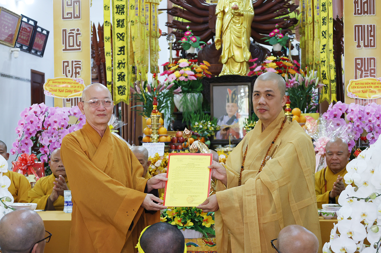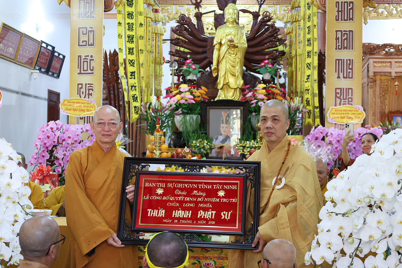 Trong sự hoan hỷ của toàn thể đại chúng, Thượng tọa Thích Quảng Tâm đã trân trọng trao Quyết định và khánh vàng chúc mừng của Ban Trị sự đến Thượng tọa Tân trụ trì, đánh dấu một cột mốc mới trong sự phát triển của chùa Long Nghĩa.
