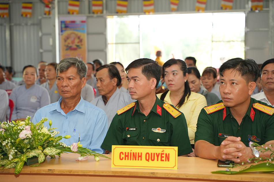 Tham dự buổi lễ có ông Lê Phước Trong – Chính trị viên phó Ban Chỉ huy quân sự huyện; ông Phân Công Quẩn – Chính trị viên, phó Tiểu đoàn 1 thuộc Trung đoàn 738; ông Phạm Văn Tòa – Phó Bí thư kiêm Chủ tịch HĐND xã Thuận Nghĩa Hòa; ông Lê Thanh Hà – Chủ tịch UBMTTQ thị trấn Thạnh Hóa cùng các đại biểu chính quyền theo đoàn. với hơn 200 Phật tử cùng trở về tham dự buổi lễ.
