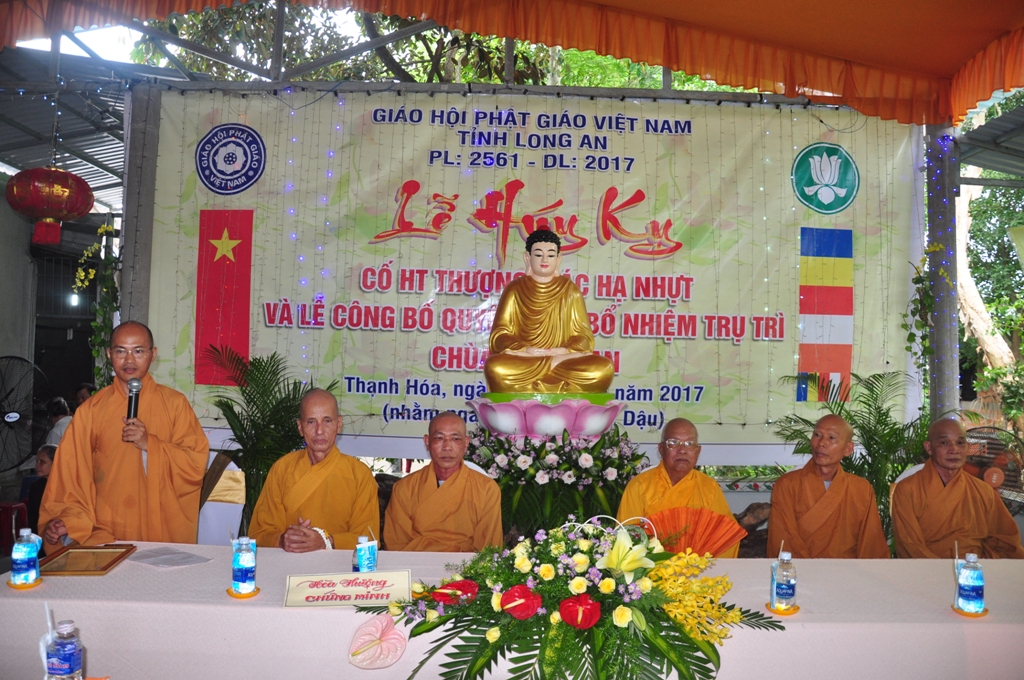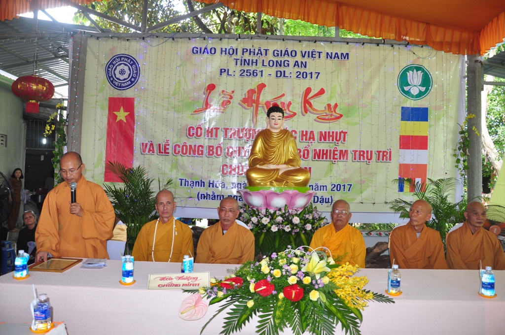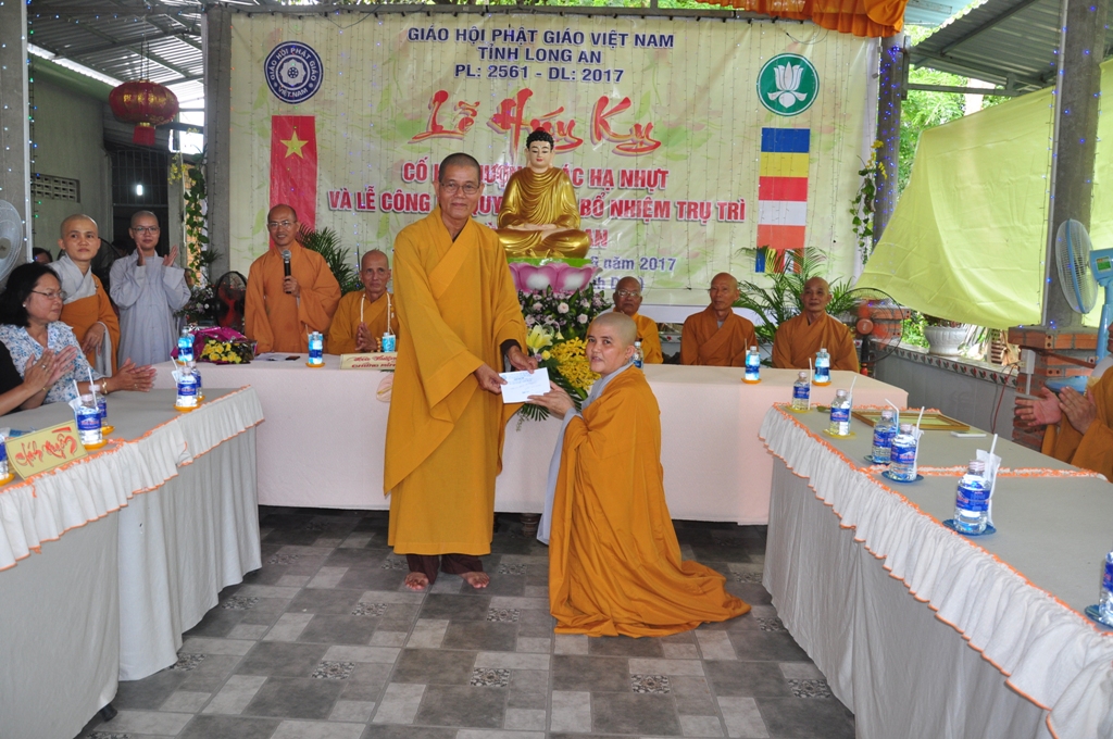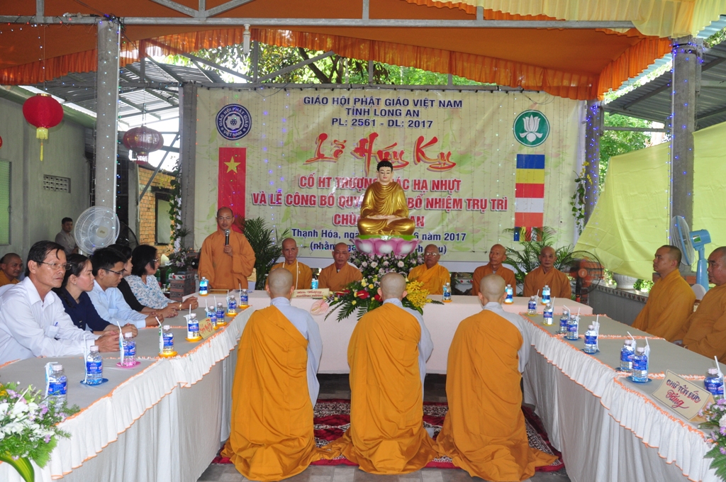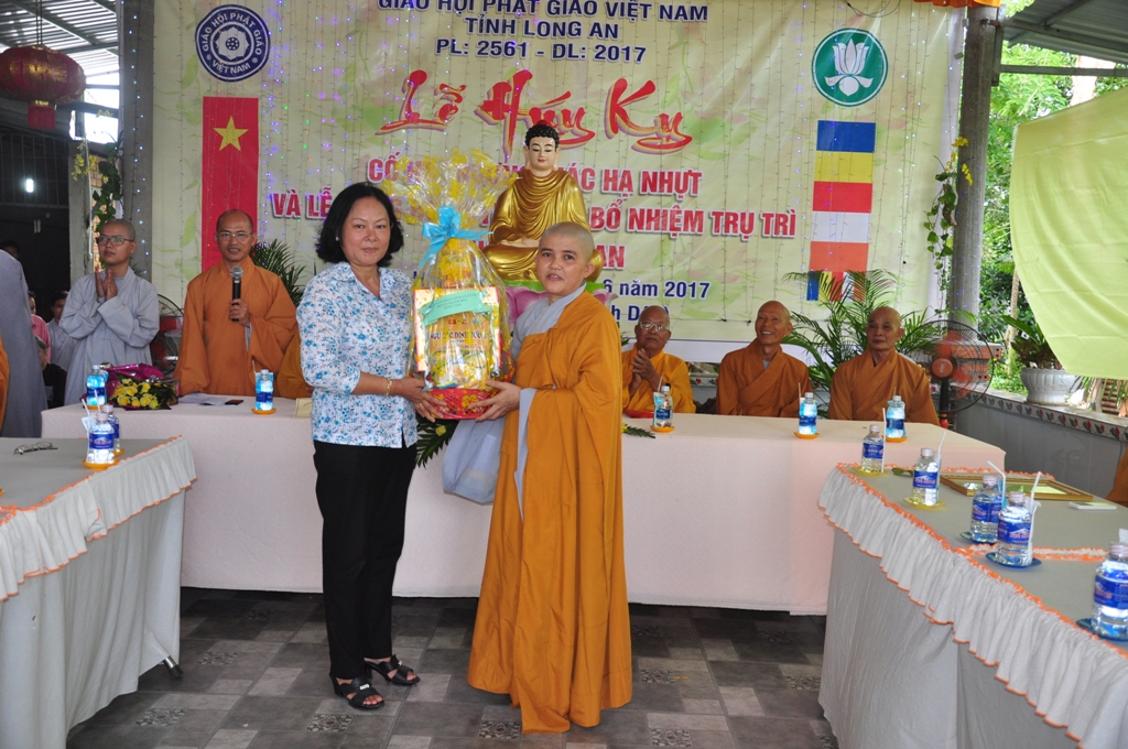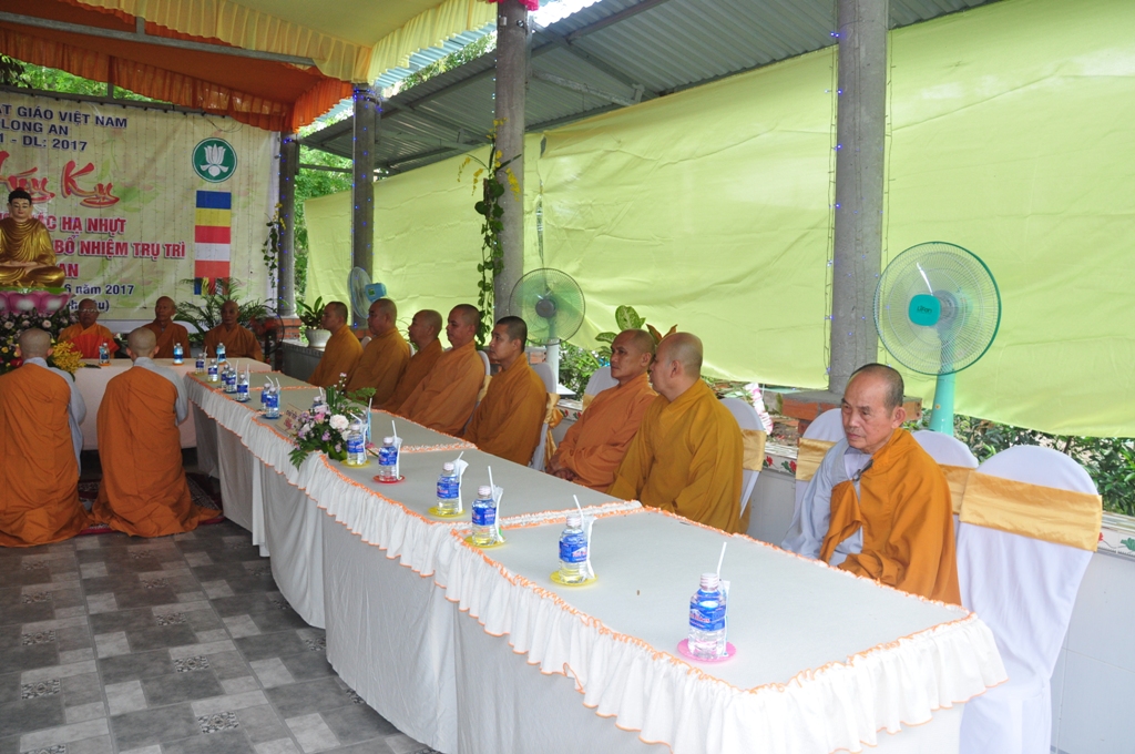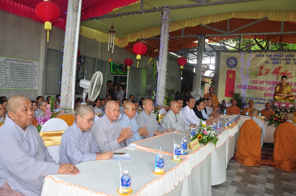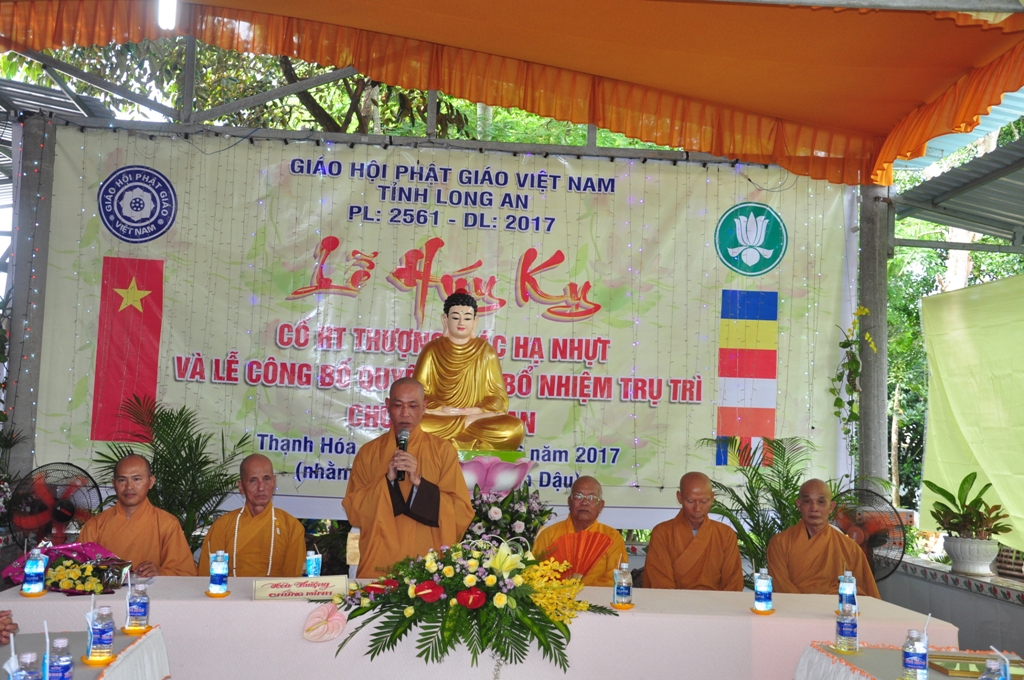 Chứng minh buổi lễ: HT Thích Thiện Huệ – Chứng minh BTS GHPGVN tỉnh Long An; HT Thích Thiện Tâm – Phó trưởng ban BTS kiêm trưởng ban Kiểm soát GHPGVN tỉnh Long An; HT Thích Huệ Hồng – Phó trưởng ban BTS GHPGVN tỉnh Long An, chứng minh BTS GHPGVN huyện Thạnh Hoá; HT Thích Quảng Ý – Trưởng ban BTS GHPGVN liên huyện Tân Thạnh – Kiến Tường – Vĩnh Hưng; ĐĐ Thích Lệ Trí – UV HĐTS, Chánh thư ký BTS GHPVN tỉnh Long An; ĐĐ Thích Lệ Tấn – Phó ban thường trực BTS GHPGVN liên huyện Tân Thạnh – Kiến Tường – Vĩnh Hưng; NT Thích nữ Như Phương – Chứng minh phân ban Ni giới BTS GHPGVN quận Bình Tân; NS Thích nữ Như Hương – Trưởng ban BTS GHPGVN huyện Thạnh Hoá; NS Thích nữ Diệu Phước – UV TT BTS GHPGVN tỉnh Long An.