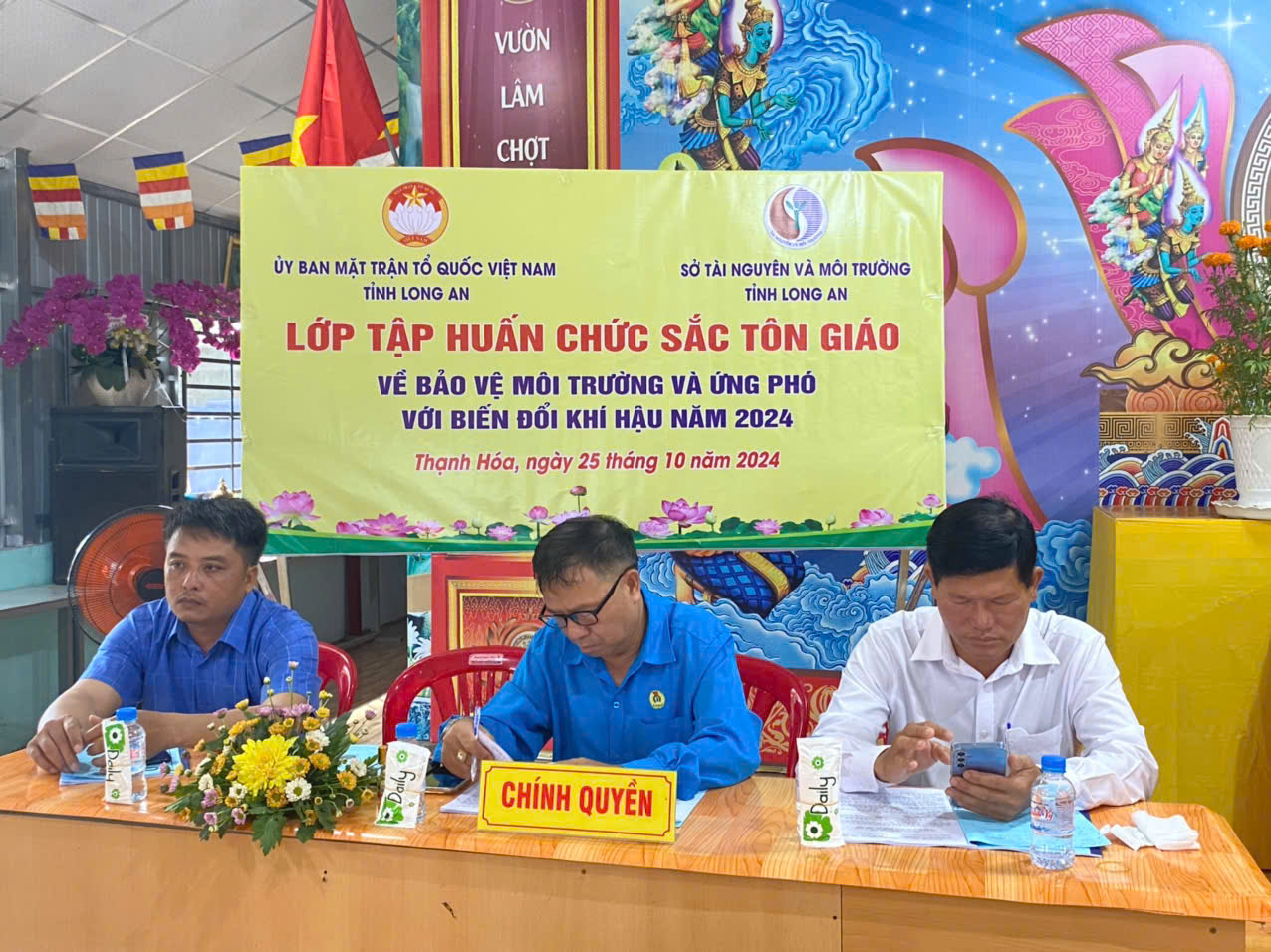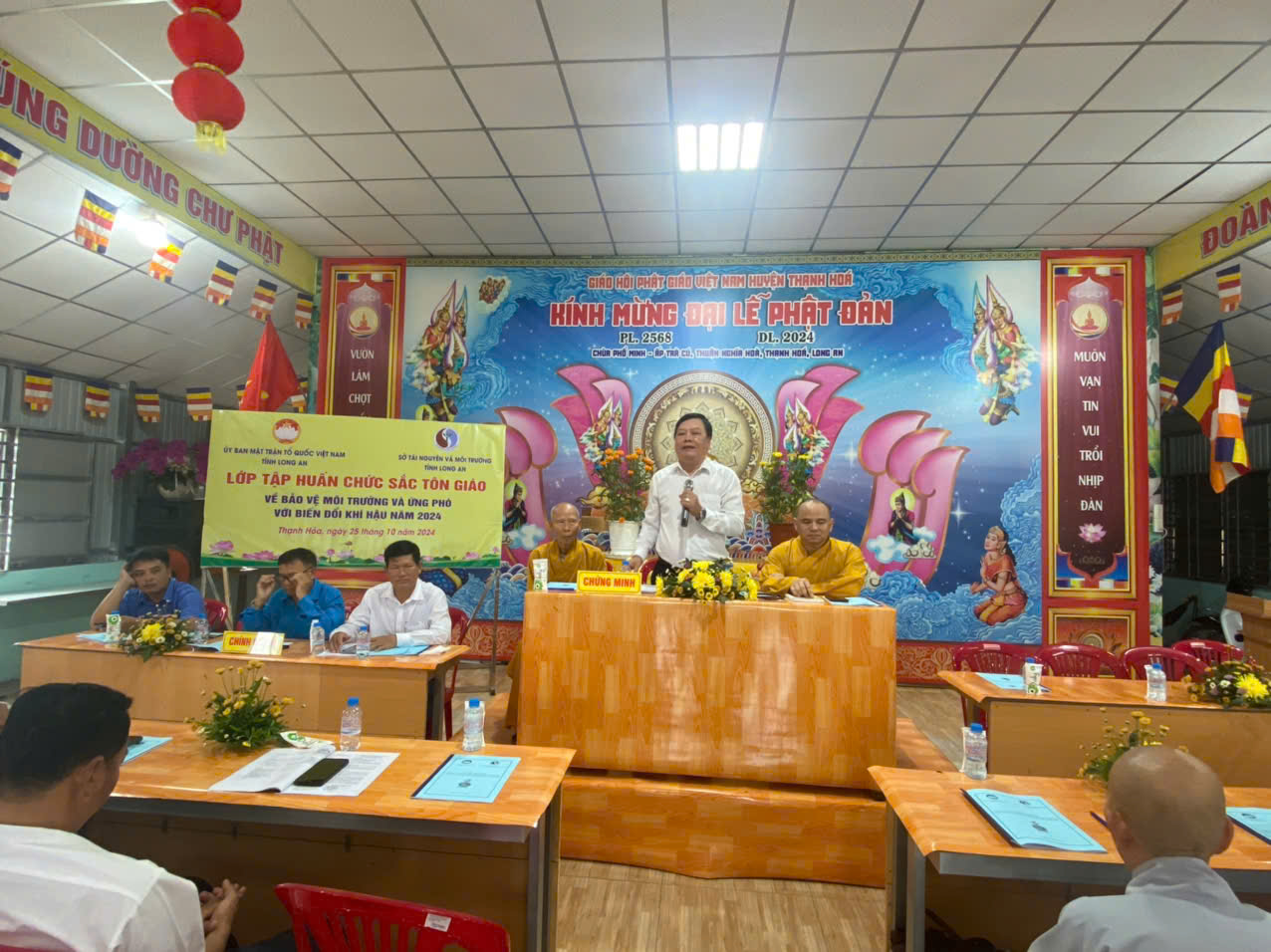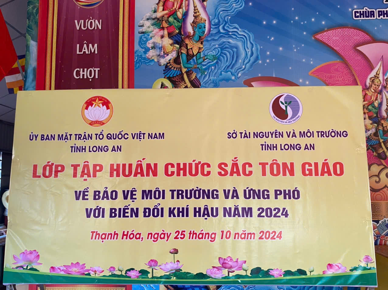 Thực hiện chương trình phối hợp giữa Ban Thường trực Uỷ ban Trung ương Mặt trận Tổ quốc VN tỉnh Long An, Sở Tài nguyên và Môi trường tỉnh Long An, Uỷ ban Mặt trận Tổ quốc VN huyện Thạnh Hoá và Ban Trị sự GHPGVN huyện Thạnh Hoá, vào ngày 25/10/2024, tại văn phòng Ban Trị sự GHPGVN huyện Thạnh Hóa (Chùa Phổ Minh ấp Trà Cú, xã Thuận Nghĩa Hoà, huyện Thạnh Hóa, tỉnh Long An) tổ chức lớp tập huấn chức sắc Tôn giáo về bảo vệ Môi trường và Ứng phó với biến đổi khí hậu năm 2024.