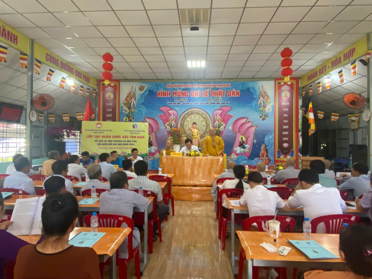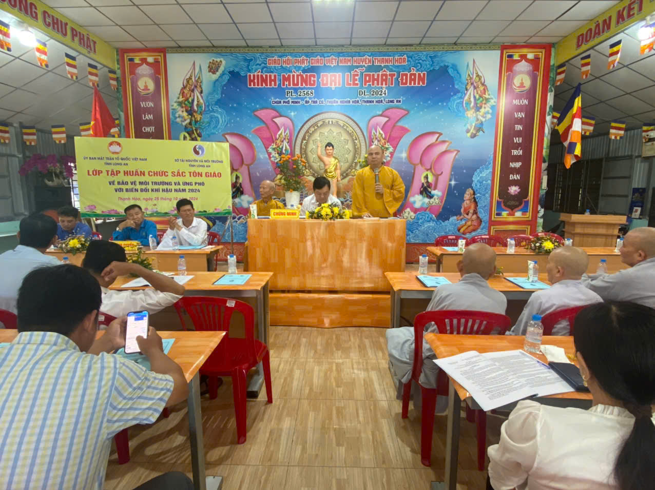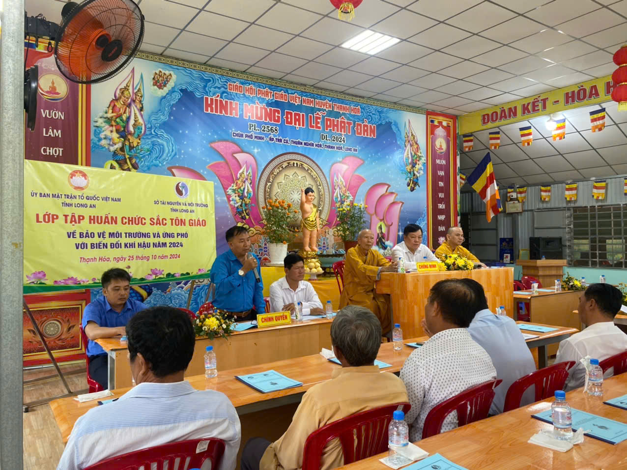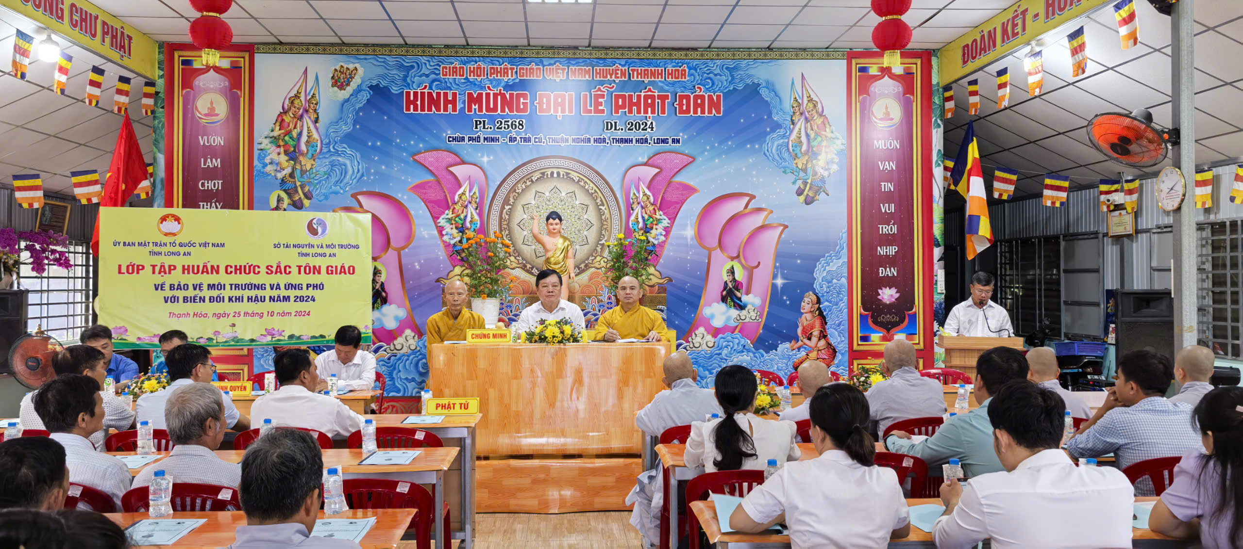 Thực hiện chương trình phối hợp giữa Ban Thường trực Uỷ ban Trung ương Mặt trận Tổ quốc VN tỉnh Long An, Sở Tài nguyên và Môi trường tỉnh Long An, Uỷ ban Mặt trận Tổ quốc VN huyện Thạnh Hoá và Ban Trị sự GHPGVN huyện Thạnh Hoá, vào ngày 25/10/2024, tại văn phòng Ban Trị sự GHPGVN huyện Thạnh Hóa (Chùa Phổ Minh ấp Trà Cú, xã Thuận Nghĩa Hoà, huyện Thạnh Hóa, tỉnh Long An) tổ chức lớp tập huấn chức sắc Tôn giáo về bảo vệ Môi trường và Ứng phó với biến đổi khí hậu năm 2024.
