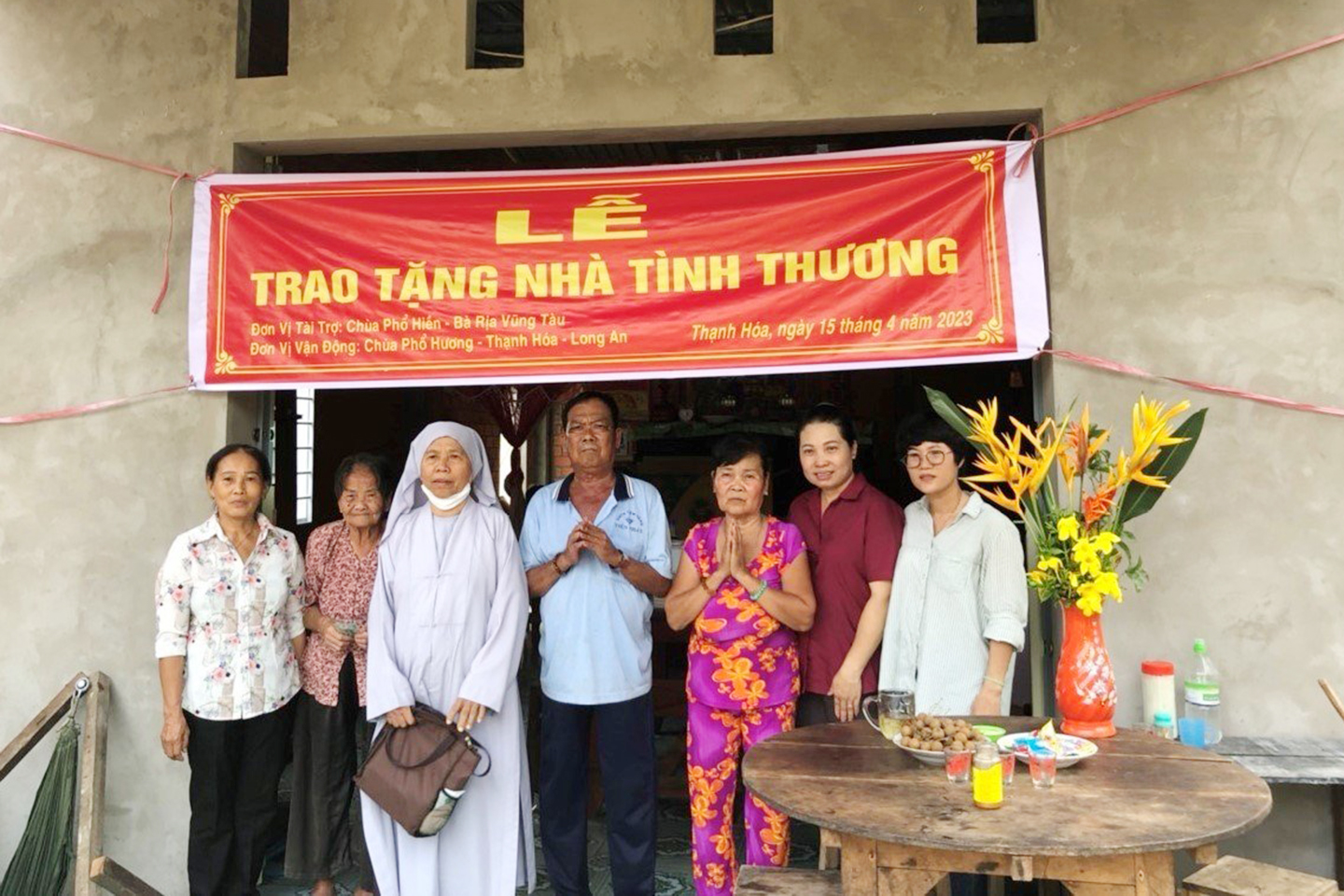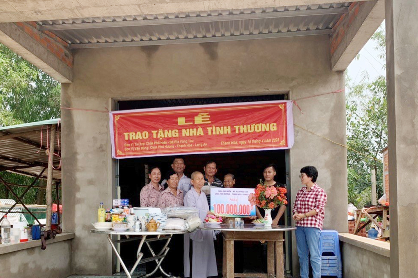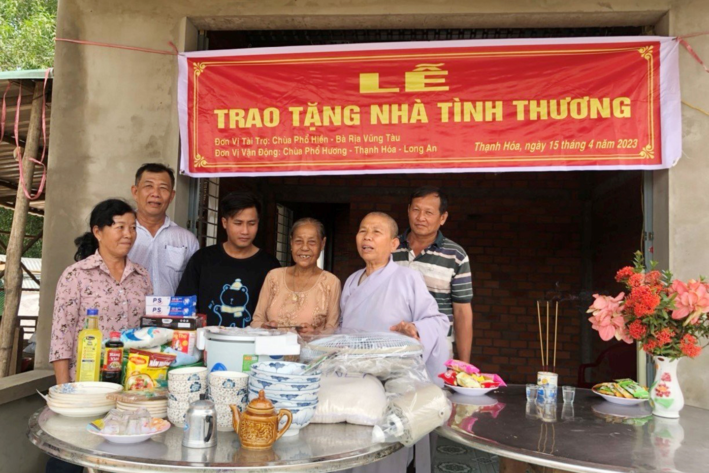 Ngày 15/4/2023, Đơn vị vận động là Ni trưởng Thích Nữ Như Hương – Chứng minh BTS GHPGVN huyện Thạnh Hóa, Trụ trì Chùa Phổ Hương (Khu phố 1, thị trấn Thạnh Hóa- Long An) và đơn vị tài trợ Ni trưởng Tâm Nguyệt – Trụ trì Chùa Phổ Hiền , Địa chỉ 202 Tôn Thất Tùng , phường Phú Mỹ, Thị xã Phú Mỹ, tỉnh Bà Rịa Vũng Tàu phối hợp với các chính quyền địa phương là xã Thạnh An, Thuận Bình, Thị Trấn Thạnh Hóa, Tân Tây làm Lễ trao tặng nhà “tình thương” cho hộ cận nghèo, hộ có hoàn cảnh đặc biệt khó khăn