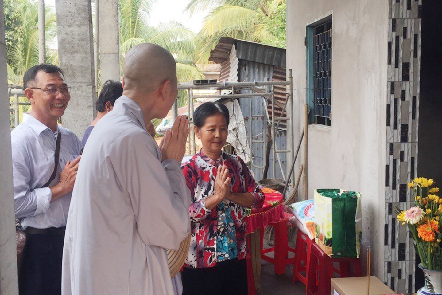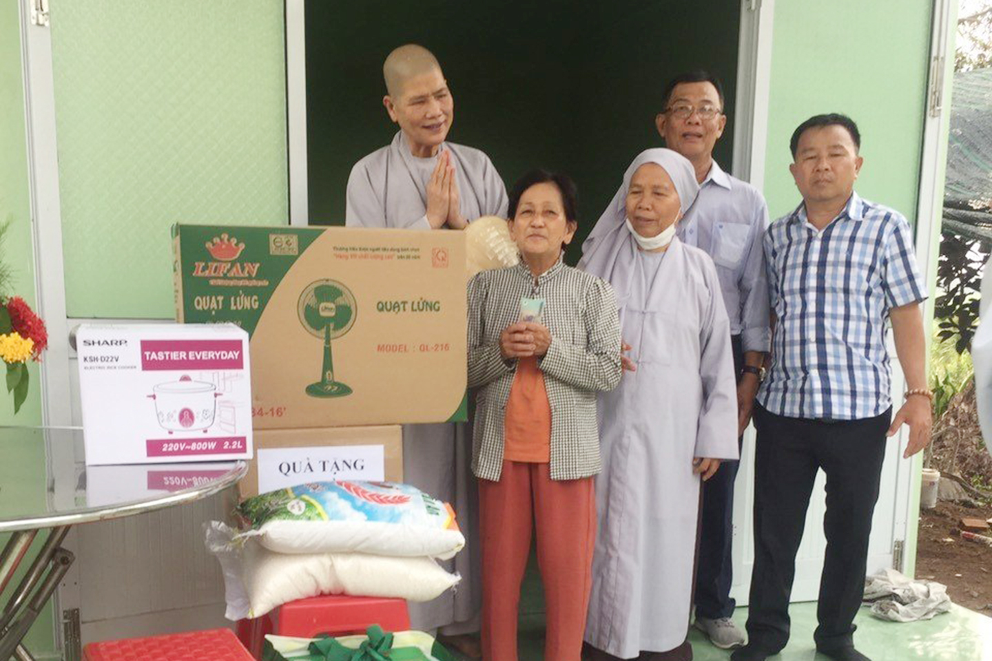 Ni trưởng Tâm Nguyệt – Trụ trì Chùa Phổ Hiền còn trao 10 phần quà cho các hộ khó khăn của huyện Thạnh Hóa, mỗi phần là 1 triệu đồng trong ngày bàn giao nhà cho các hộ gia đình.