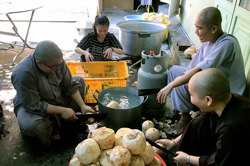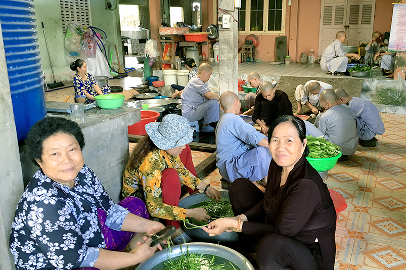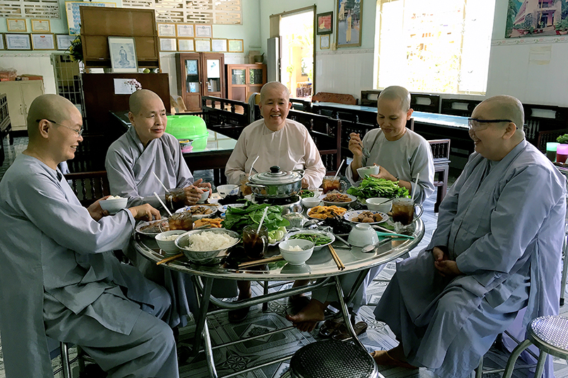 Con biết trước khi mở trường, chùa mình tụng kinh nhiều lắm, nhưng từ khi học trò trở về tu học, Thầy chỉ cho tụng hai thời công phu sớm tối để thời gian cho chúng học bài. Ngoài công tác chúng, và mỗi năm làm hai mùa lúa (năm 1992 mở khóa học đầu tiên, chùa mình đến 125 học trò đến học, lúc đó kinh tế khó khăn, Thầy nói nếu mình không làm ruộng thì chính quyền sẽ làm khó mình về mặt kinh phí, cho nên Thầy khuyên đại chúng rán phụ Thầy làm ruộng), Thầy ít khi để đại chúng làm việc gì ảnh hưởng đến việc tu học. Con nhớ có lần phái đoàn Phật tử từ thành phố Hồ Chí Minh xuống thăm và cúng dường trường, họ thấy chúng con ở trong những căn phòng trên lợp lá dừa, vách cũng lá dừa, nền đất đầy bụi xổm lên. Quý Phật tử xin Thầy cho họ cúng gạch lót nền để quý cô ở cho sạch sẽ. Thầy nói, muốn làm thì đợi khi quý cô nghỉ hè hoặc nghỉ tết rồi xuống làm chứ giờ đang học, bày ra làm ảnh hưởng giờ giấc tu học của quý cô. Nhiều người đến xin Thầy mở phòng may, phòng phát hành để có thêm thu nhập nuôi chúng, Thầy đều từ chối. Thầy nói để chúng con yên tu, ‘đức chúng như hải’, mỗi người đến đây đều đem theo phước của họ đến, chứ đâu phải mình phải nuôi họ mà lo thiếu, đệ tử Phật không ai bị đói cả, ‘có đức mặc sức mà ăn’. Trên thực tế chùa còn nhờ vào phước đức của đại chúng nữa đó, cho nên mình đừng nghĩ là mình lo cho họ.