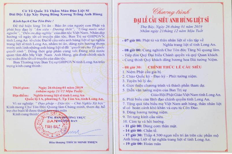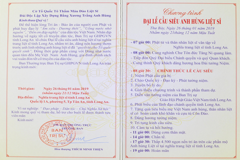 – 07 giờ 00 : Phật tử và thân nhân liệt sĩ vân tập về nghĩa trang liệt sĩ tỉnh Long An.
