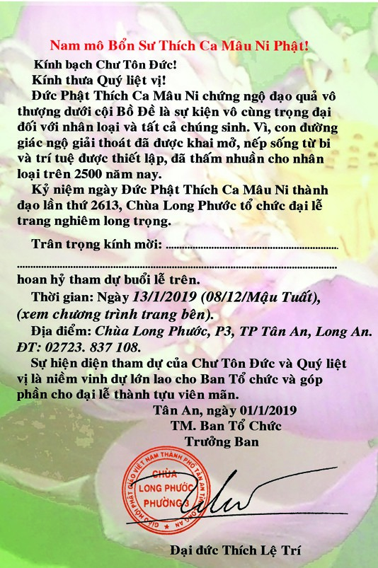 Kỷ niệm ngày Đức Phật Thích Ca Mâu Ni thành đạo PL 2563 – DL 2019, Chùa Long Phước tổ chức trọng thể Đại Lễ Thành Đạo PL 2563 vào lúc 18 giờ 30, 13/1/2019 (08/12/Mậu Tuất) tại Chùa Long Phước (P3, TP Tân An, Long An).
