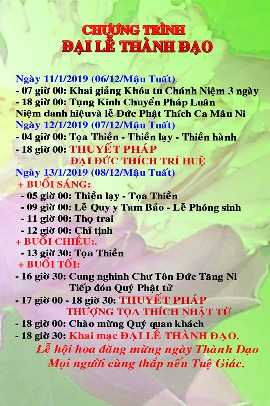 Ngày mai, 12/1/2019: (07/12/Mậu Tuất), từ 4 giờ sáng, đạo tràng tụng kinh, thiền tọa, thiền hành và thiền lạy. Lúc 18 giờ 00, Đại đức Thích Trí Huệ thuyết pháp.