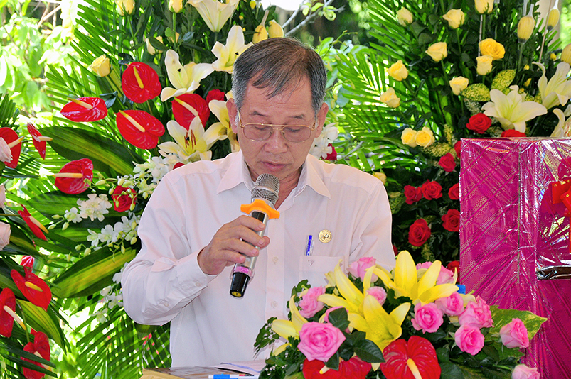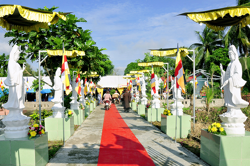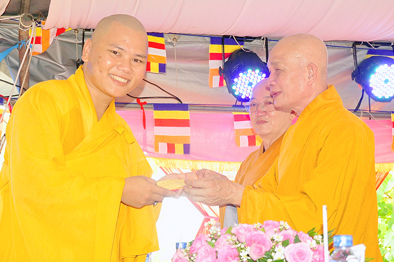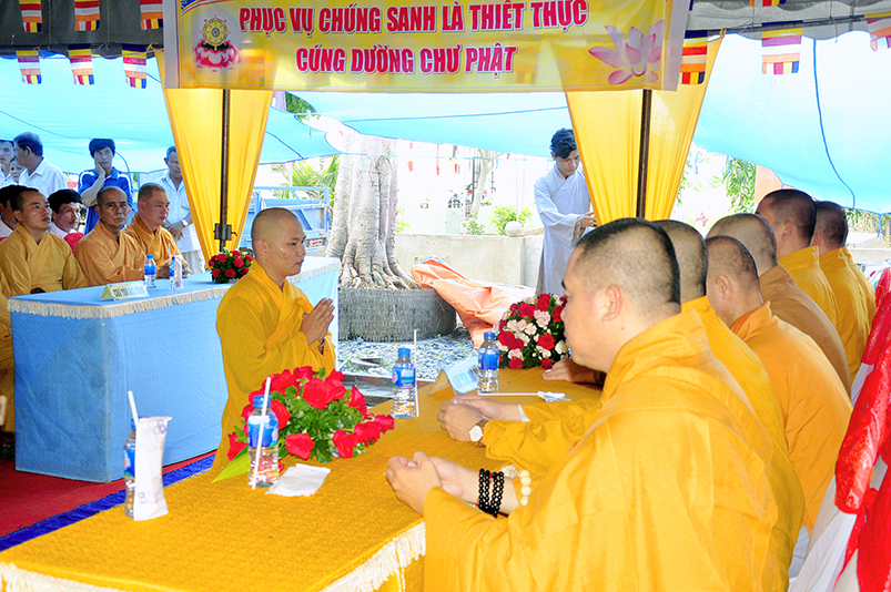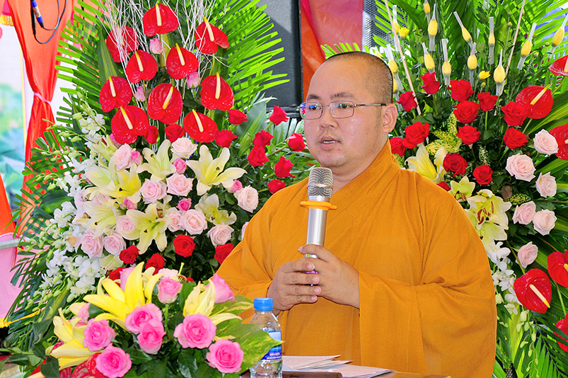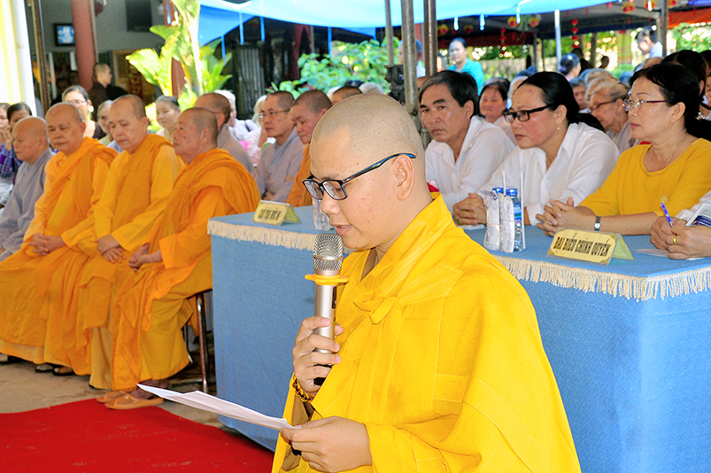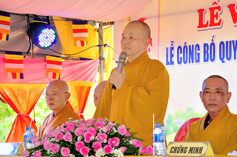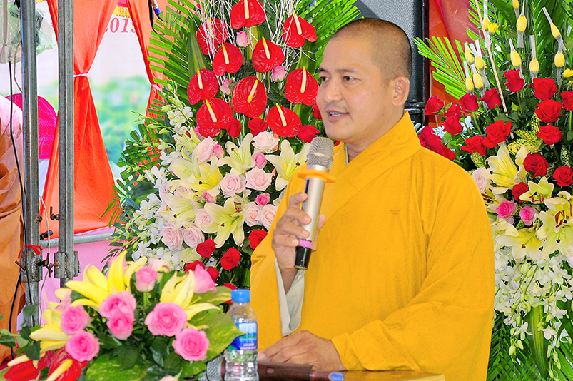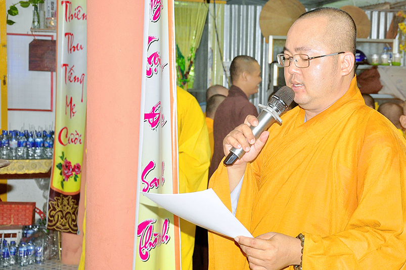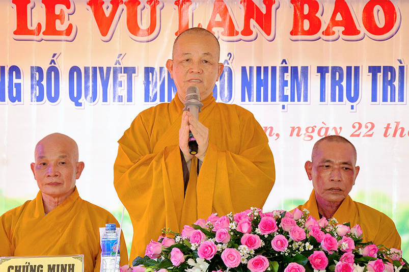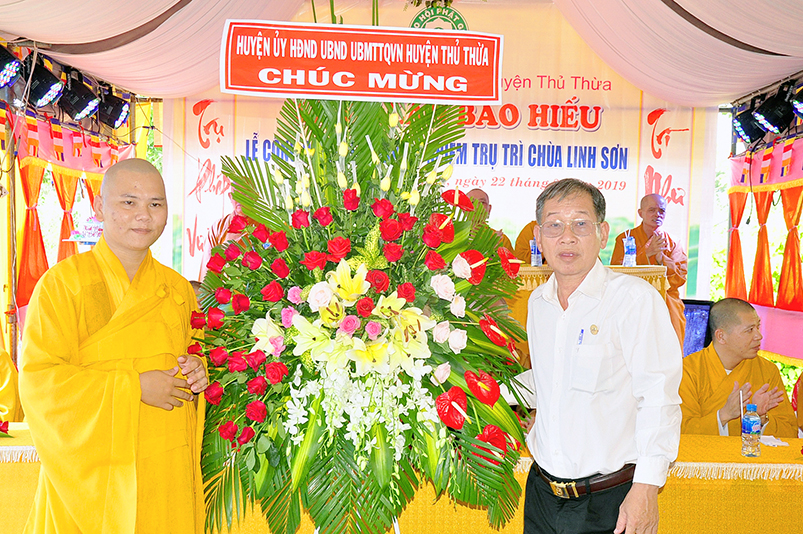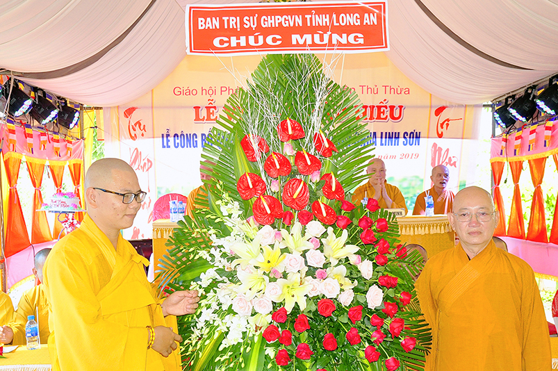 Đại diện lãnh đạo BTS. GHPGVN Tỉnh Long An Hòa thượng Thích Minh Thiện từ mẫn ban Đạo từ và hoan hỷ chúc mừng buổi lễ. Hòa thượng nhắc lại giai đoạn lịch sử khi thành lập ngôi chùa cho đến nay trãi qua biết bao thăng trầm. Lần này về lại ngôi chùa Hòa thượng thấy có nhiều đổi mới, và nhận thấy đó là sự cố gắng khắc phục rất lớn của Đại đức Tân Trụ trì. Hòa thượng hy vọng với lòng nhiệt quyết của sức trẻ, và sự xuất gia đúng đắn, Đại đức Tân Trụ trì sẽ cũng với chính quyền địa phương cùng đồng bào Phật tử phát triển quê hương làng xã cho được tốt đẹp, tạo điều kiện đường xá thuận lợi để đồng bào thường đến chùa sinh hoạt, nâng cao chất lượng sống, tích cực góp phần xây dựng nông thôn đổi mới.