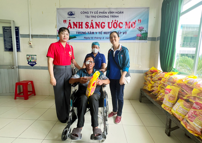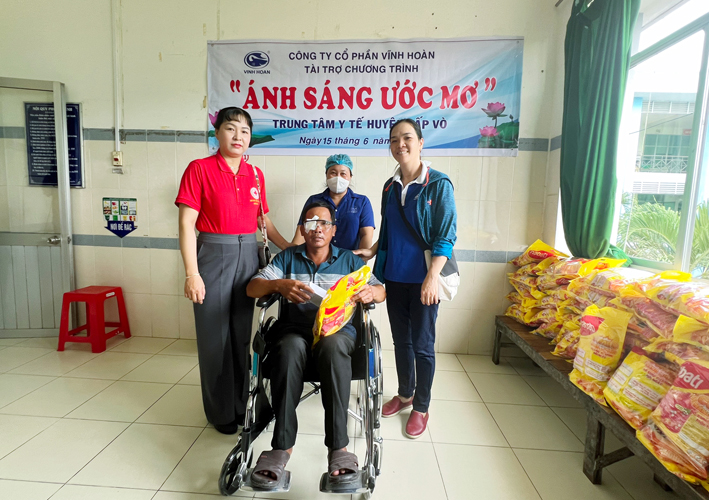 Sau khi hoàn thành ca phẫu thuật, các bà con ở xa được Công ty Vĩnh Hoàn hỗ trợ kinh phí xe, tặng 1 phần quà kèm bì thư và một cặp mắt kiếng bảo hộ.