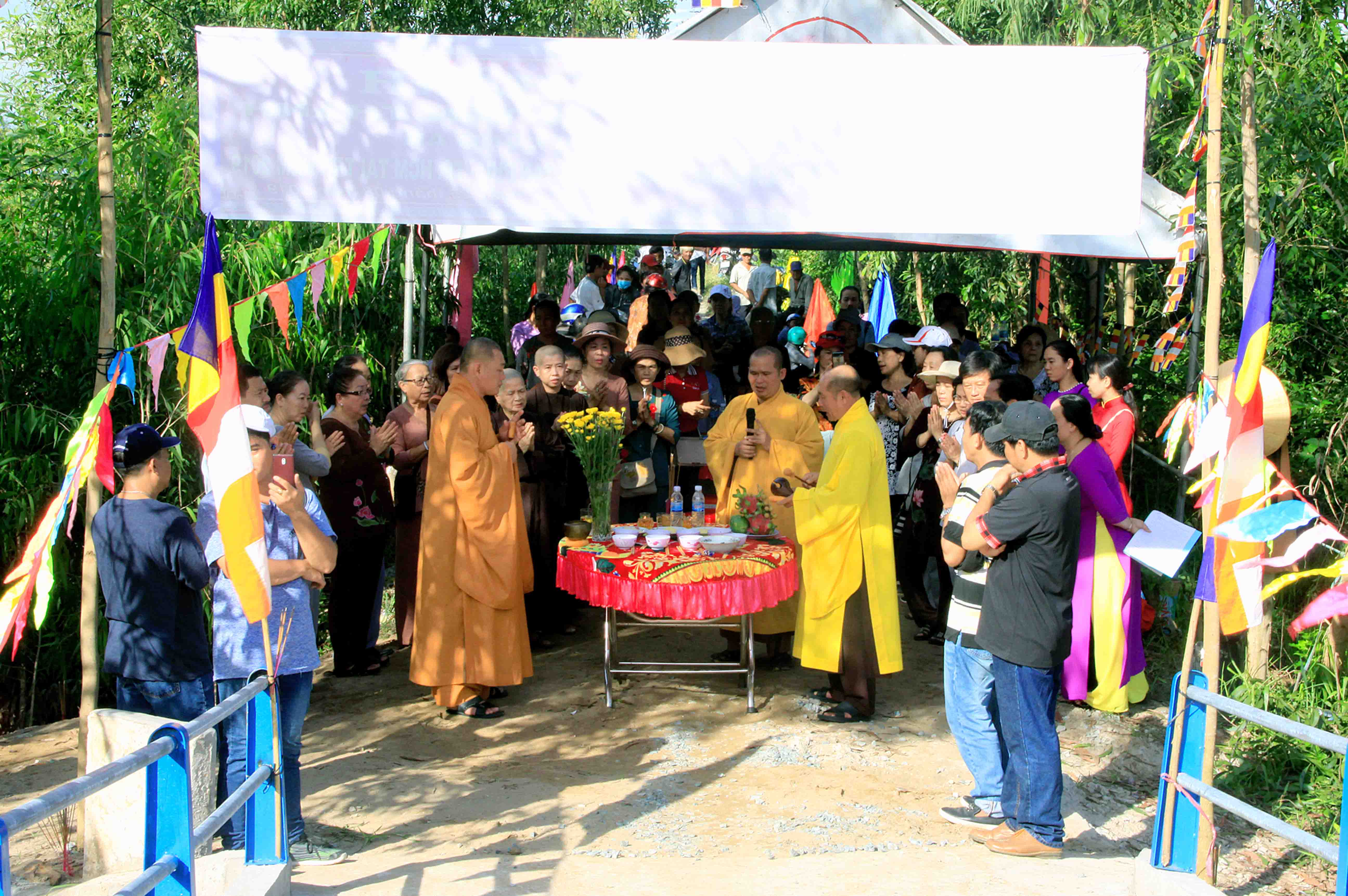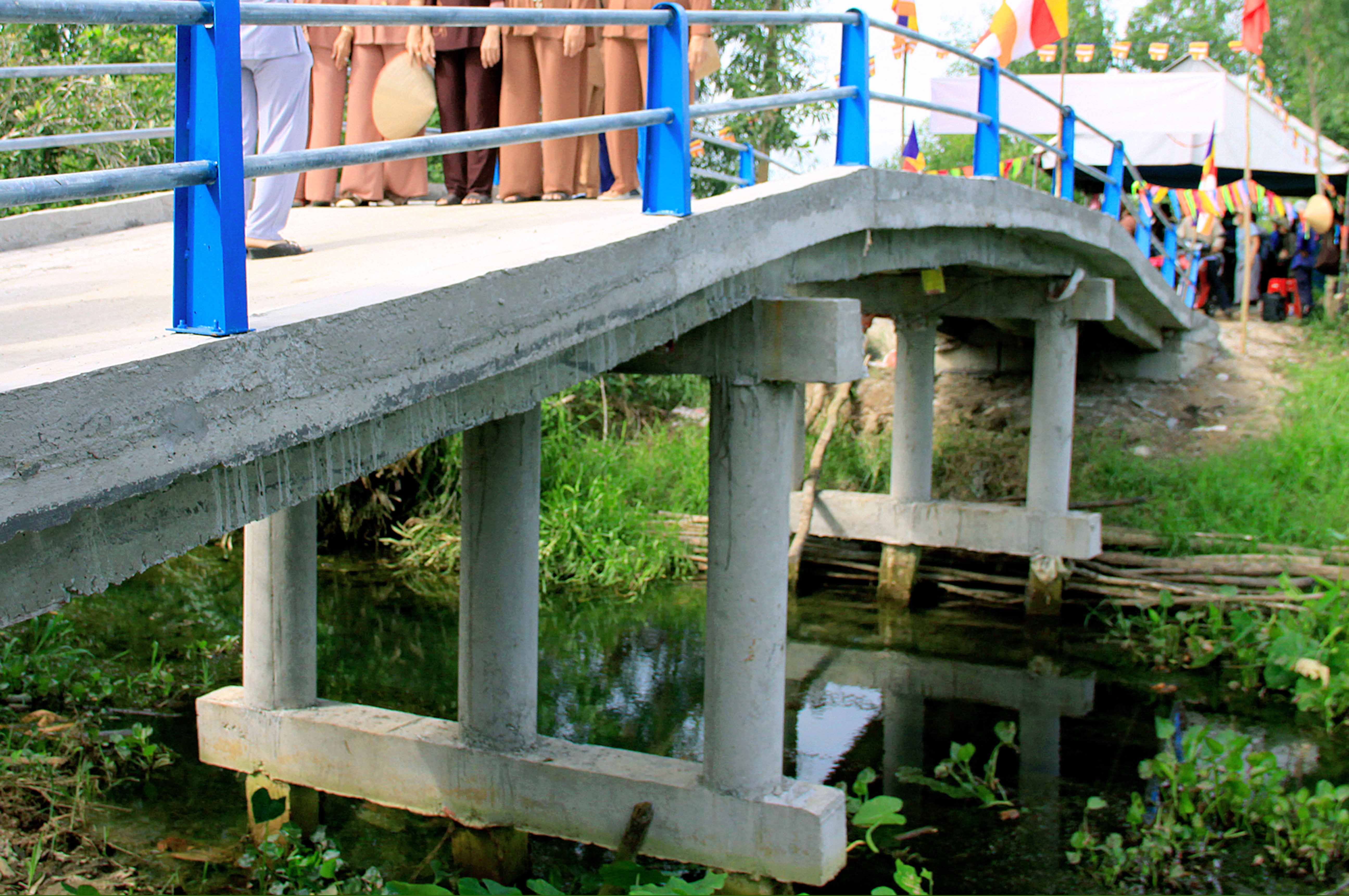 Mở đầu buổi lễ là báo cáo sơ bộ quá trình thi công cầu Gò Cỏ Đỏ do ông Nguyễn Văn Nhịn phát biểu cho biết cây cầu thi công trong 2 tháng, được làm bằng bê tông cốt thép, chiều dài 25 mét, rộng 3 mét, tổng kinh phí là 165 triệu đồng; Ni Trưởng Thích Nữ Như Lộc và Phật tử chùa tài trợ 145 triệu đồng, số còn lại là Chính quyền địa phương và nhân dân đóng góp.