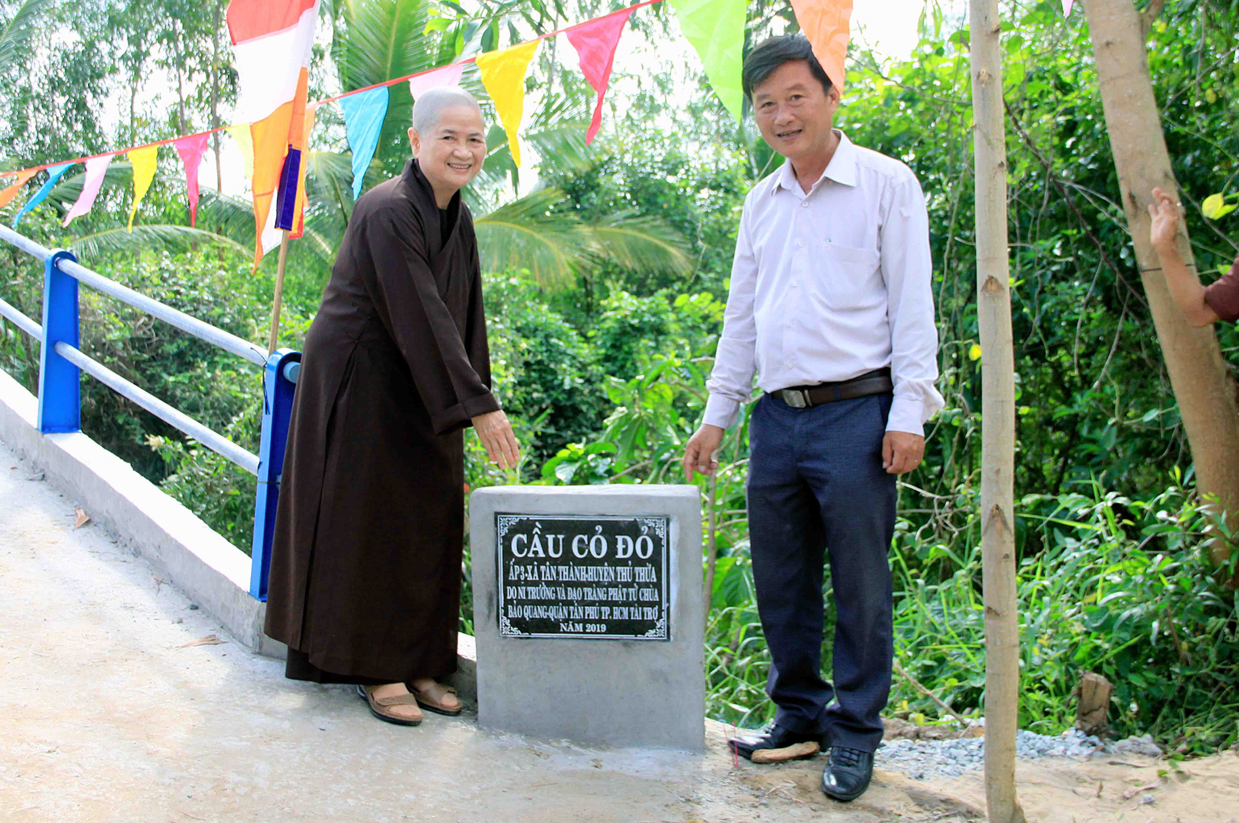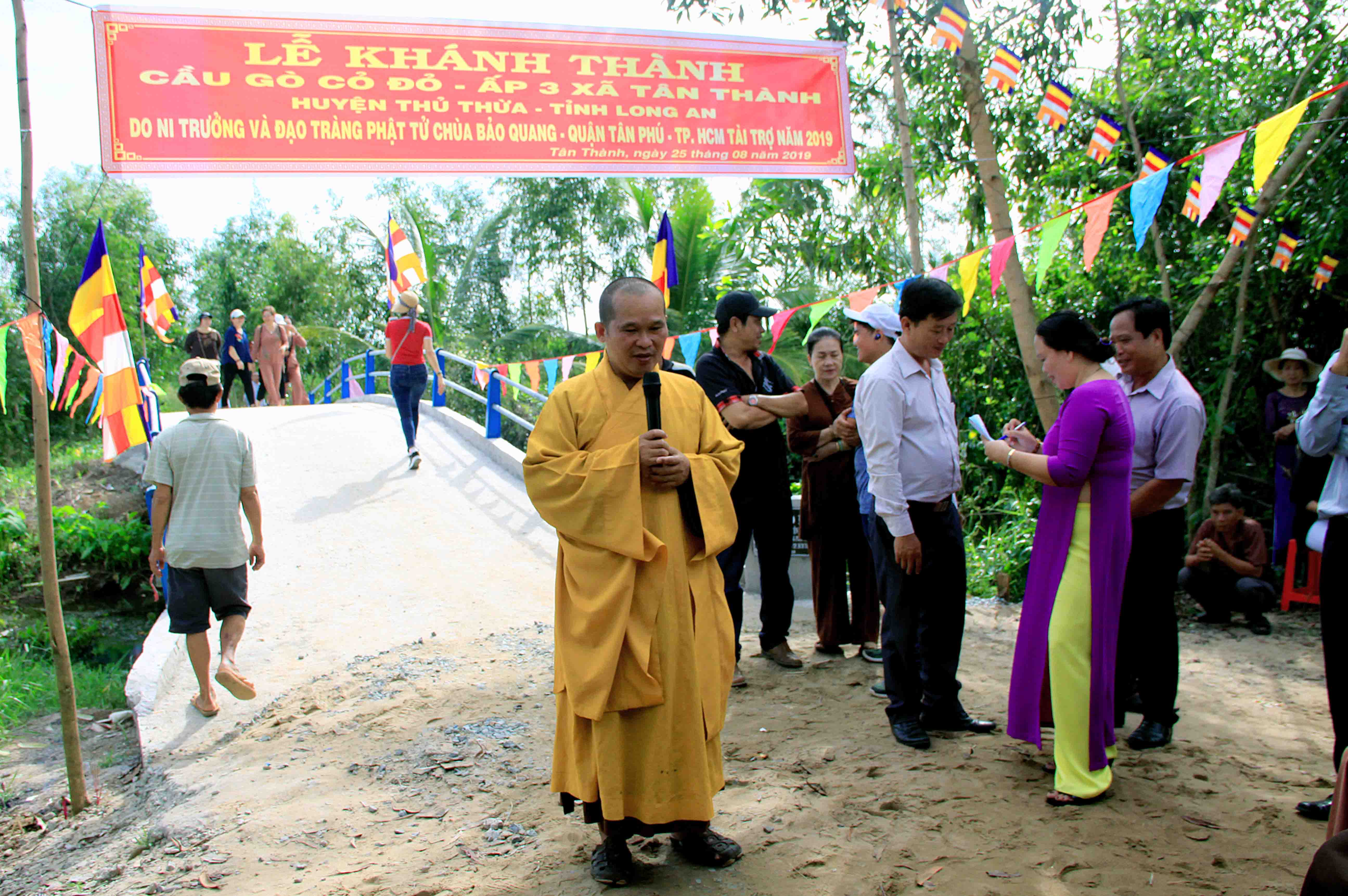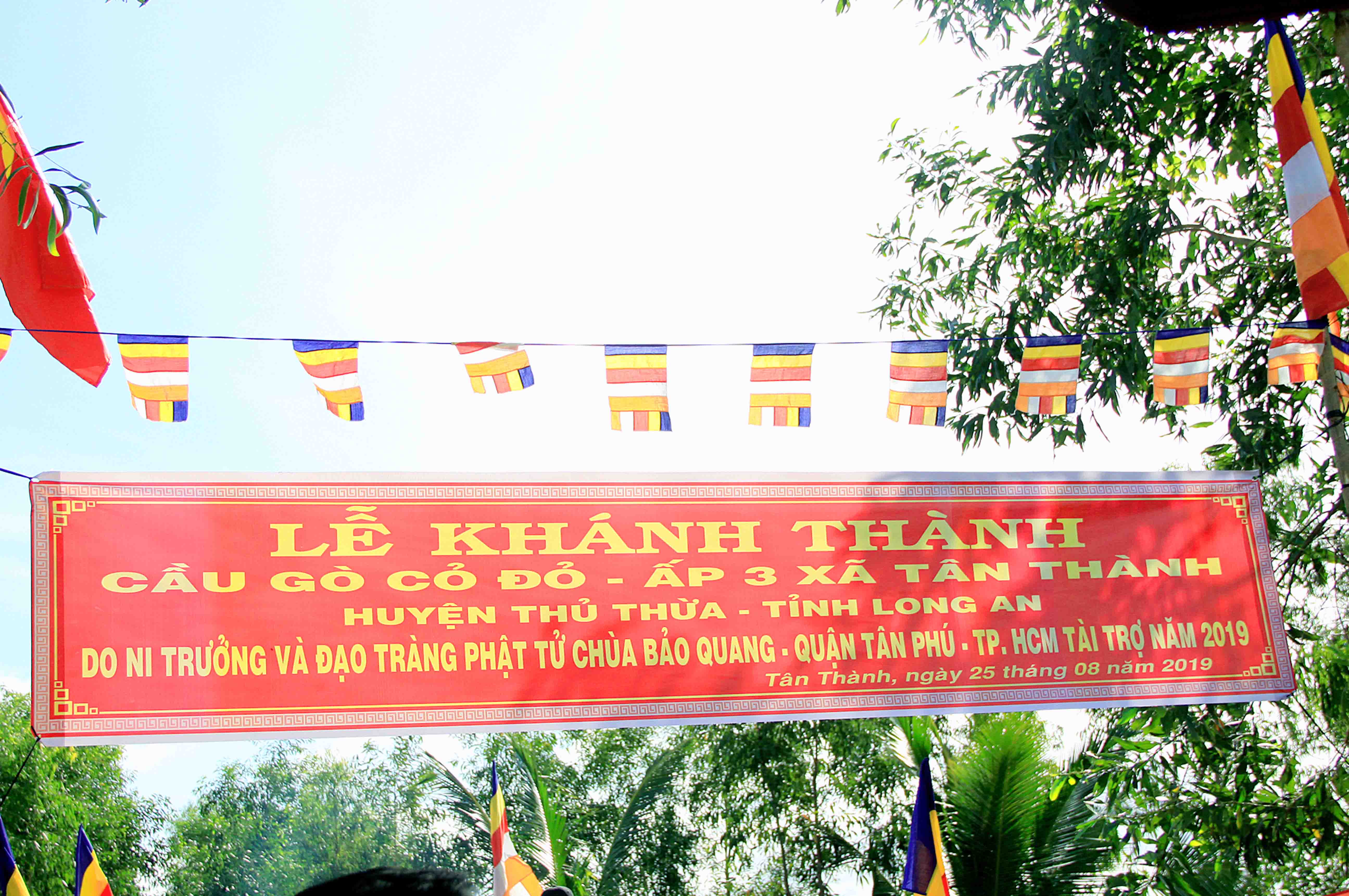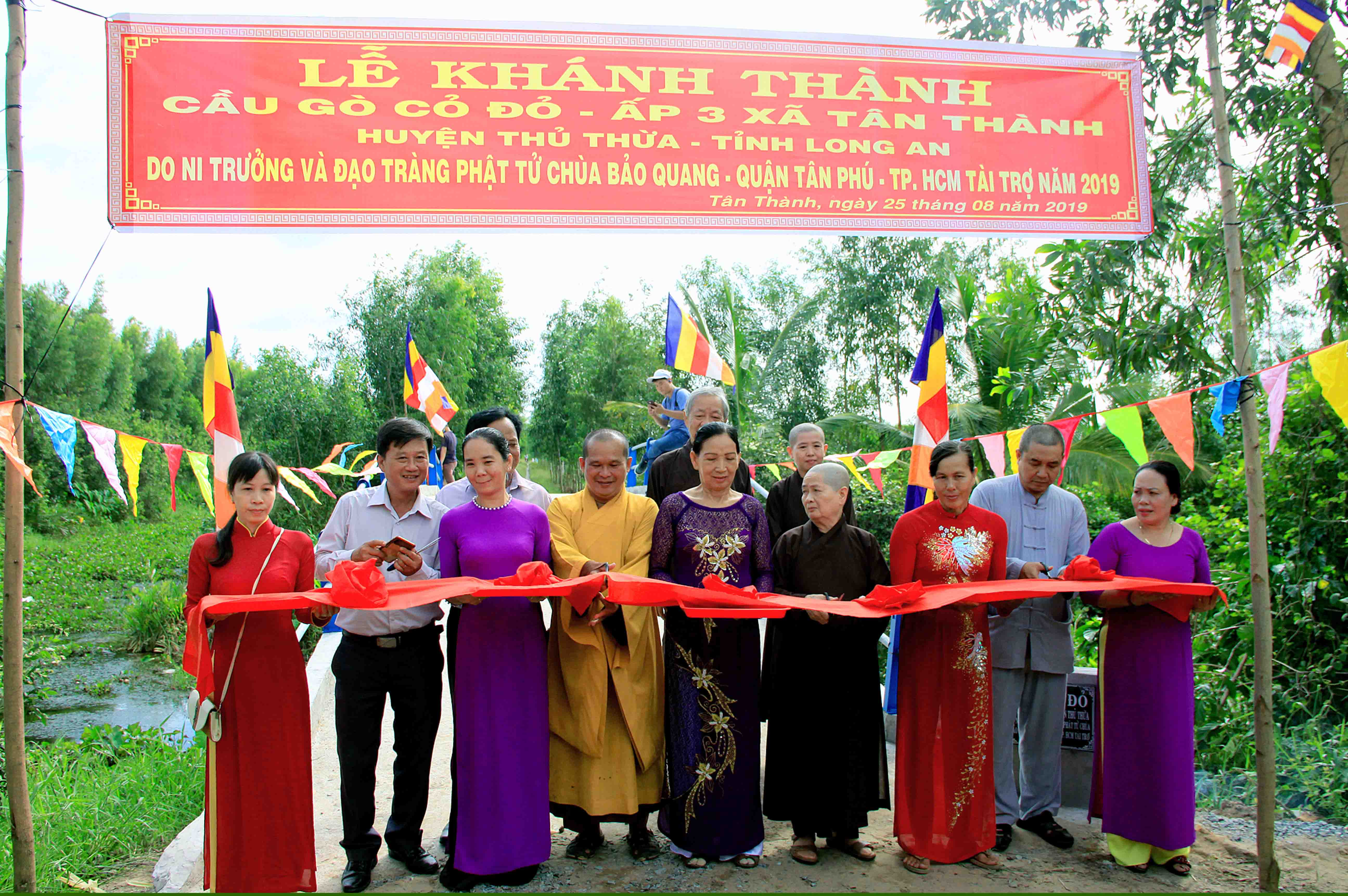 Sáng nay, ngày 25 tháng 8 năm 2019 (Nhằm 25/7 Kỷ Hợi), được sự chỉ đạo của Hòa Thượng Thích Minh Thiện – UV HĐTS, Phó Trưởng Ban Hoằng Pháp Trung Ương, Trưởng Ban Trị Sự GHPGVN tỉnh Long An, Ban Từ Thiện Xã Hội GHPGVN huyện Thủ Thừa do Đại Đức Thích An Điền – Trưởng Ban Từ Thiện Xã Hội Phật Giáo Việt Nam huyện Thủ Thừa đã đón tiếp Ni Trưởng Thích nữ Như Lộc và phái đoàn Chùa Bảo Quang, quận Tân Phú, Tp. HCM trở về dự lễ Khánh thành cầu Gò Cỏ Đỏ.