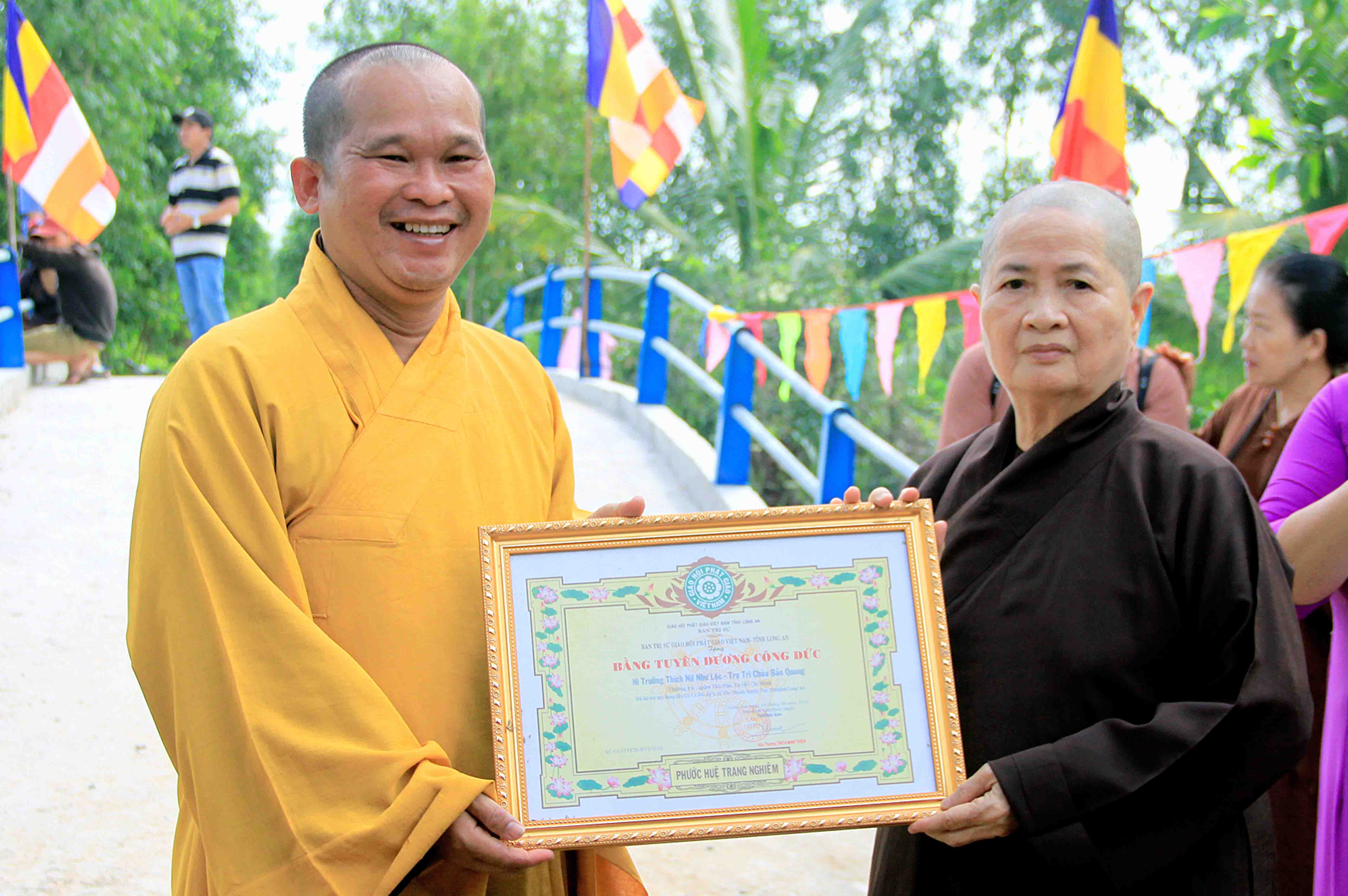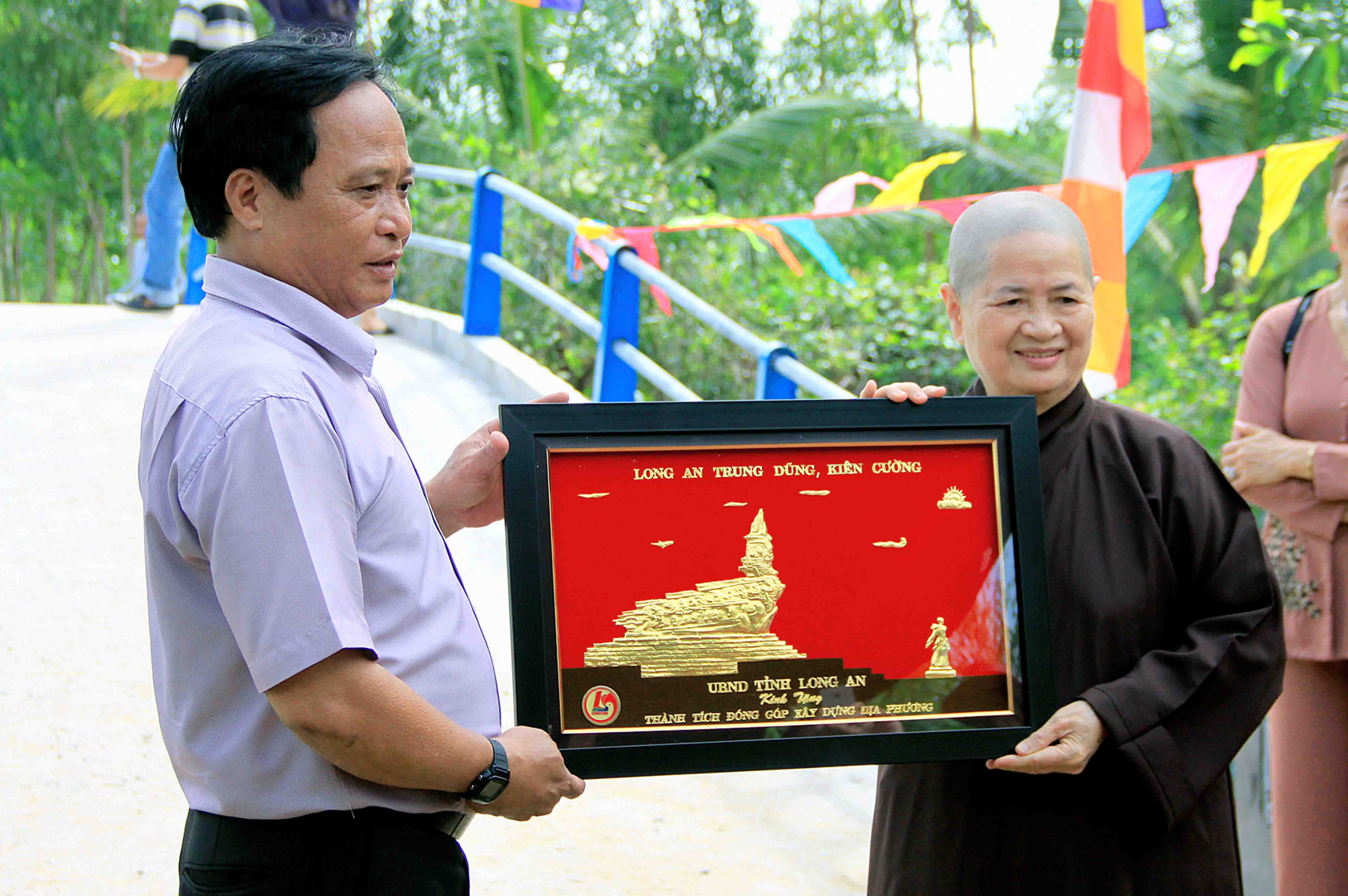 Ông Hồ Phước Hùng gửi tặng đến Ni Trưởng giấy khen của UBND tỉnh Long An, Đại Đức Thích An Điền đại diện cho Thường trực Ban Trị Sự GHPGVN tỉnh Long An gửi tặng bằng Tuyên Dương Công Đức đến Ni trưởng Như Lộc.
