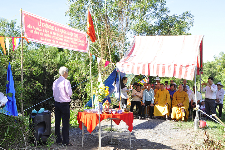 Đại diện Phật giáo tỉnh Long An và huyện Thủ Thừa ĐĐ. Thích Hóa Minh thừa ủy nhiệm HT. Thích Minh Thiện- Trưởng Ban Trị Sự GHPGVN tỉnh Long An nhắn gửi chúc sức khỏe đến quý cấp lãnh đạo Chính quyền và bà con nhân dân địa phương. Đại đức tri ân đến HT. Thích Thích Phước Toàn, Ngài đã nhiều lần về nơi huyện Thủ Thừa ủng hộ trong công việc nông thôn mới xây dựng nhiều cây cầu tại huyện Thủ Thừa. Đại đức cũng cảm ơn Phật tử Tâm Tín là cầu nối giữa các nhà tài trợ tại Tp. HCM với Phật giáo Long An, xuyên suốt nhiều năm qua, làm nhiều công việc phúc lợi, nhất là xây cây cầu nông thôn. Đại đức nhận định quý cấp lãnh đạo Chính quyền luôn quan tâm chăm lo đời sống bà con nhân dân. Đại đức cũng nhắn gửi đến bà con nhân dân trong quá trình thi công cùng nhau đóng góp công sức và giám sát công trình để đạt được hiểu quả tốt nhất. Khi công trình hoàn thành bà con luôn luôn ý thức bảo vệ để được sử dụng lâu bền. Cuối lời Đại đức đảnh lễ tri ân đến HT. Thích Phước Toàn, cảm ơn đến hai gia đình đã tài trợ công trình và kính chúc sức khỏe đến toàn thể mọi người tham dự buổi lễ.